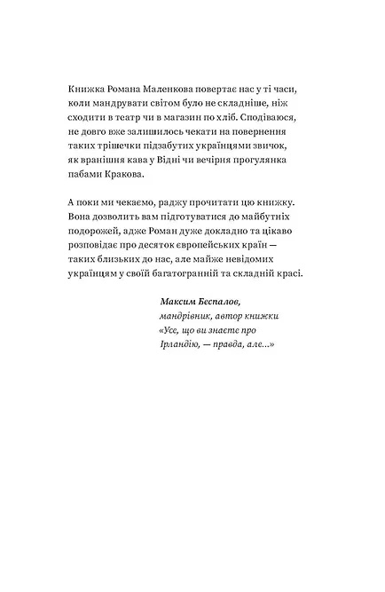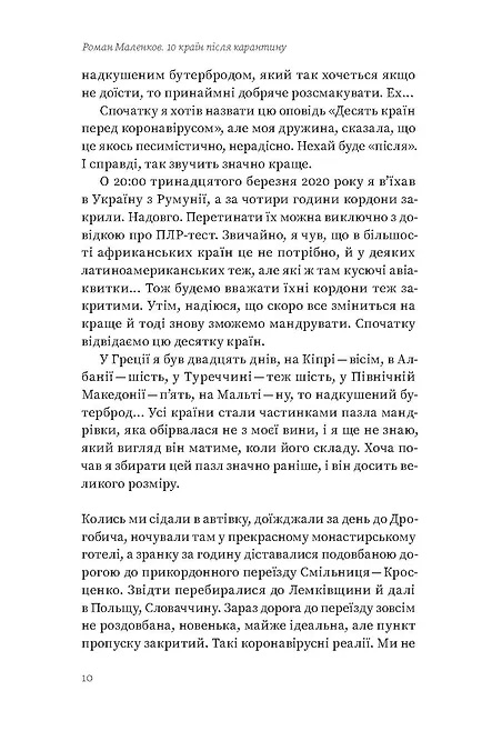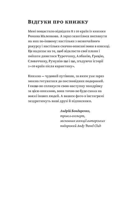 Усі ми пам’ятаємо часи, коли подорожі стали нашим новим хобі. Безвіз, лоукостери й бажання побачити світ стали драйверами цього процесу. «Рванемо у Вроцлав?», «О, є дешеві квитки в Барселону!», «Давайте на вихідні в Бонн. Більше двох днів там немає чого робити». Нам здавалося, що так буде завжди, але ні. Коронавірус перевернув світ, змінивши і те, як ми працюємо, і те, як відпочиваємо. Кордони закрилися, а подорожі стали або дуже ускладненими, або й зовсім неможливими. Та будьмо оптимістами. Маленькими кроками світ повертається до звичного життя. А отже — будуть і подорожі, планувати які можна вже зараз. Зрештою, очікування мандрів часто дарує більше ейфорії, ніж самі мандри. У цій книжці ви знайдете підказку, куди податися, щойно відкриють кордони. Географ і мандрівник Роман Маленков зібрав 10 країн, які, на його думку, варто відвідати після карантину. Перед нами постають Словаччина, Албанія, Греція, Мальта, Чехія, Туреччина й інші країни, які особливо вразили мандрівника і куди він обов’язково повернеться. Автор розповідає про свої подорожі, звертаючи увагу на місця, які варто відвідати, та речі, які обов’язково треба зробити, щоб відчути й побачити країну, а не лише поставити «пташку», що ви там були. Отже, готуймося до подорожі! Роман Маленков — мандрівник, тревелблогер, засновник краєзнавчого сайту «Україна Інкогніта» та власник однойменного туристичного оператора. Автор низки путівників по Україні. Учасник численних польових досліджень та експедицій по Україні та українських етнічних землях за кордоном: у Польщі, Словаччині, Румунії, Молдові, Угорщині. У краєзнавчій колекції автора близько тисячі населених пунктів у чотирьох десятках країн.