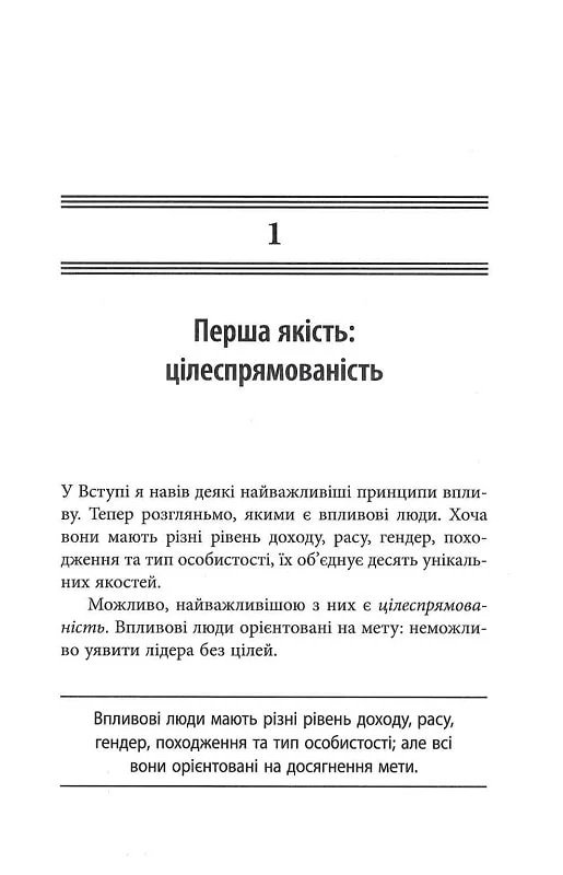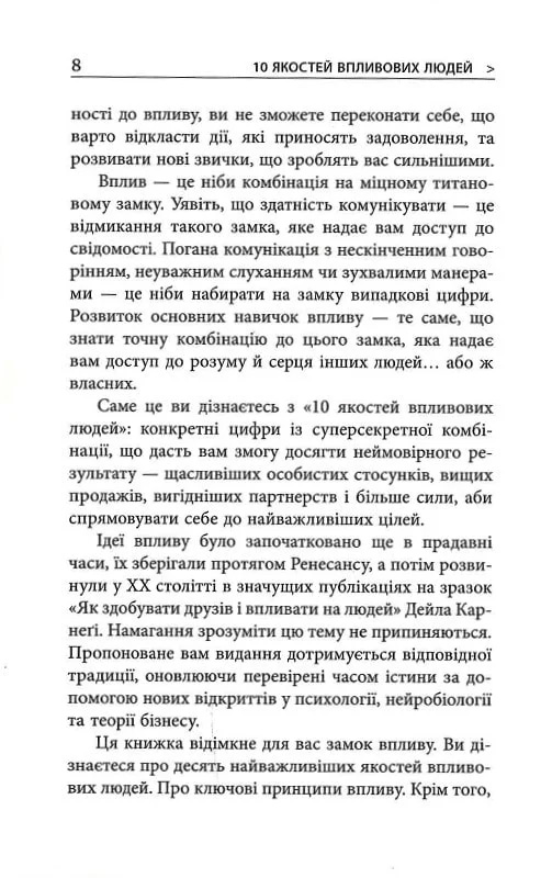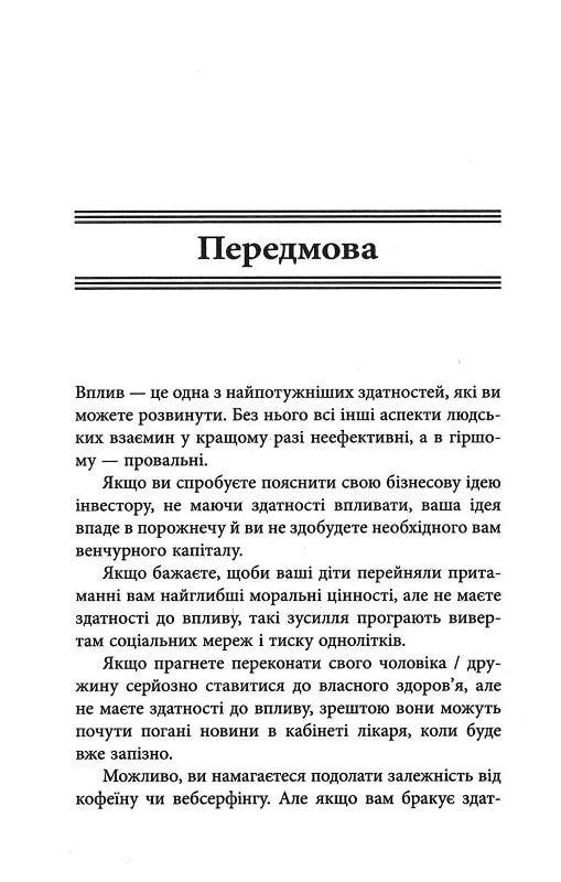 Як стати впливовим? Як навчитися переконувати себе та інших? Як зробити так, аби люди були відкритими до вашого впливу й захотіли йому піддатися? Автор багатьох бестселерів і всесвітньо відомий мотиваційний оратор Браян Трейсі поділиться секретами, що допоможуть вам спрямовувати себе до найважливіших цілей, змінювати власне життя й досягати неймовірних результатів як в особистих стосунках, так і в різноманітних сферах діяльності.