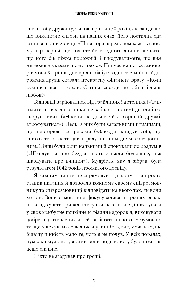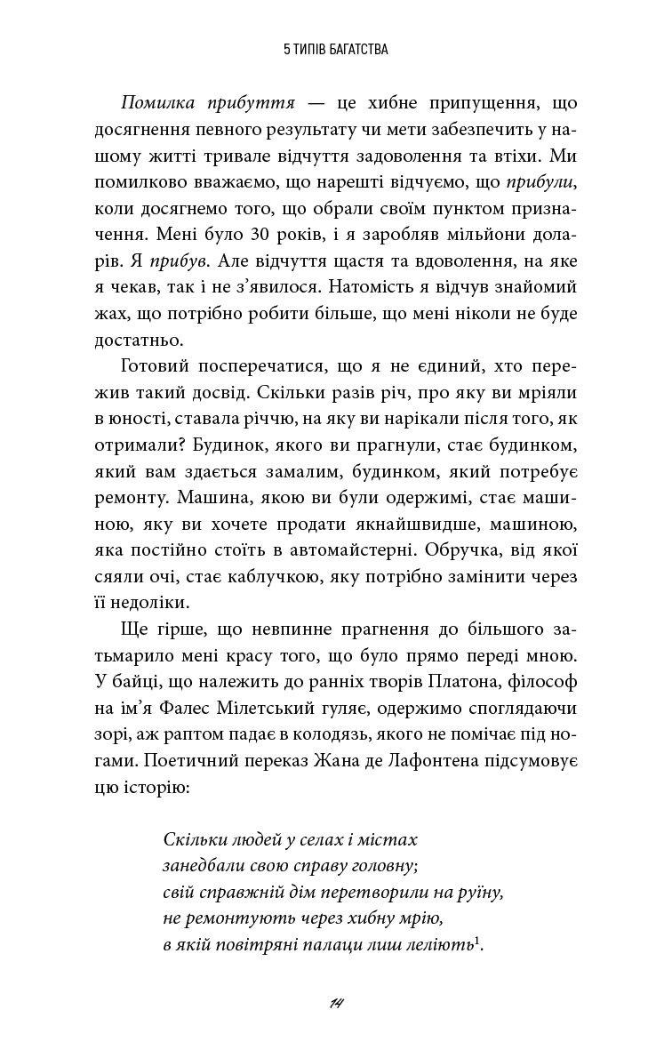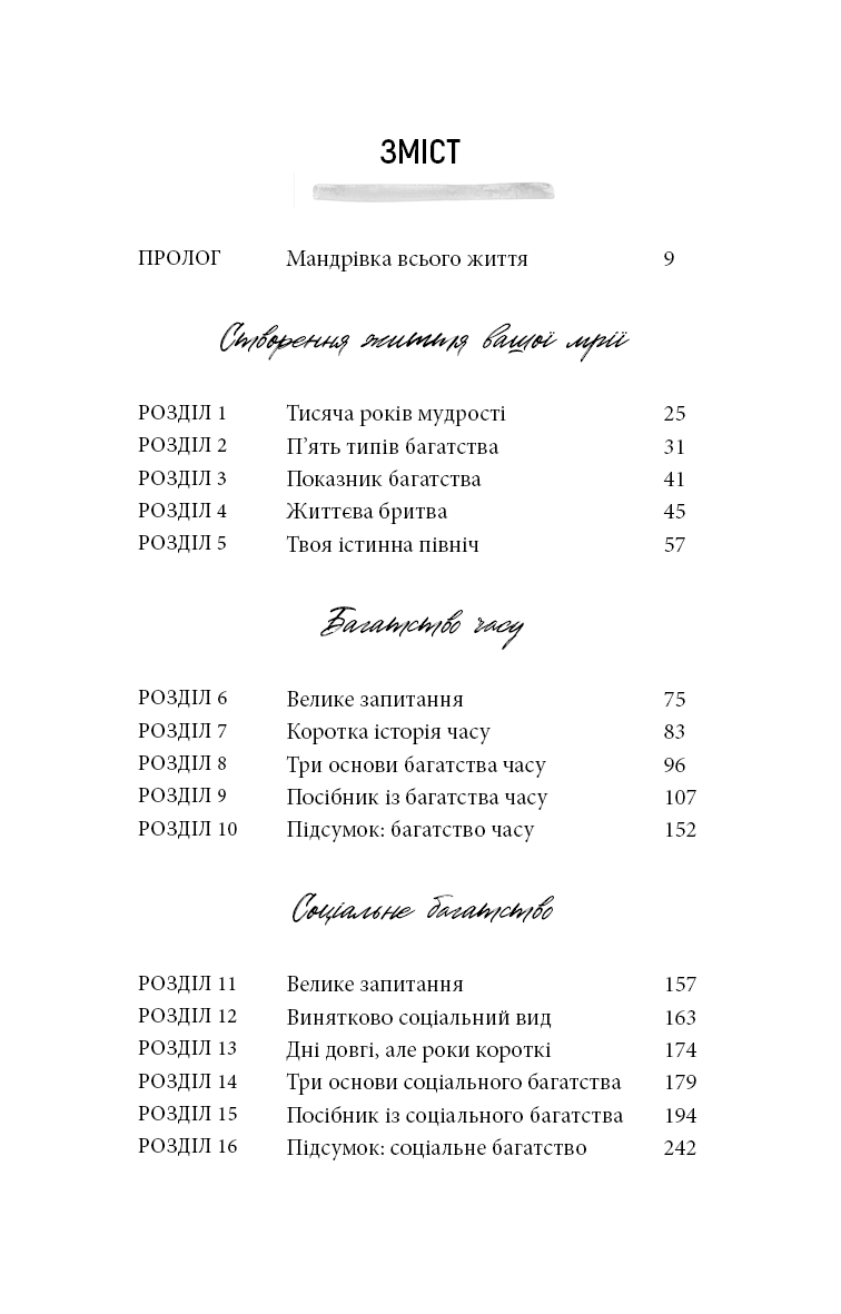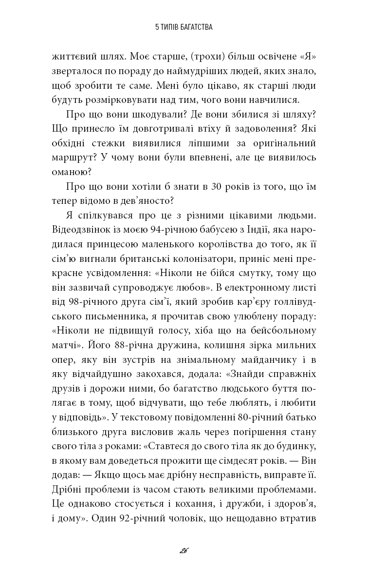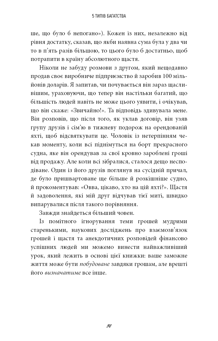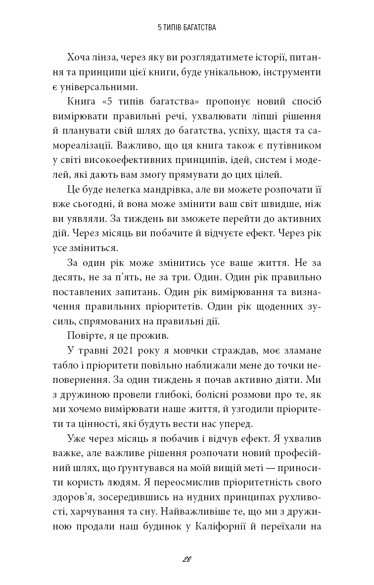 Протягом усього життя вам поступово прищеплювали думку, що гроші — це єдиний тип багатства. Насправді ваше заможне життя може бути пов’язане з грошима, але зрештою його якість визначатиметься іншим. На основі трьох років досліджень, особистих експериментів і тисяч інтерв’ю Сагіл Блум створив новаторський проєкт, який допоможе побудувати життя на основі п’яти типів багатства: багатства часу, соціального багатства, ментального багатства, фізичного багатства та, звісно, фінансового. Життя, сповнене справжнього задоволення, вимагає наявності всіх п’яти типів достатку. Незалежно від того, де ви перебуваєте на своєму життєвому шляху, поради, зібрані в цій книзі, допоможуть вам діяти відповідно до ваших пріоритетів, ухвалювати ліпші рішення й будувати життя, про яке ви завжди мріяли.