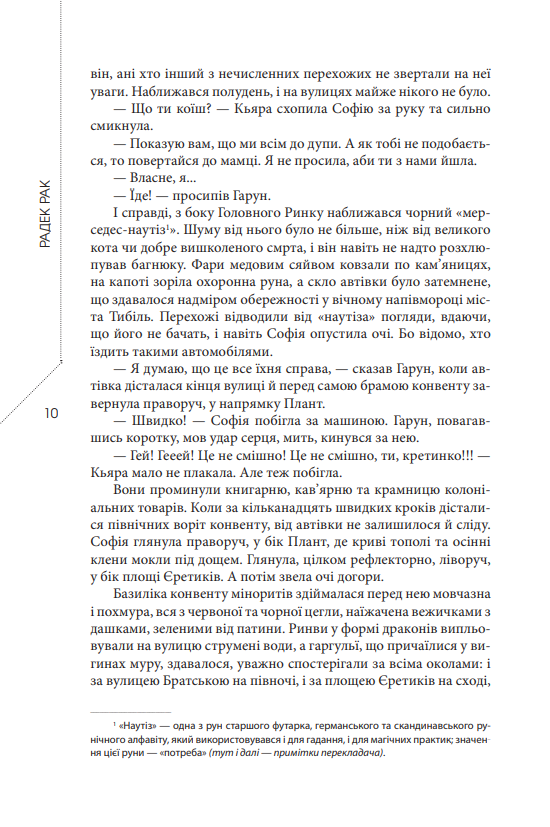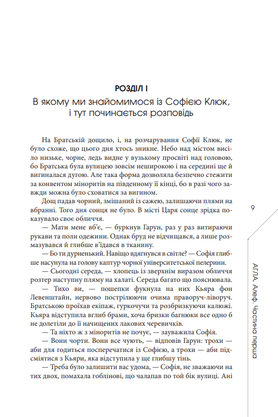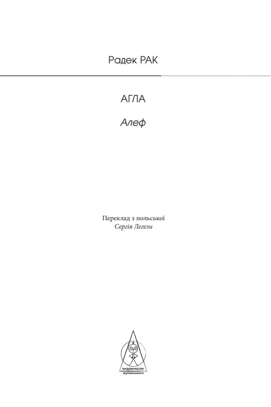 «Агла. Алеф» — перша книжка нової трилогії Радека Рака у дещо незвичному для автора жанрі химерного фентезі. Письменник створив дивний і ні на що не схожий світ, в якому переплітаються магія і найновіші наукові досягнення, де по вулицях їздять запряжені кіньми екіпажі, мчать хромовані «мерседеси» та крокують моторошні стімпанкові смрти — некротично-оживлені гібриди роботів і мертвої плоті. У цьому світі відома нам історія XIX та XX століть дивним чином видозмінюється, стаючи окремим альтернативним простором, в якому, водночас є такі знайомі нам тоталітарні режими, концтабори, революції та світові війни. Саме у цьому світі живе незвичайна дівчинка Софія Клюк, на долю якої випало надто багато випробувань, щоб вважати це простим збігом, дівчинка, яка ще сама заледве здогадується про свою винятковість, так само, як барвиста гусінь, стаючи лялечкою, заледве може здогадуватися, на кого невдовзі вона має перетворитися.