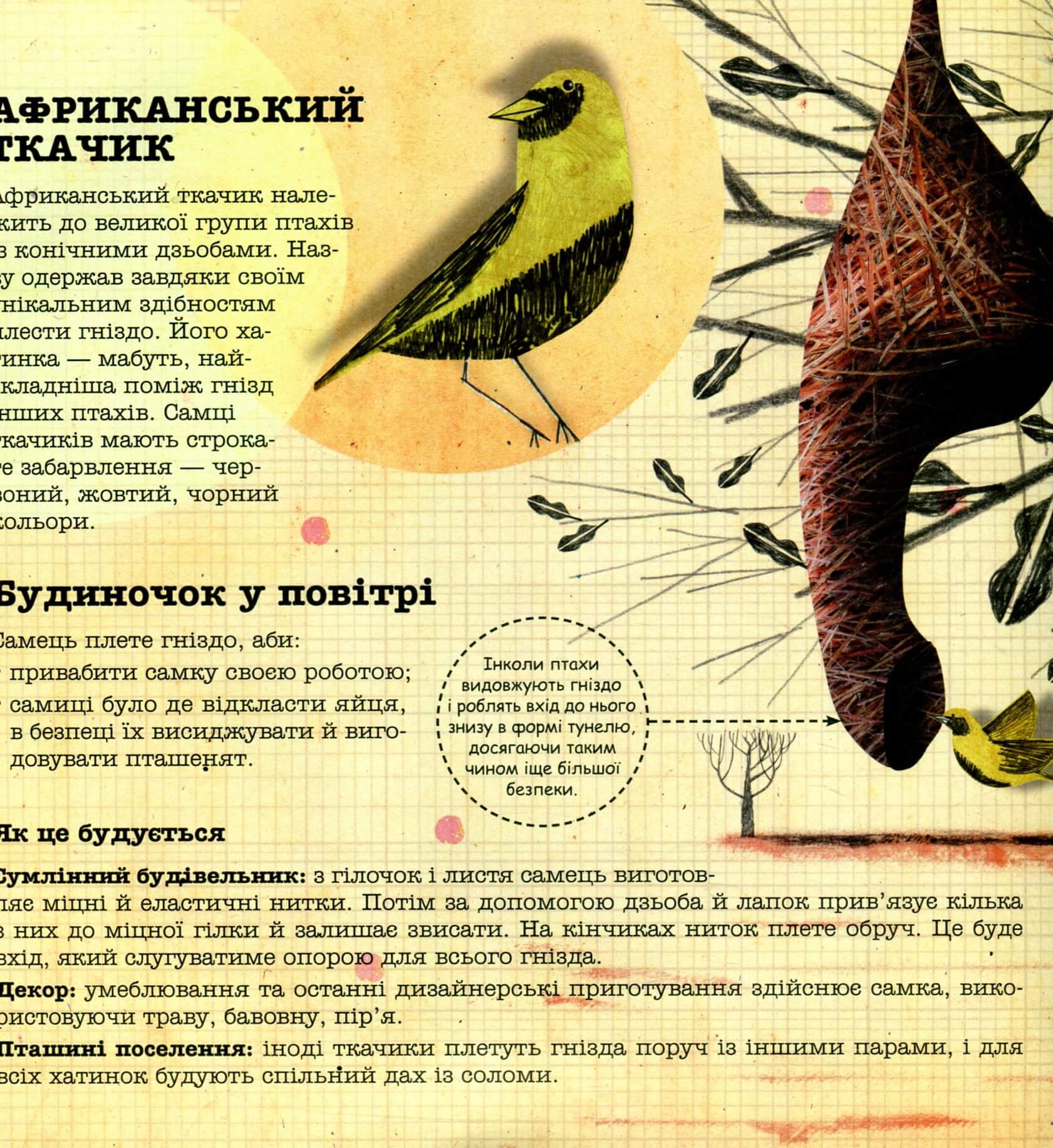 Задовго до того, як люди навчилися будувати собі житло, у природі вже існували неймовірні споруди й талановиті майстри. У цій книзі ви дізнаєтеся про 14 досконалих проектів, здійснених тваринами-архітекторами. Це надихне маленьких читачів та їхніх батьків по-новому, уважніше поглянути на світ архітектури навколо нас — і природної, і людської.