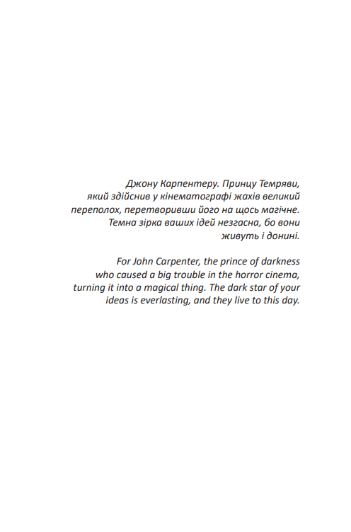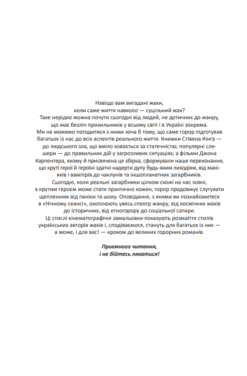 Навіщо вам вигадані жахи, коли саме життя навколо — суцільний жах? Таке нерідко можна почути сьогодні від людей, не дотичних до жанру, що має безліч прихильників у всьому світі і в Україні зокрема. Ми не можемо погодитися з ними хоча б тому, що саме горор підготував багатьох із нас до всіх аспектів реального життя. Книжки Стівена Кінґа — до людського зла, що вміло ховається за статечністю; популярні слешери — до правильних дій у загрозливих ситуаціях; а фільми Джона Карпентера, якому й присвячена ця збірка, сформували наше переконання, що круті герої й героїні здатні надерти дупу будь-яким лиходіям, від маніяків і вампірів до чаклунів та іншопланетних загарбників. Сьогодні, коли реальні загарбники цілком схожі на нас зовні, а крутим героєм може стати практично кожен, горор продовжує слугувати щепленням від паніки та шоку. Оповідання, з якими ви познайомитеся в «Нічному сеансі», охоплюють увесь спектр жанру, від космічних жахів до історичних, від етногорору до соціальної сатири.