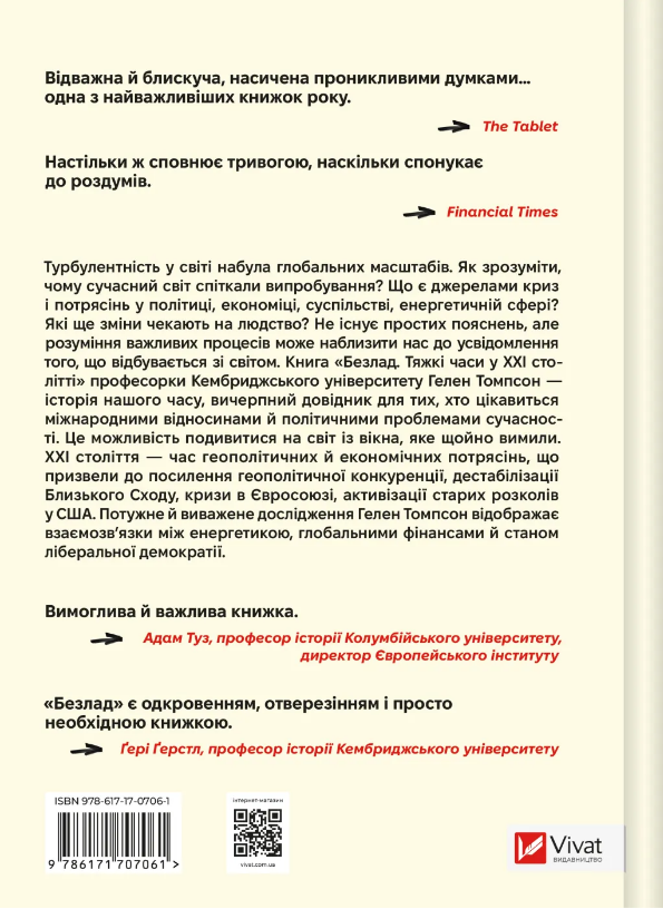 Турбулентність у світі набула глобальних масштабів. Як зрозуміти, чому сучасний світ спіткали випробування? Що є джерелами криз і потрясінь у політиці, економіці, суспільстві, енергетичній сфері? Які ще зміни чекають на людство? Не існує простих пояснень, але розуміння важливих процесів може наблизити нас до усвідомлення того, що відбувається зі світом. Книга «Безлад. Тяжкі часи у ХХІ столітті» професорки Кембриджського університету Гелен Томпсон — історія нашого часу, вичерпний довідник для тих, хто цікавиться міжнародними відносинами й політичними проблемами сучасності. Це можливість подивитися на світ із вікна, яке щойно вимили. ХХІ століття — час геополітичних й економічних потрясінь, що призвели до посилення геополітичної конкуренції, дестабілізації Близького Сходу, кризи в Євросоюзі, активізації старих розколів у США. Потужне й виважене дослідження Гелен Томпсон відображає взаємозв’язки між енергетикою, глобальними фінансами й станом ліберальної демократії.