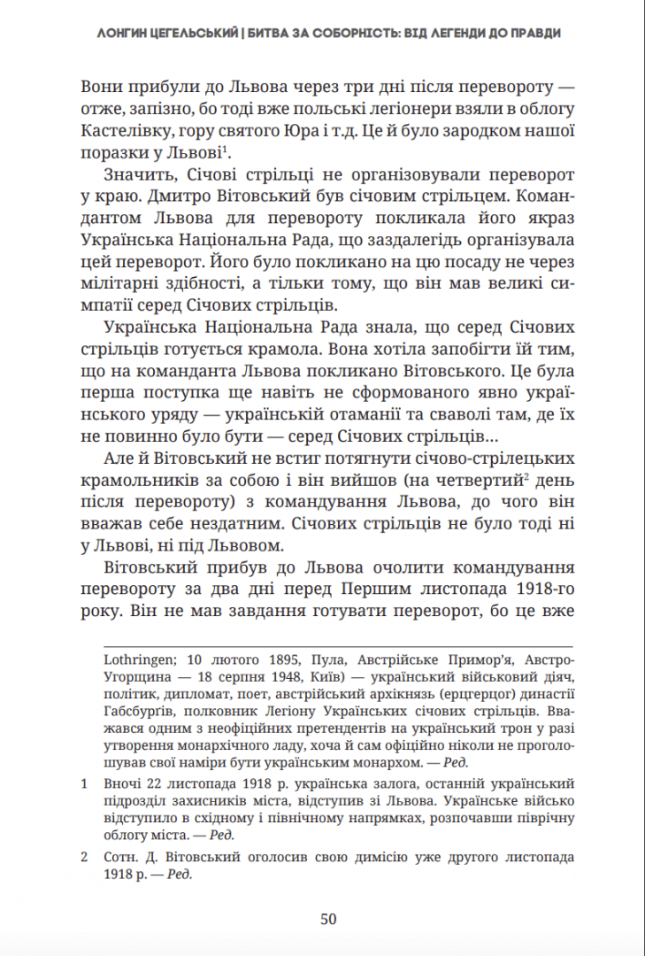 Однак перед Вами спомини Лонгина Цегельського, і тут точно сто відсотків державництва та нуль — соціалістичних експериментів. Листопадовий зрив. Бої за Львів. Хитросплетіння дипломатичних перемовин. Зустрічі з Гетьманом та Директорією. Прагнення до соборності українських земель. Спроби відкласти на потім усі внутрішні питання та протиріччя. Непримиримість щодо більшовиків. Десятки тем і сотні епізодів, що допоможуть зрозуміти, чому у 1917-1921 роках українцям не вдалося здобути власну державу на уламках двох імперій. «Битва за Соборність: від легенди до правди» — книга, що цілковито занурить у події сторічної давнини та дасть відповіді на багато питань «чому».