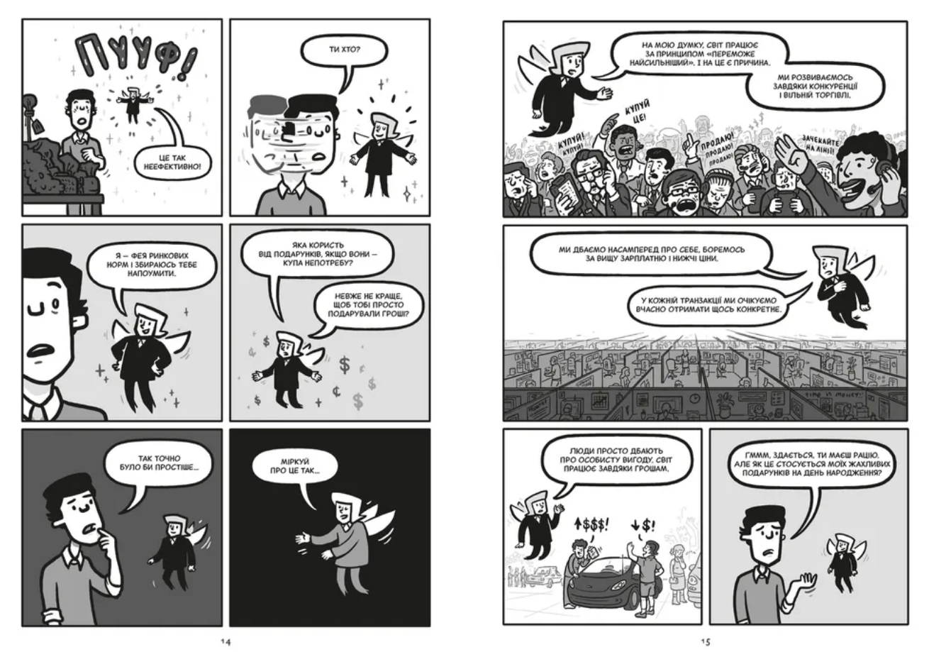 Книжка «Блискучі рішення» знайомить читача з Адамом, який щодня стикається зі шквалом вибору. На його рішення впливають два набори норм, якими керується суспільство: соціальні та ринкові. Адам у них плутається. Ці норми успішно спрацьовують у різних обставинах, проте часто обставини можна неправильно потрактувати й застосувати не той набір норм – і тоді, як нам показує Адам, халепи не уникнути. Тож він за наставництва чарівних помічників навчається виявляти та оцінювати сили, що діють у різних випадках, й ухвалювати блискучі рішення.