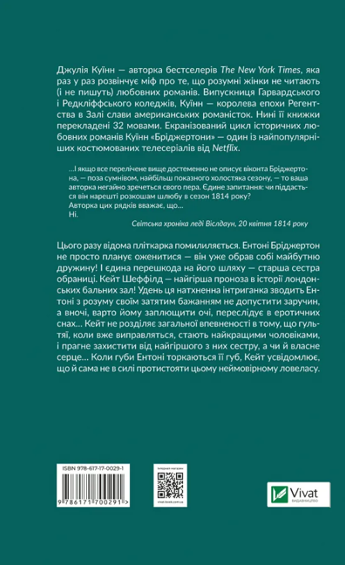 Книга «Бріджертони. Віконт, який мене кохав» — друга зі всесвітньо популярної серії «Бріджертони» американської письменниці Джулії Куїнн. Авторку не дарма називають «королевою епохи Регенства»: серія є неперевершеним взірцем передання атмосфери доби у сюжетах, що поєднують історичність, чуттєвість та соціальні теми на кшталт фемінізму й оцінки маскулінності.