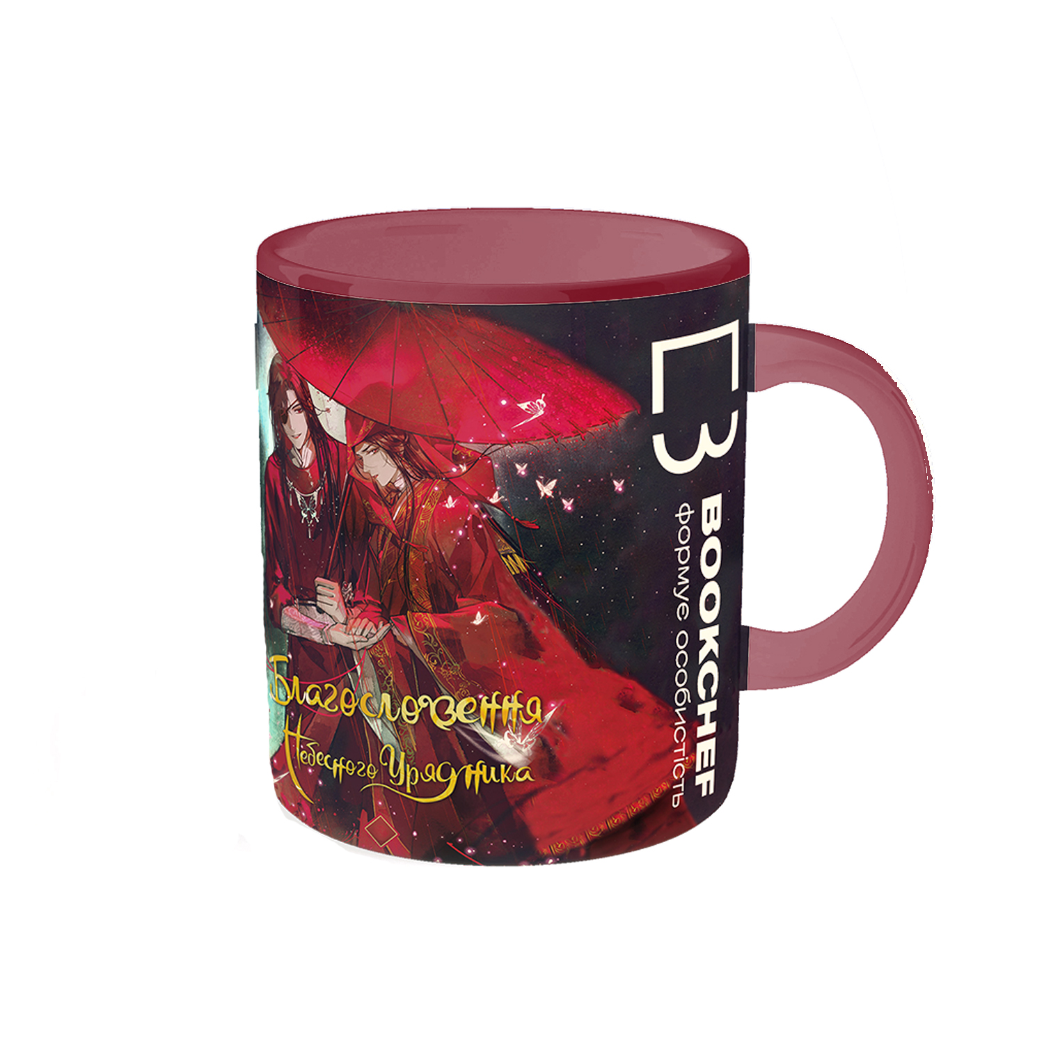 Неймовірна чашка «Благословення Небесного Урядника» – це ексклюзивний посуд червоного кольору з дизайном за однойменною книгою М. Тонсьов. Чашку прикрасили малюнком з оригінальної обкладинки ліцензійного видання, всередині вона червона. Приємно випити чаю чи кави з посуду, який нагадує про улюблених героїв: Хва Чена – харизматичного Темного Демона і Сє Ляня – благородного Наслідного Принца. Чашка виготовлена з екологічного матеріалу, має зручну ручку червоного кольору.