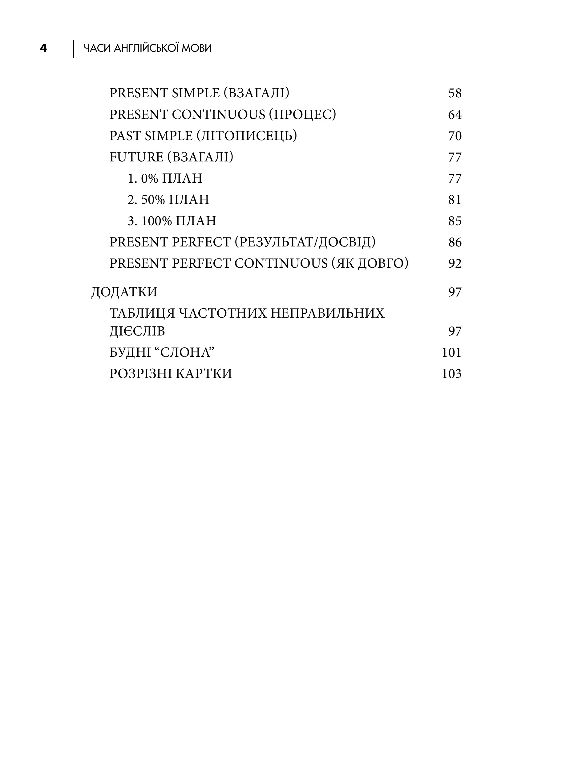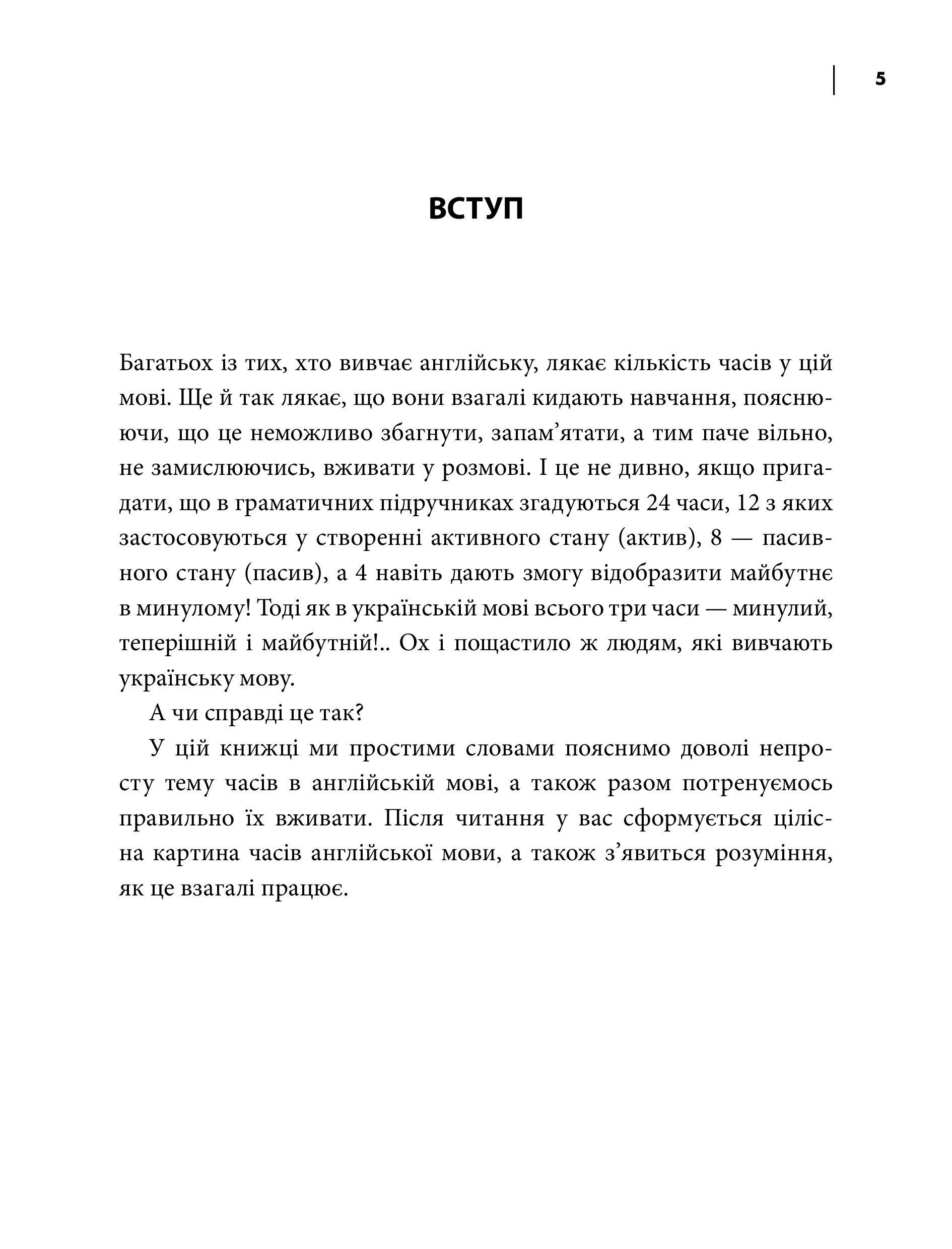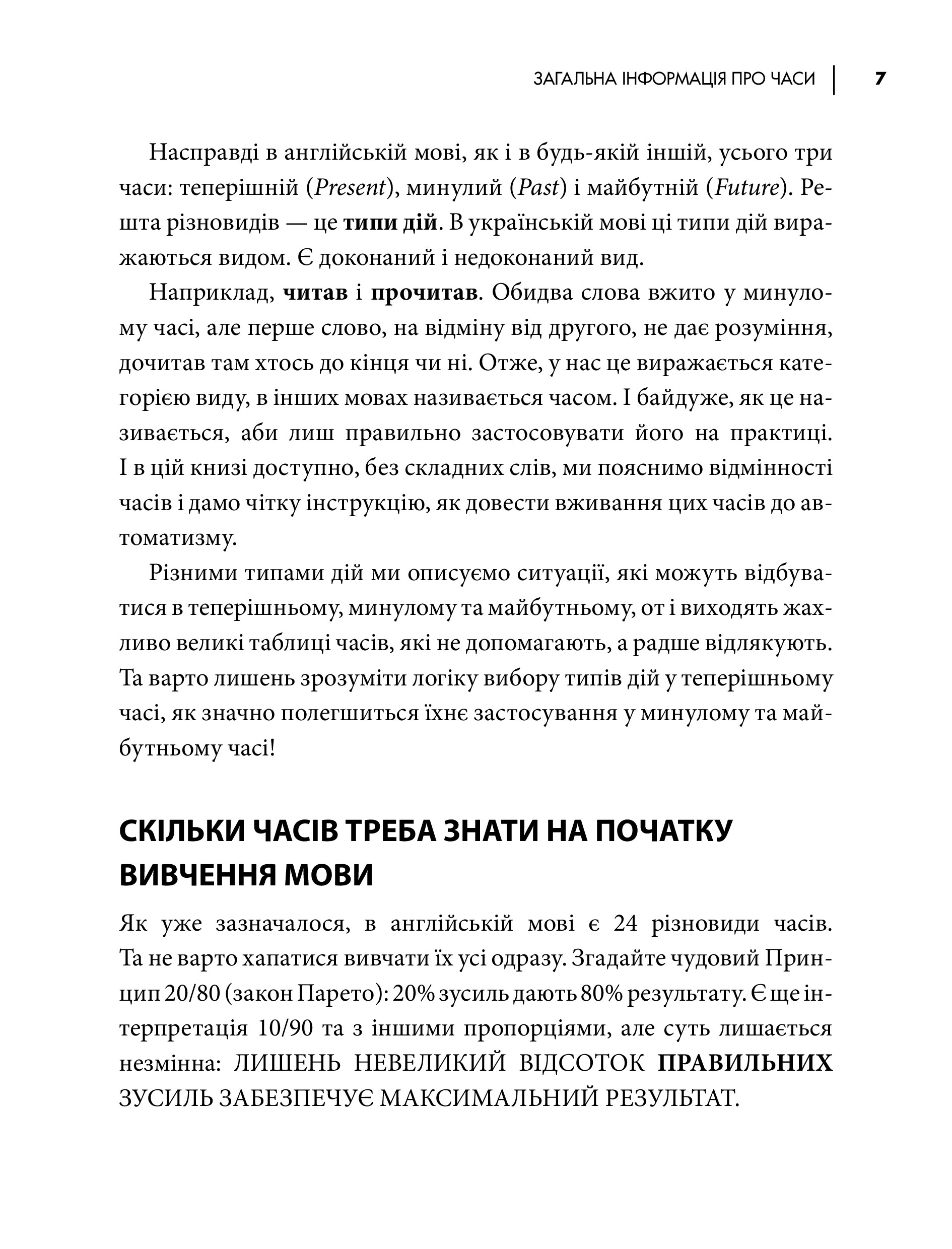 Книжка «Часи англійської мови» про те, як легко і швидко вивчити часи англійської мови. Автори знайшли простий спосіб доступно пояснити всі нюанси: скільки часів в англійській мові, які з них найпопулярніші і як їх застосовувати не замислюючись. Книжка зацікавить як новачків, так і читачів зі знанням англійської середнього рівня. Читачі швидко опанують тему, знайдуть багато корисних фішок та легко зрозуміють логіку утворення часів. Також ця книжка буде корисна і для викладачів, адже в ній докладно описані цікаві техніки, які можна застосовувати на заняттях.