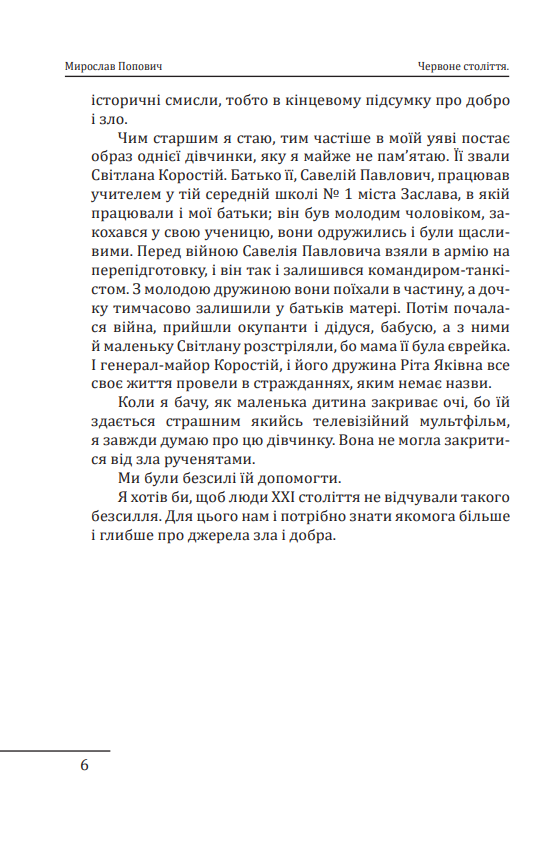 Книга «Червоне століття» — за словами автора — це «спроба жанру філософії історії». Мирослав Попович написав книгу на основі історії європейської цивілізації XX століття. «Найбільші таємниці минулого століття не стільки у важливих деталях подій, історичній інтризі та прихованих стратегіях боротьби могутніх політичних сил, скільки у правильному розумінні й тлумаченні сенсу історичних явищ», — казав він.