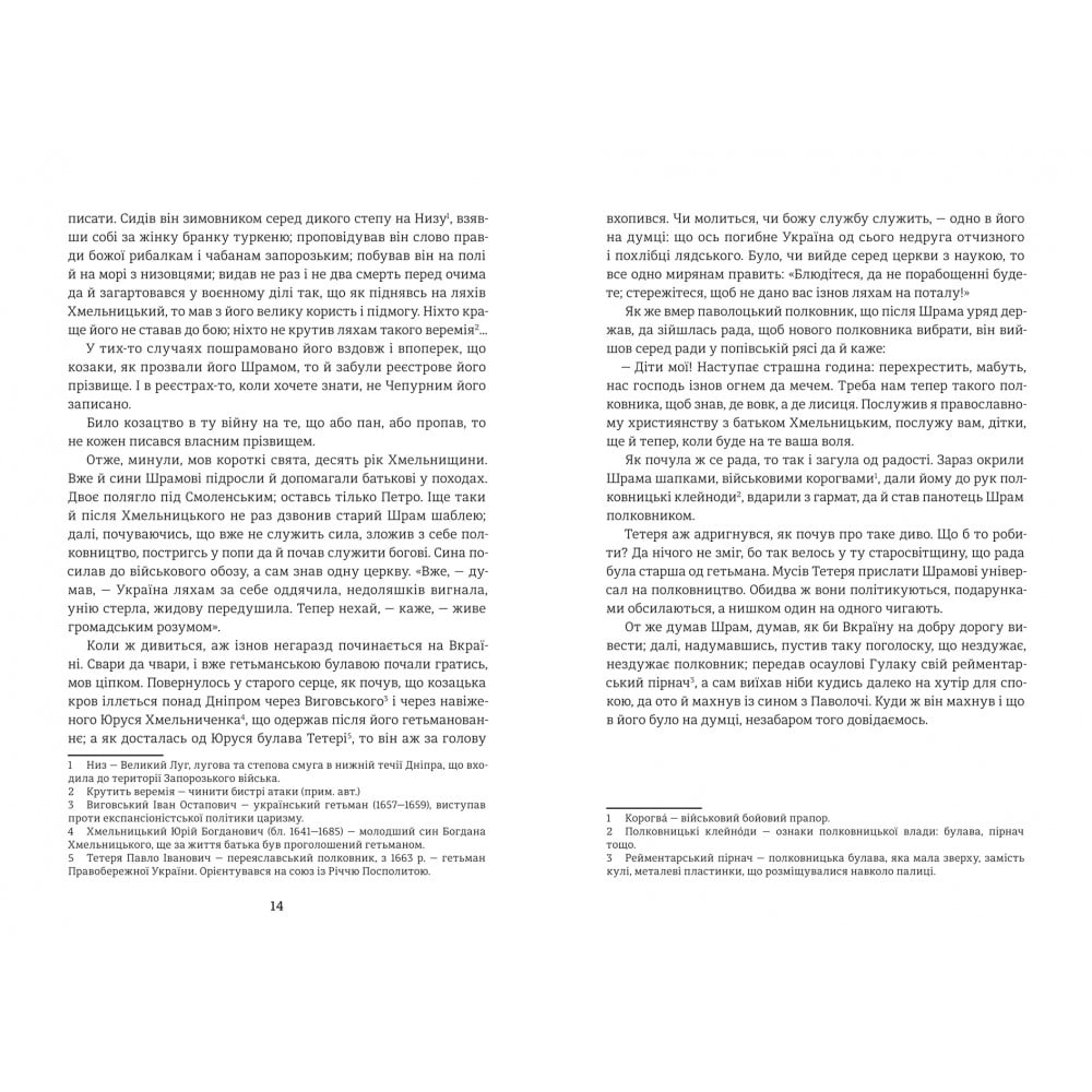 Перший історичний роман-хроніка, що розповідає про розкол України на дві частини після проведення Чорної ради в Ніжині 1663 року. Країна була фактично розділена на Лівобережну і Правобережну, що спровокувало запеклу боротьбу за гетьманську булаву після смерті Богдана Хмельницького.