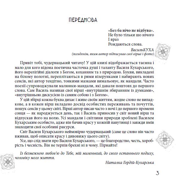 Що ми залишаємо після себе? Ця книга — не просто збірка віршів. Це інтимний світ Василя Кухарського, зафіксований у словах, світлинах та сенсах. Тут, на сторінках, живуть Його усмішки й сум, вагання та любов, жарти й війна, ніжність і невловима істина, а понад усе — пристрасть до життя та кохання. Його вірші народжувалися вночі й відлітали у світ із першим променем сонця. Кожне слово, кожен знімок наповнені сутністю ВасіКуха — живою, справжньою, нефальшивою. Все тут дихає Ним.
