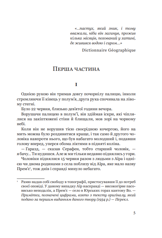 У найпопулярнішому творі класика франкомовної швейцарської літератури (1878–1947) ідеться про одну з наймасштабніших природних катастроф, боротьба з якими великою мірою сформувала національний характер швейцарців: оповзень у гірській долині, що поховав під камінням чимало людей і худоби. Автор поетично змальовує могутню красу альпійської природи, сповнене забобонів життя селян і непереможну силу жіночої любові, яка допомагає долати посттравматичний синдром.