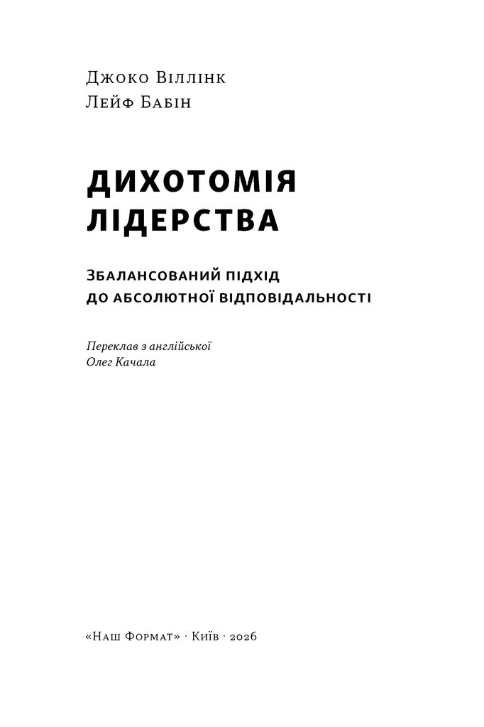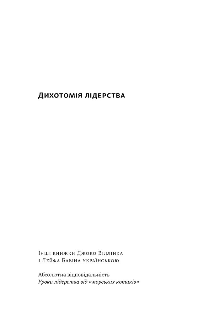 Понад три мільйони читачів книжки «Абсолютна відповідальність» та близько 1600 компаній навчилися застосовувати уроки лідерства від Джоко Віллінка та Лейфа Бабіна. У своїй новій праці автори ще глибше занурюються в найскладніший аспект керівництва людьми: дихотомію лідерства.