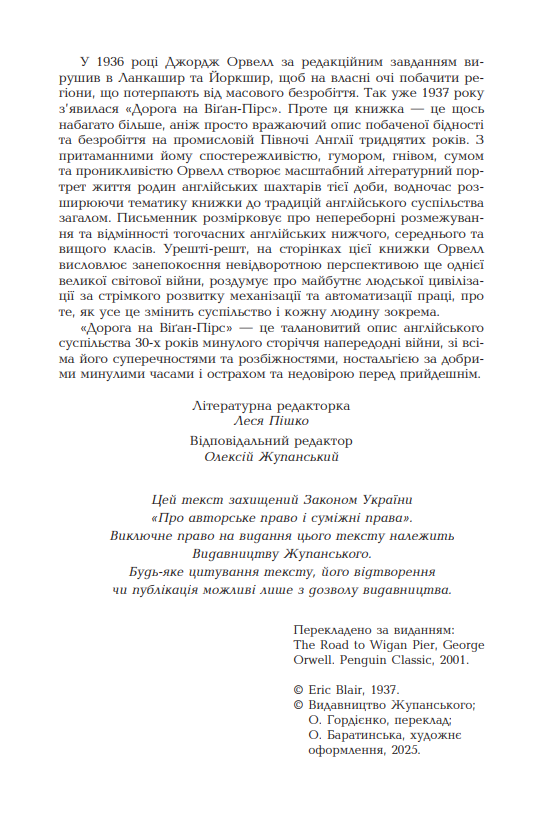 На тлі цих відомих творів для багатьох читачів, на жаль, і досі залишається в тіні інший доробок письменника, зокрема його книжка «Дорога на Віґан-Пірс» (1937 р.), в якій Орвелл ділиться власними спостереженнями про життя регіонів промислової Півночі Англії, що у тридцятих роках минулого сторіччя потерпали від бідності та масового безробіття. Описуючи у своїй блискучій і пронизливій авторській манері побут представників найбідніших класів тогочасної Англії, Орвелл водночас йде набагато далі за початковий формат репортажистики і розмірковує про нездоланні суперечності та бар’єри, що розділяють традиційне англійське суспільство, про загрозу тоталітаризму та Другої світової війни, тінь якої все виразніше здіймається над сучасним йому світом, і навіть торкається питань футурології, роздумуючи про зміни, які в майбутньому чекають на людей і суспільство загалом.