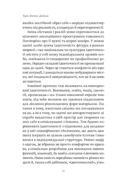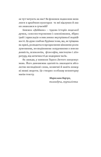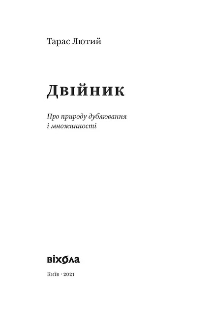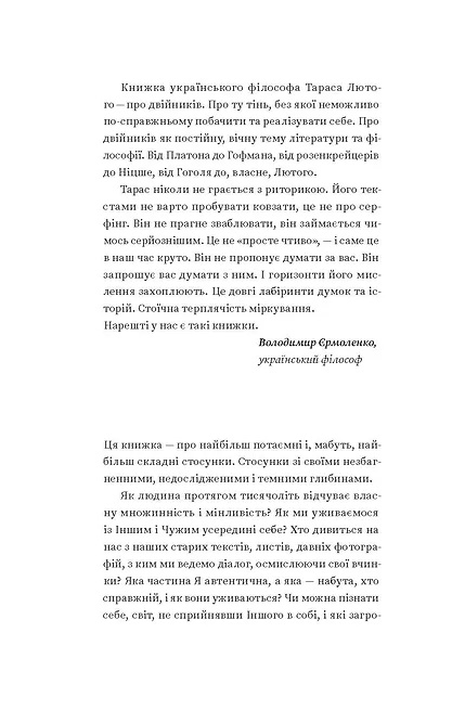 Тарас Лютий — філософ, письменник, колумніст та музикант. У нарисах, які увійшли до книги, Тарас аналізує феномен двійників у мистецтві, літературі та міфології.