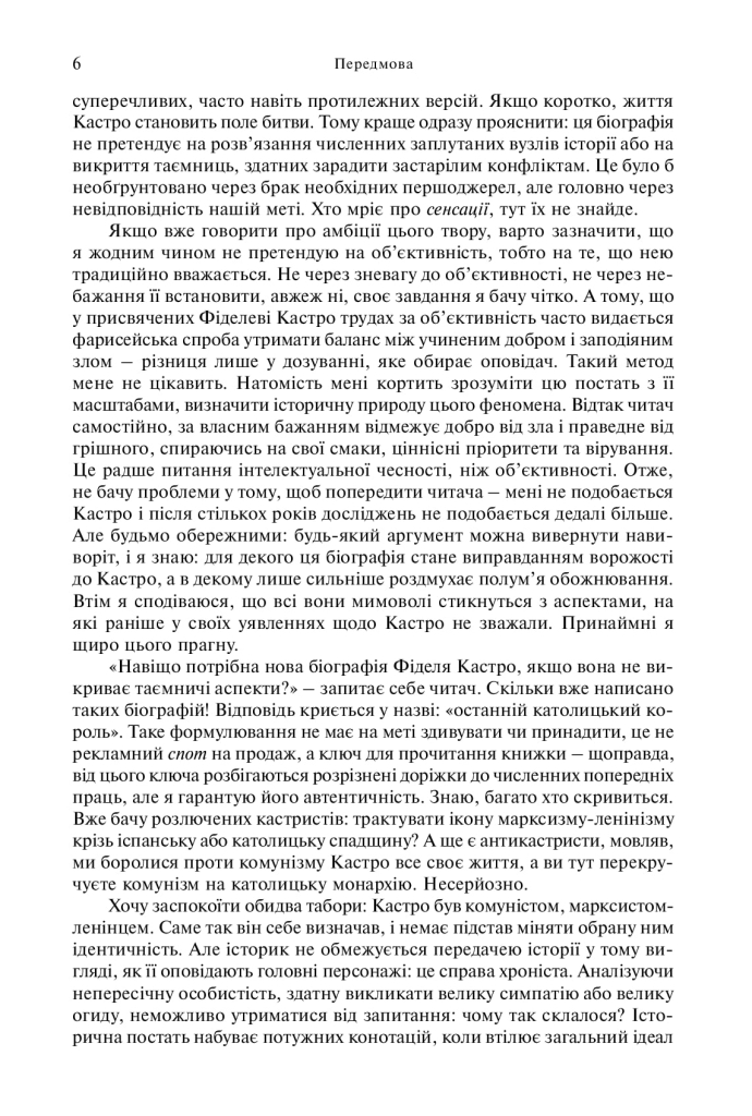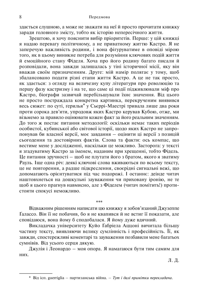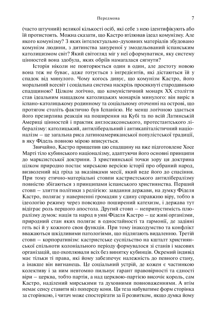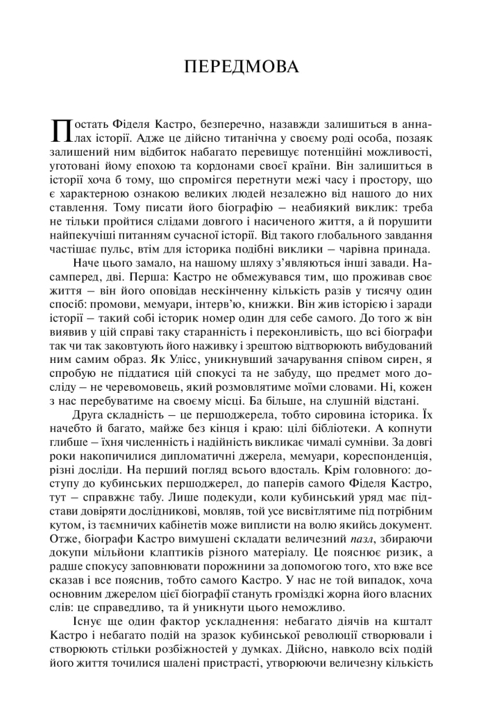 За шкалою народної любові Фідель Кастро до сьогодні викликає весь спектр почуттів: від абсолютного обожнювання до пекучої ненависті. 90 років життя, з яких півстоліття він очолював Кубу, постають перед нами справжнім полем битви, приз в якій – визволення людства від гріха егоїзму та споживацтва. Лоріс Дзанатта пропонує нам унікальний погляд на цю історичну постать та її вплив на Кубу. «Фідель в ім'я досконалості виправдовував найбрутальніші засоби, в ім'я миру й любові розв'язував війни та сіяв ненависть, а заради абстрактного спасіння душ приніс у жертву свободу особистості». Незалежно від того, на якій відмітці шкали прихильності до кастризму знаходиться читач, ця книга дозволить побачити Фіделя Кастро у світі реального життя, не оповитого міфологією ідолопоклонства чи, навпаки, іконоборства.