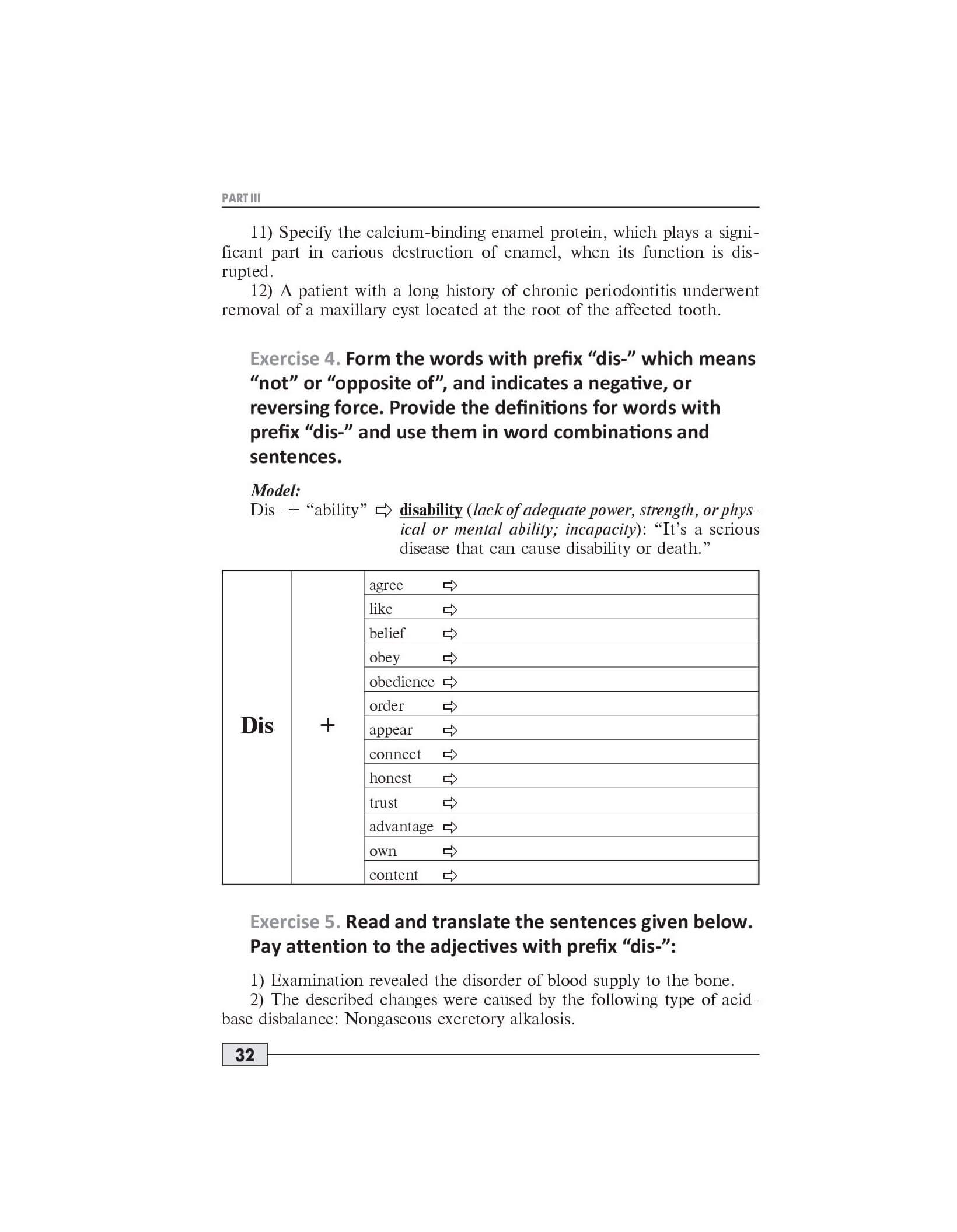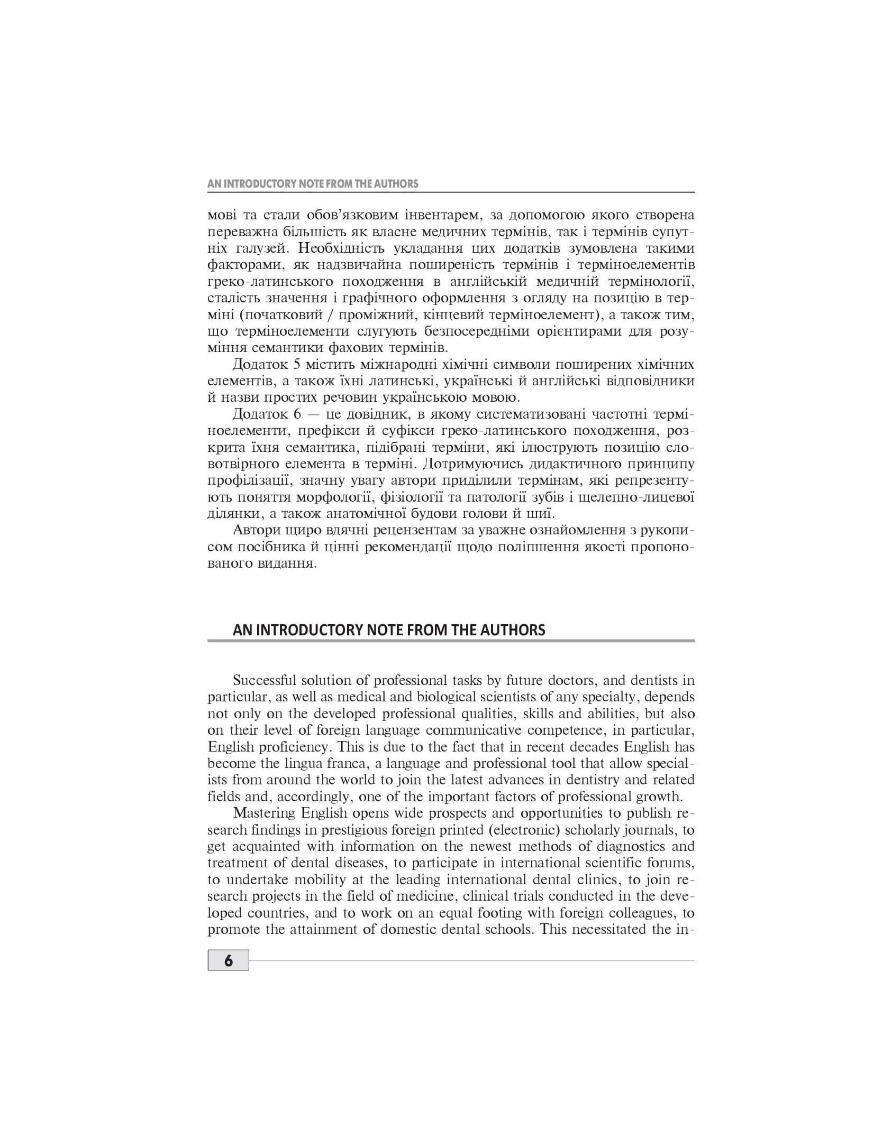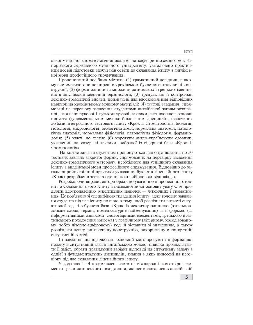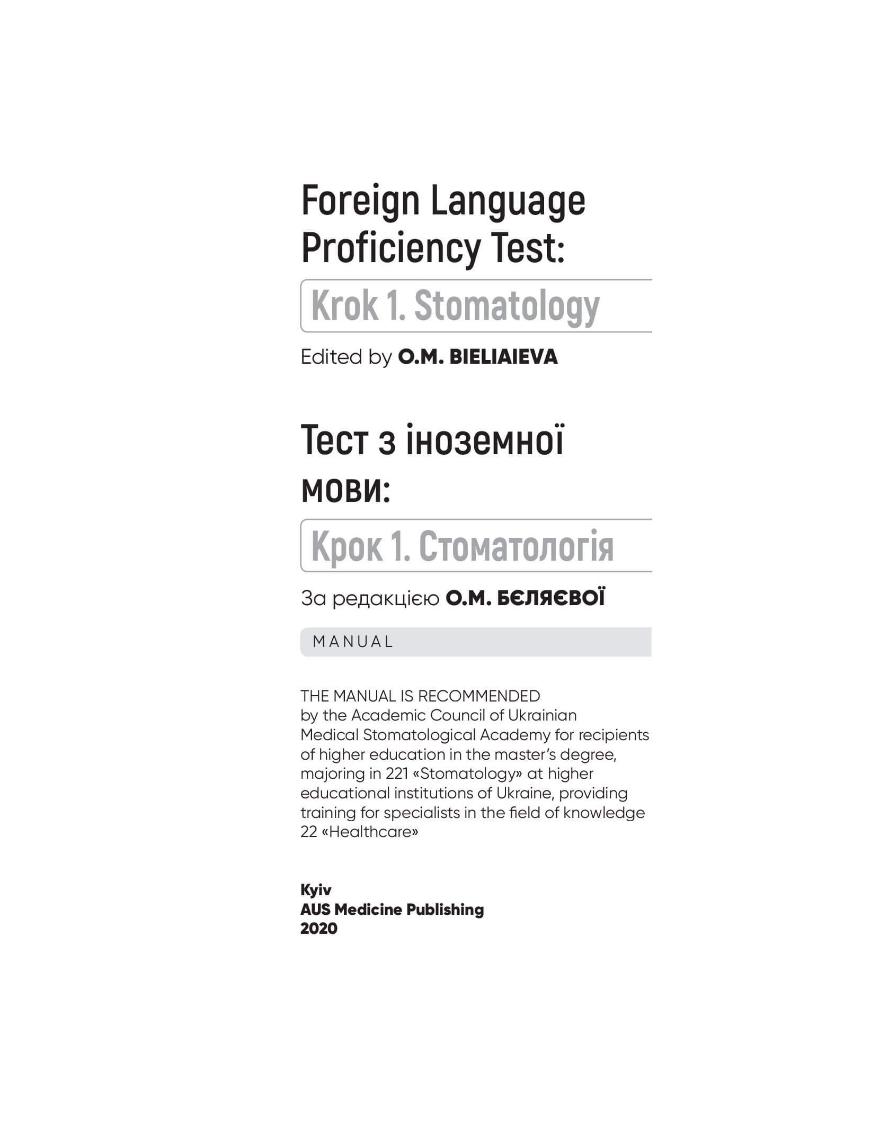 The manual presents materials for classroom and extracurricular preparation for examination in the English language for professional purposes, which is a part of the first stage of the USQE for recipients of higher education in the field of knowledge 22 «Healthcare»: a grammar reference book, which systematizes the syntactic constructions widely used in the «Krok 1. Stomatology» booklets; training and control lexical and grammatical exercises designed to improve relevant skills in the «Krok 1» linguistic material; test tasks; keys for tests; a short English-Ukrainian dictionary; 6 appendixes. For recipients of higher education at the second (master’s) level and academic staff of higher educational institutions, providing training for specialists in the specialties 221 «Stomatology».