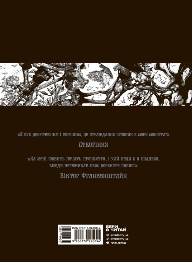 Гортаючи сторінку за сторінкою, вбираючи кожну деталь, читачі занурюються в загадковий і моторошний світ дослідів доктора Франкенштайна, спостерігають, як прекрасні таємниці життя, небес і землі перетворюють існування самого Віктора та його Створіння на жах у безнадійній самотності й темряві…