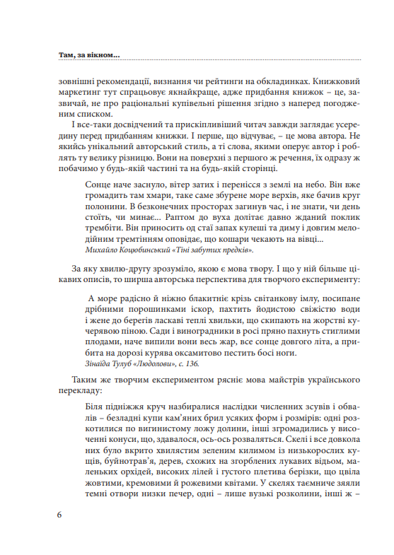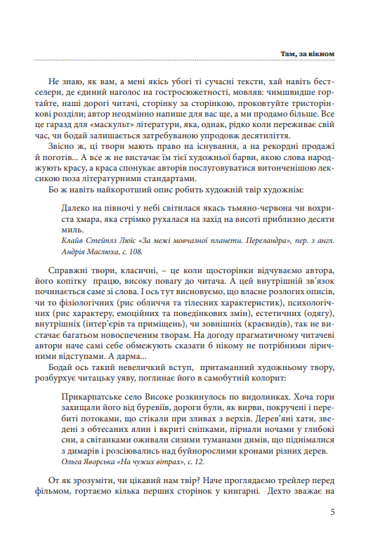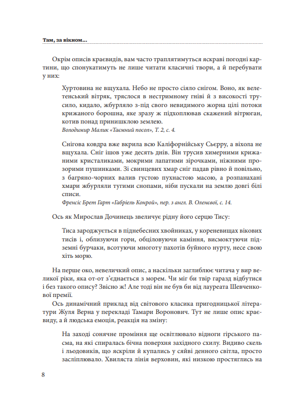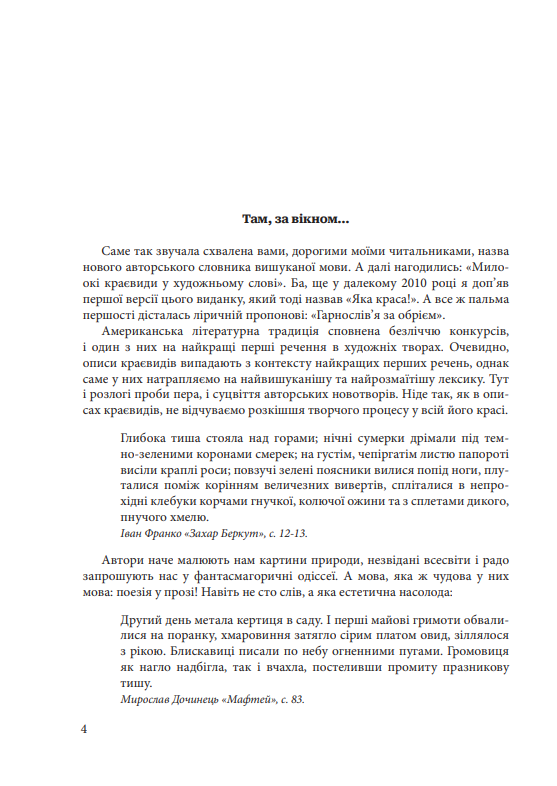 Словник охоплює розмаїту палітру вишуканих слів у барвистих описах краєвидів майстрами художнього пера. Автор опрацював 204 джерела української та світової прози, аби поділитися з читачами словесними перлинами далеко за обрієм нашого побутового мовлення.