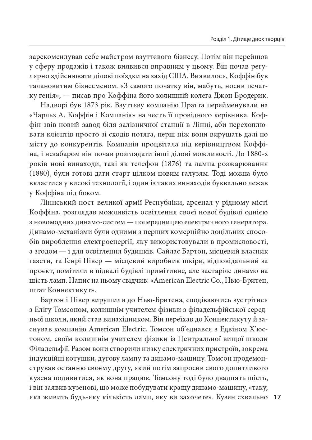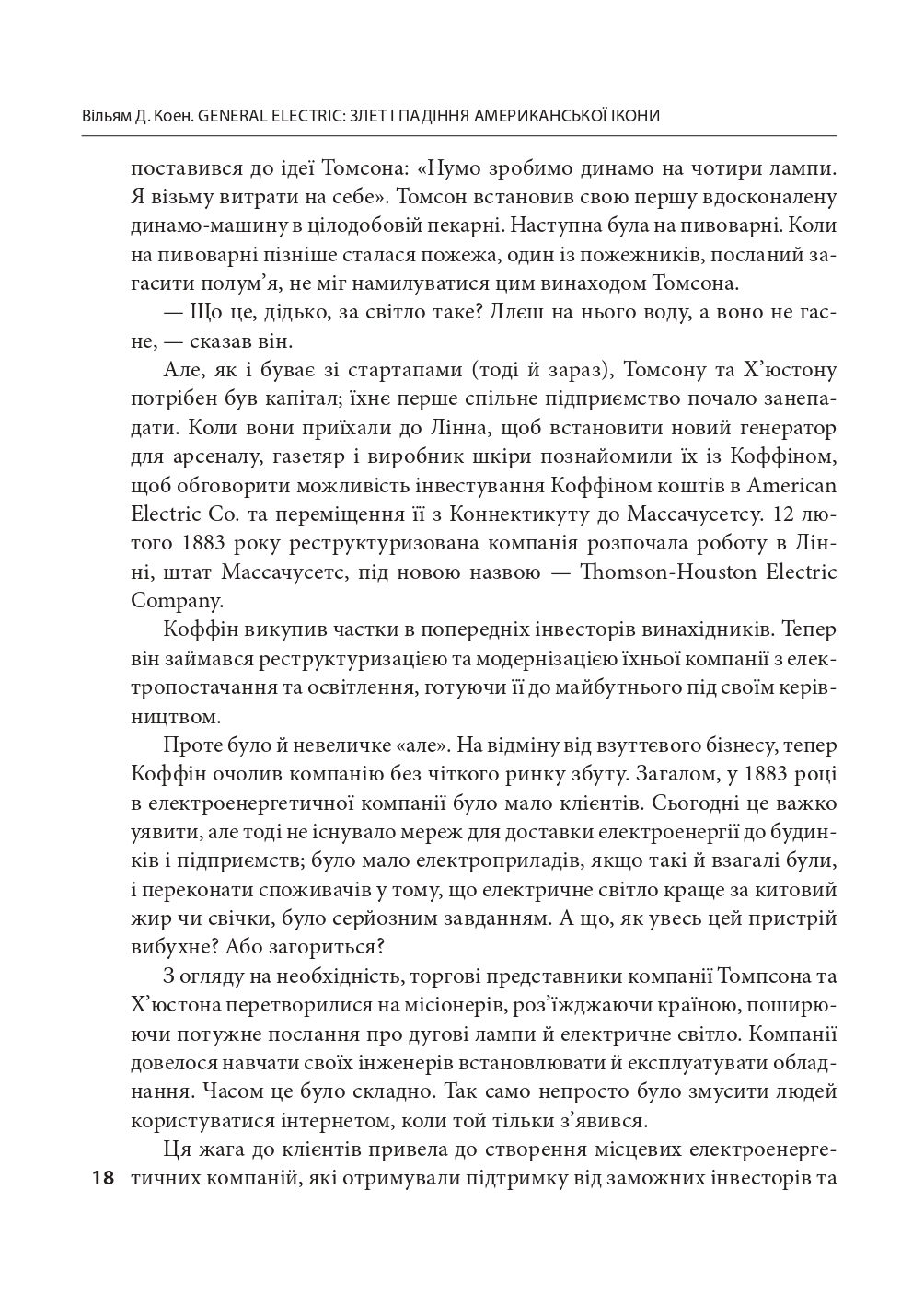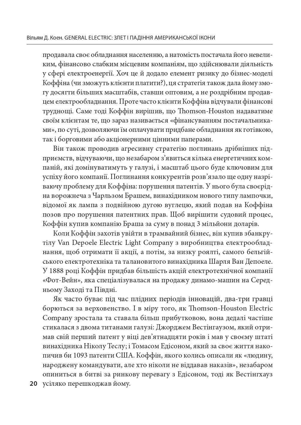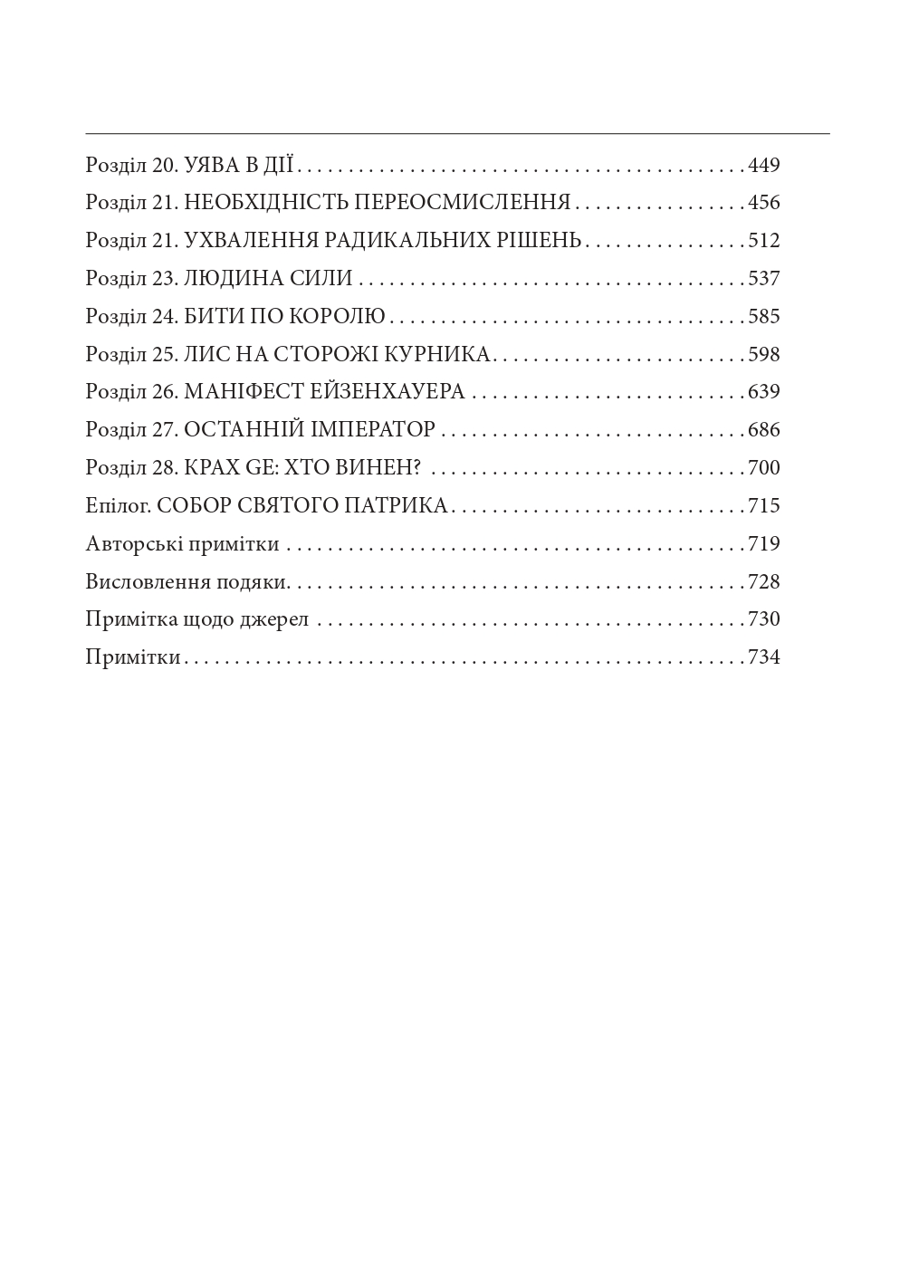 Книга досвідченого американського фінансового журналіста Вільяма Д. Коена, яка є одним із бестселерів 2022 р., висвітлює дивовижну історію неабиякого злету й неймовірного падіння найвідомішої корпорації США — General Electric. Саме їй ми завдячуємо появою та втіленням багатьох винаходів, які сьогодні сприймаємо як належне, — від електричної лампочки до реактивного двигуна. На основі документальних відомостей про майже 130-річну діяльність компанії та ексклюзивних інтерв’ю з ключовими постатями її золотої ери в книзі досліджено глибини легендарної культури управління GE. Це приголомшлива розповідь про амбіції, зарозумілість, егоїзм та ворожнечу, які зруйнували колись видатну компанію. Автор стверджує, що спадщина GE є водночас зразком і застереженням, за допомогою яких можна зрозуміти Америку ХХ століття.