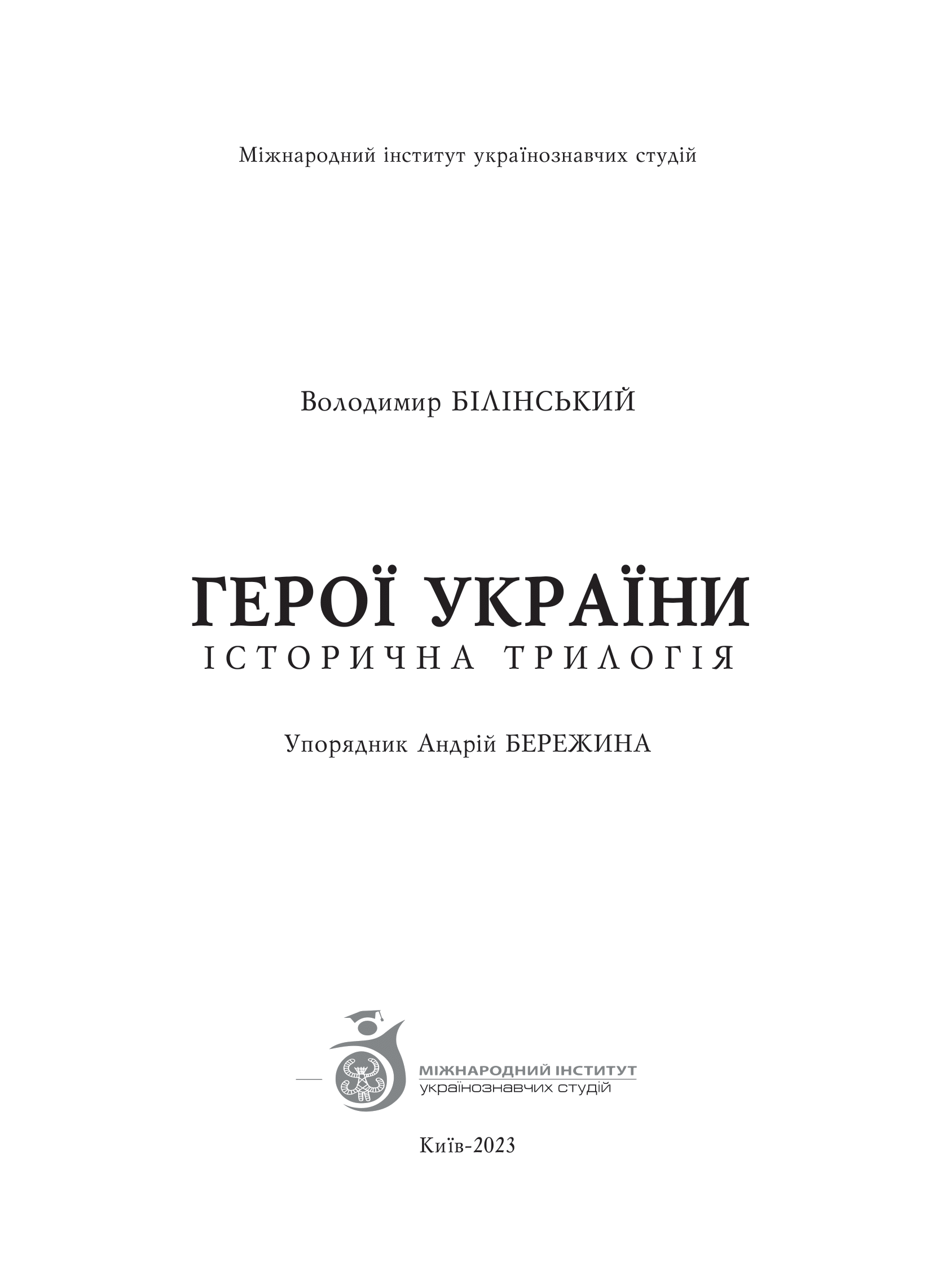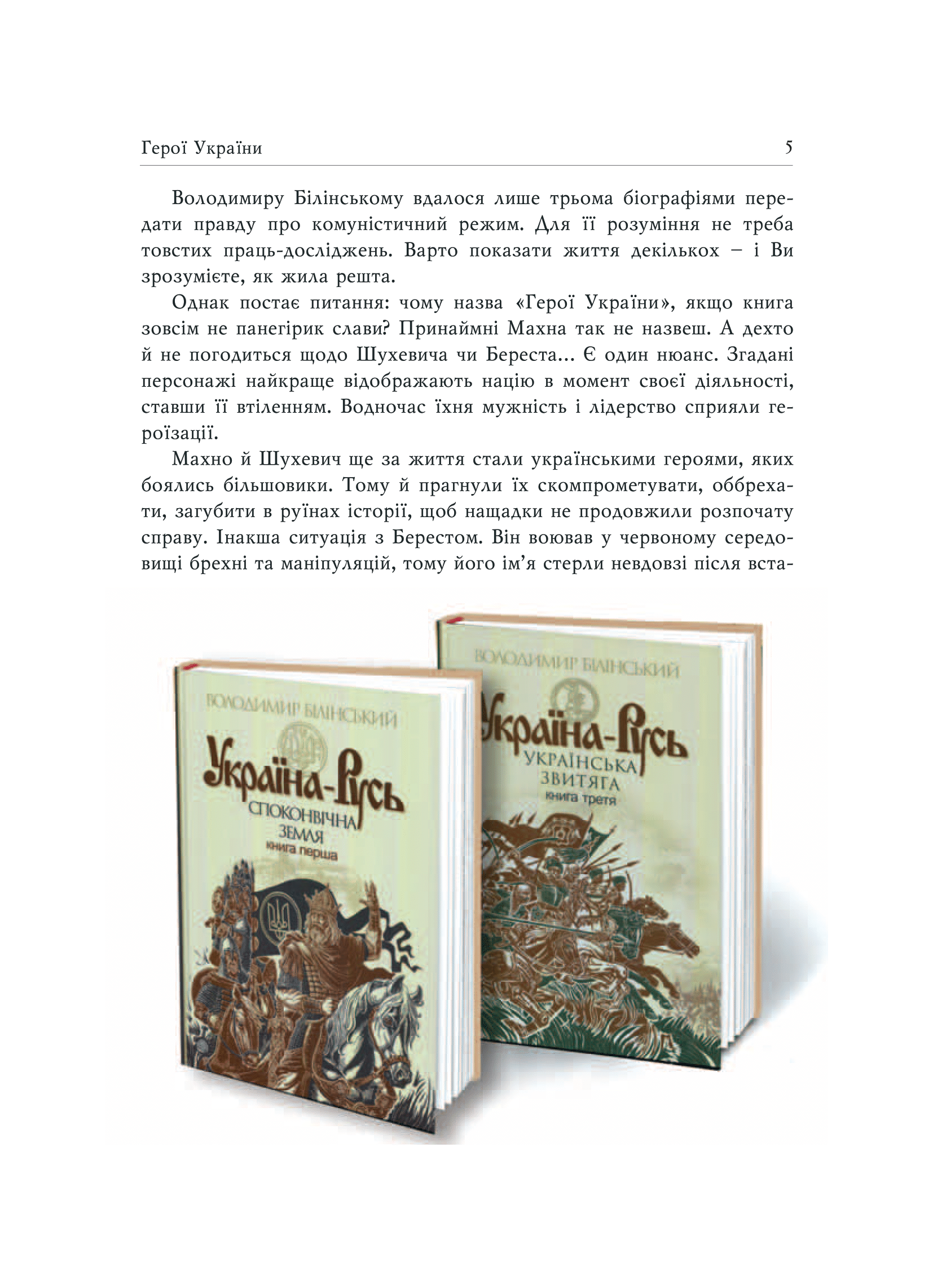 В історичній трилогії «Герої України» автор розвінчує упереджену фальсифікацію біографій Нестора Махна, Романа Шухевича та Олексія Береста московською тоталітариною системою. У книзі також публікується автобіографічний розділ автора.