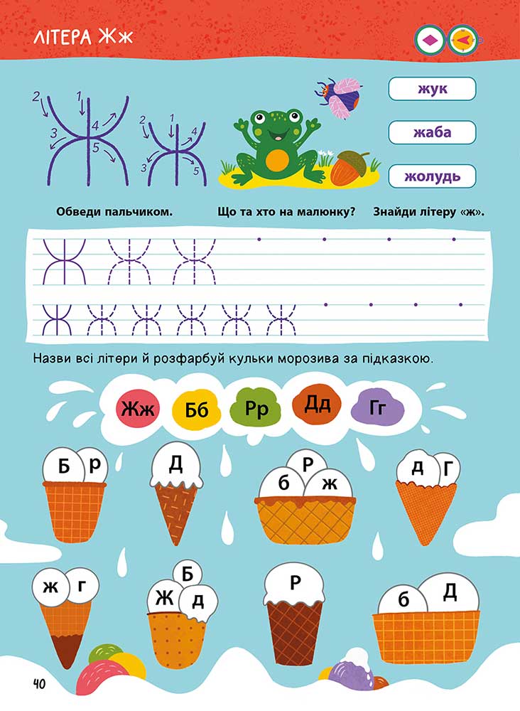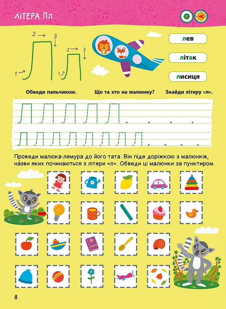 Завдяки цій яскравій збірці завдань дитина не лише вивчатиме літери, а й одразу ж застосовуватиме набуті знання: вчитиметься писати літери, складатиме їх у склади і, зрештою, прочитає свої перші слова. Вправи в книжці розміщені в порядку ускладнення, тож крок за кроком дошколярик засвоїть увесь необхідний матеріал.