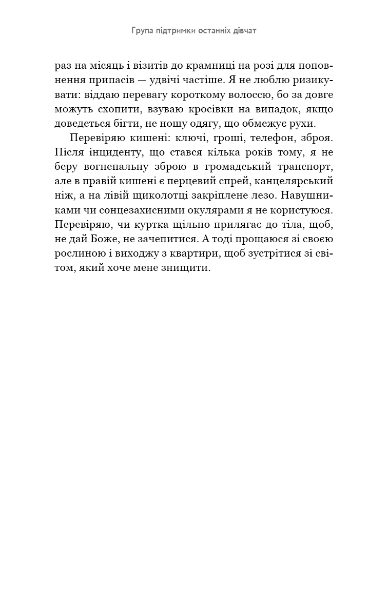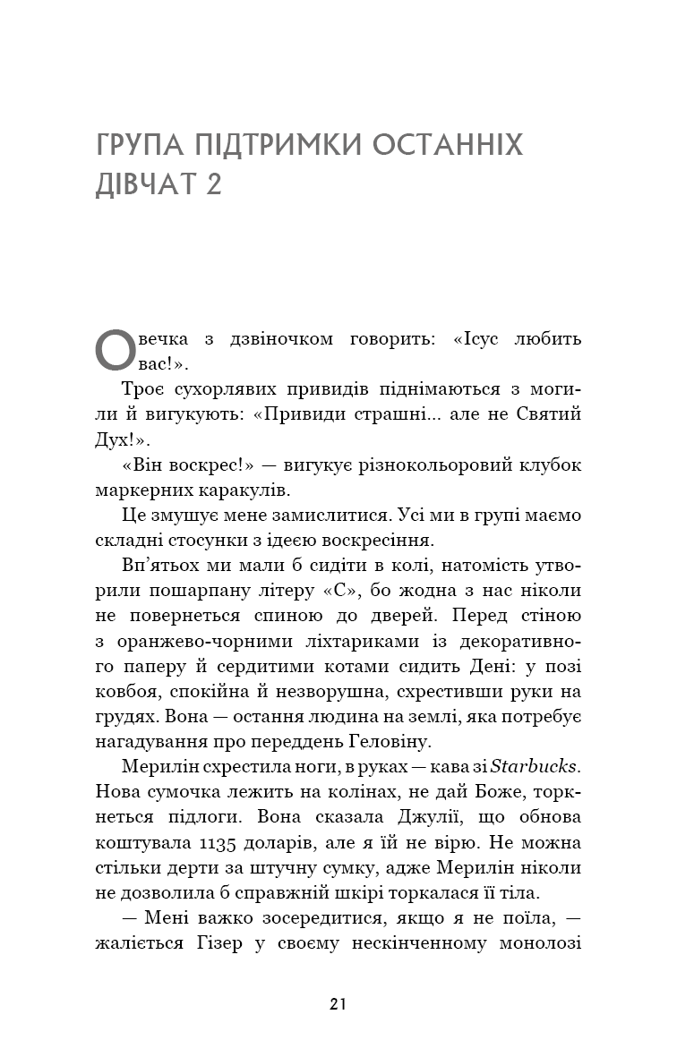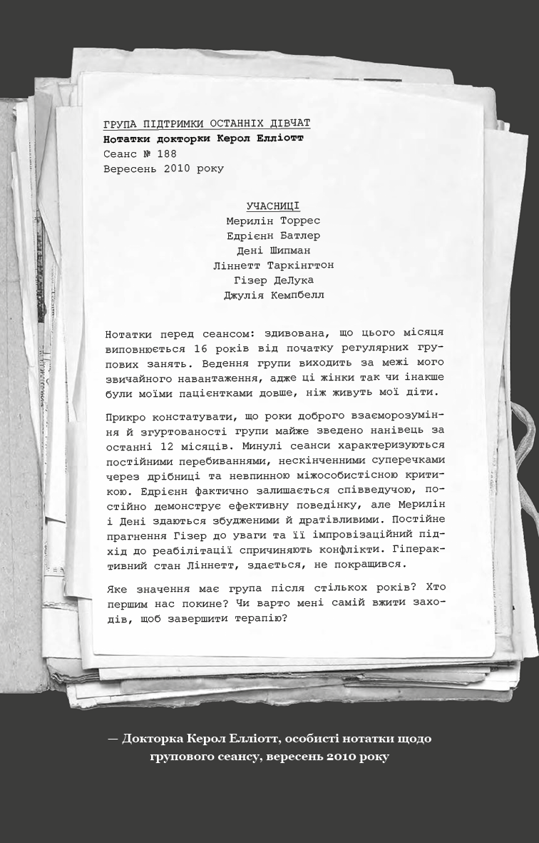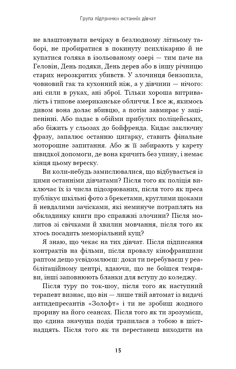 Коли наприкінці фільмів жахів на екранах з’являються титри, останні дівчата продовжують стояти. Вони пережили найстрашнішу ніч у своєму житті... але що буде далі? Як і бестселер «Посібник зі знищення вампірів від Південного книжкового клубу», новий роман Ґрейді Гендрікса — це стрімкий, страхітливий і зловісно непередбачуваний трилер. Ліннет Таркінгтон пережила криваву різанину, в якій убивця жорстоко розправився з її родиною та поліцейським. Протягом шістнадцяти років вона відвідує групу психологічної підтримки, де разом із п’ятьма іншими дівчатами з подібним досвідом намагається подолати наслідки травми й почати нове життя. Так триває доти, доки одна з жінок не пропускає зустріч. Зважаючи на всі обставини, справджуються найгірші побоювання Ліннетт: хтось знає про групу й вирішив знову зруйнувати їхні життя. Але особливість останніх дівчат полягає в тому, що тепер вони мають одна одну, і хоч якими мізерними не були б шанси, якою темною не виявилася б ніч, яким гострим не був би ніж, вони ніколи, ніколи не здадуться.