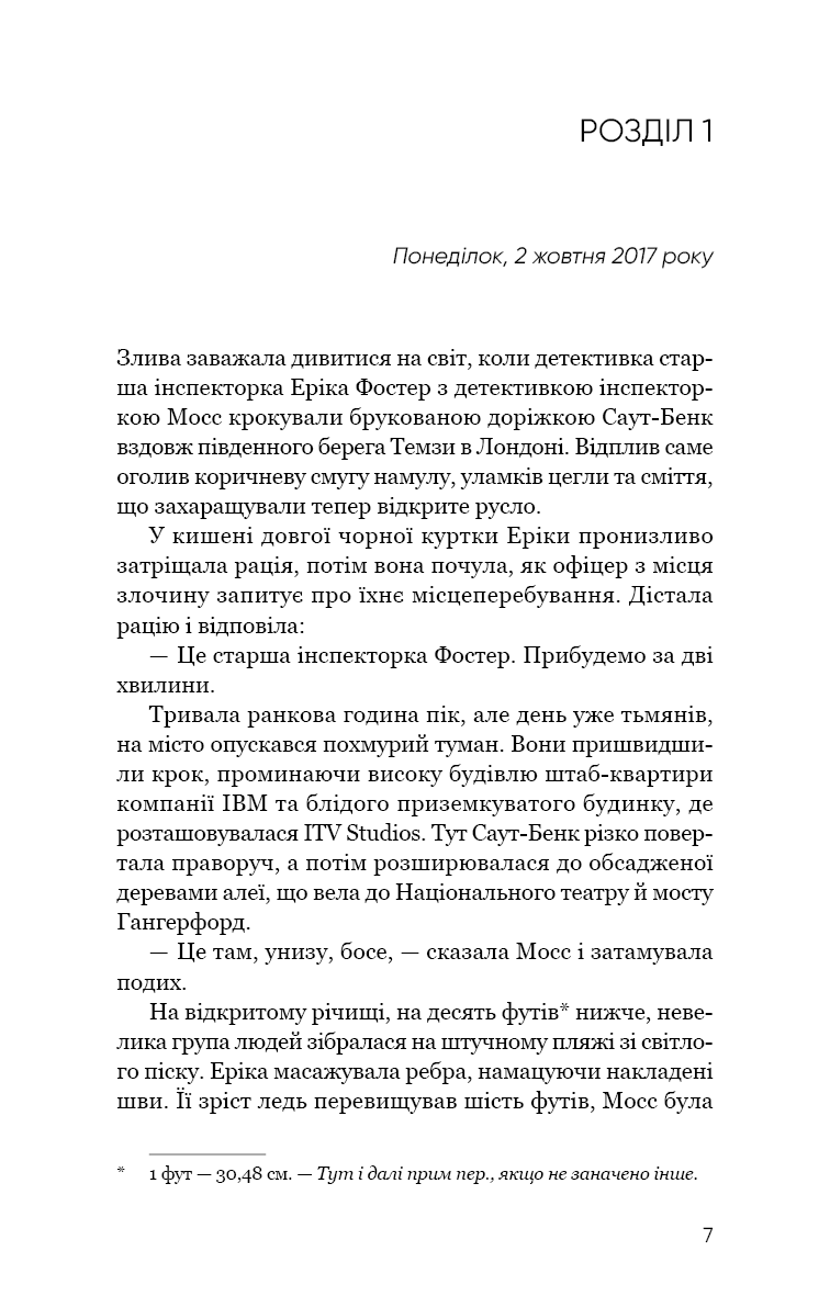 Дощовим осіннім ранком до берега Темзи прибиває пошарпану валізу із моторошним вмістом: розчленованим тілом невідомого чоловіка. Але детективка Еріка Фостер не вперше стикається з таким жорстоким вбивством... Два тижні тому тіло молодої жінки було знайдено в ідентичній валізі. Що пов’язує цих двох жертв?