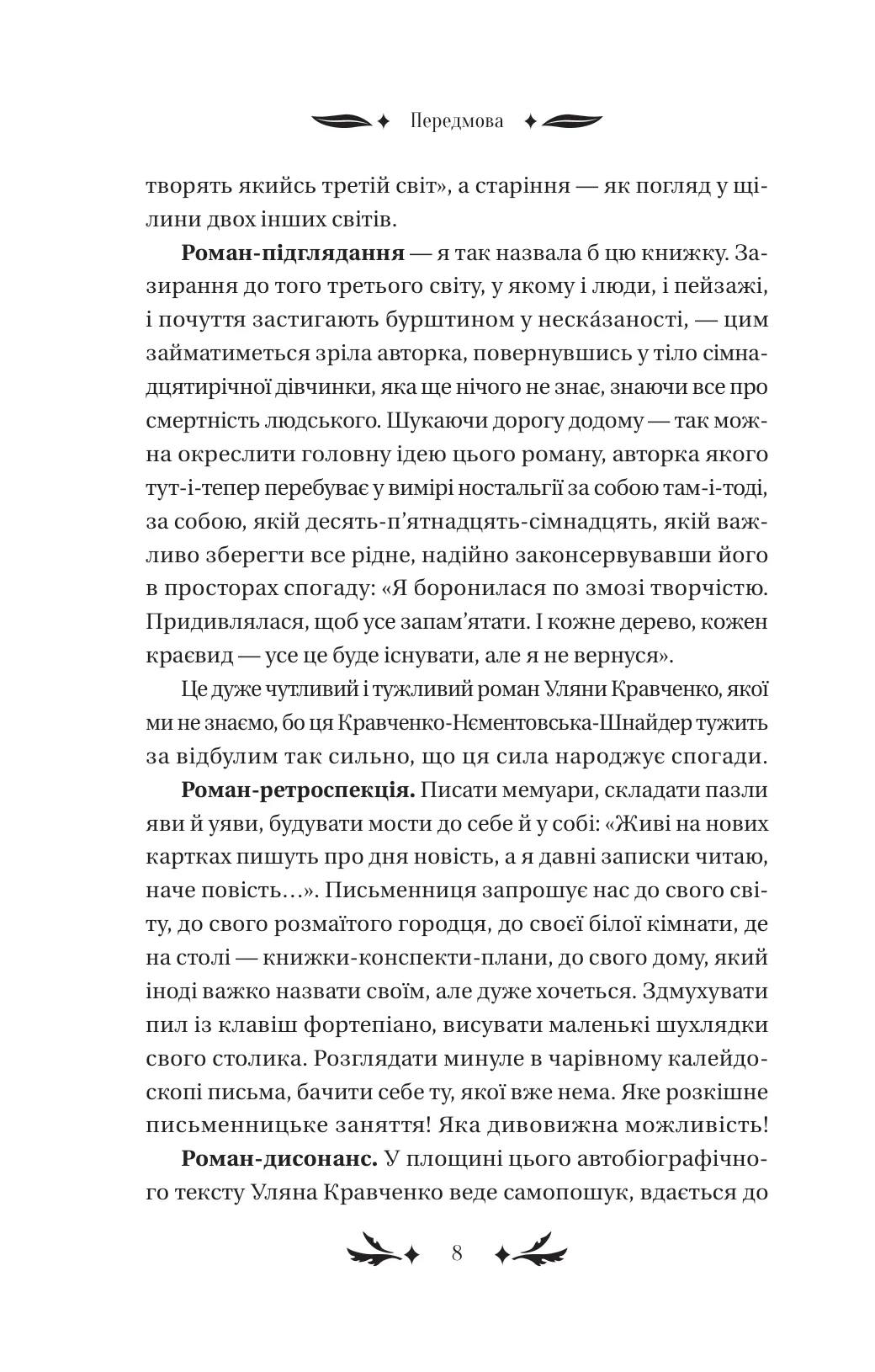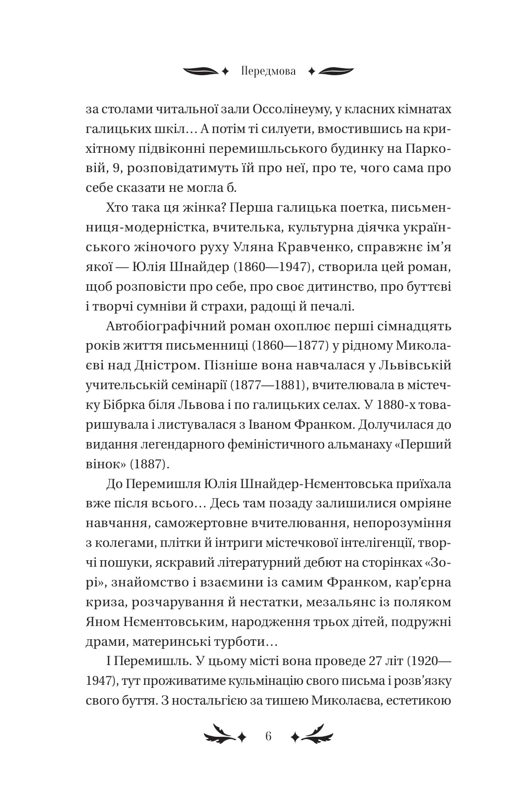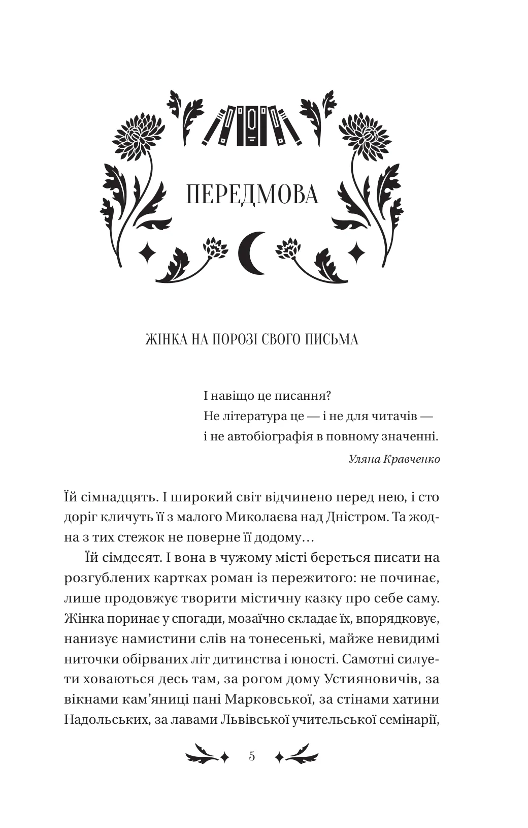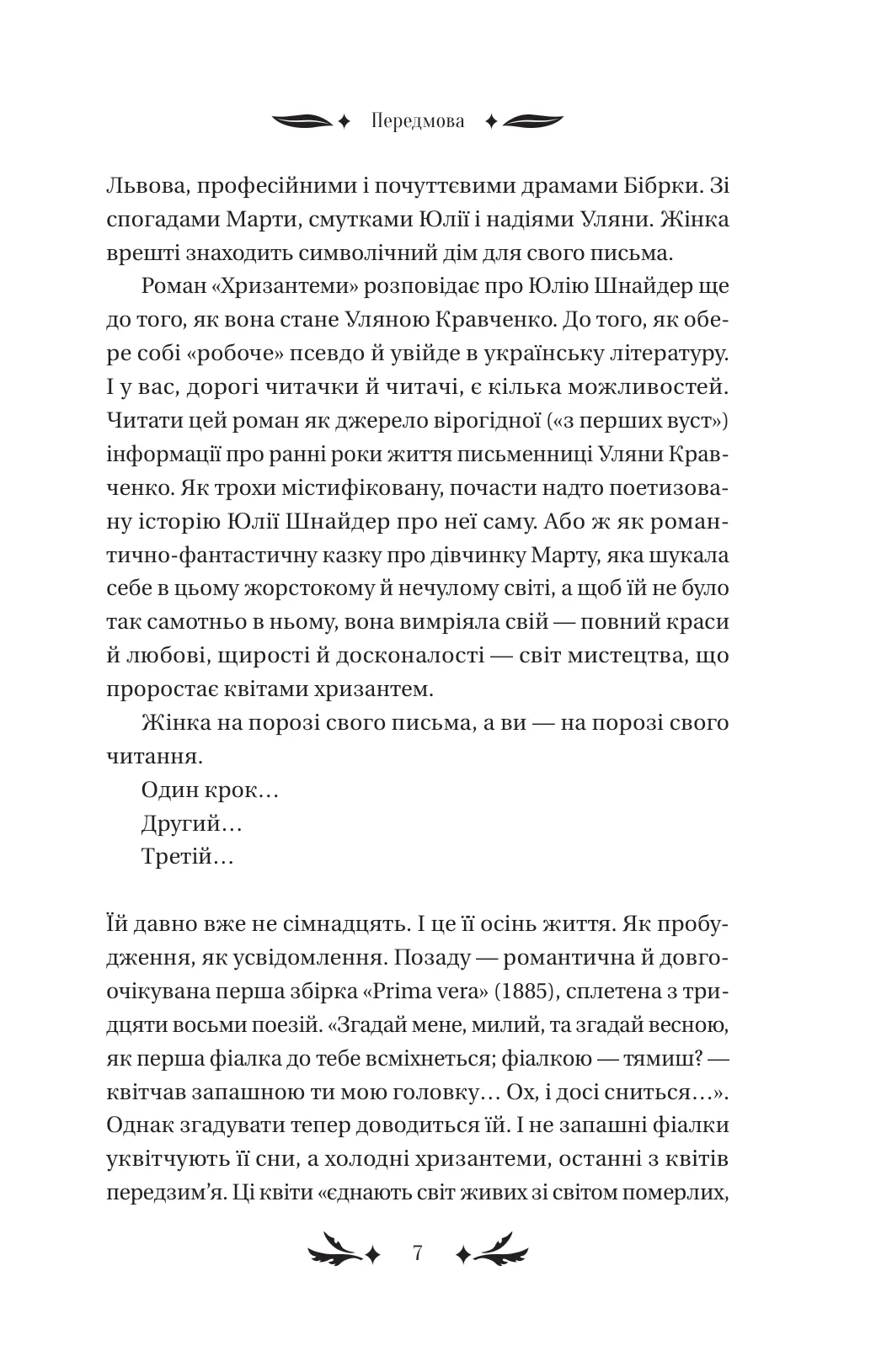 Жінка, яка тікає від себе самої, повертається в дім свого дитинства. Вона намагається впорядкувати спогади, впізнає у розбитому дзеркалі минулого постаті тих, кого любила. Демонічна пристрасть, скандинавська романтика, містична туга, незбагненна «сага роду» — химерні та вабливі переплетіння автобіографічного роману Уляни Кравченко «Хризантеми». Авторка майстерно вплітає у свій твір чуттєву музику, інтелектуальні дискусії, феміністичні заяви і творчі самовідкриття fin de siècle.