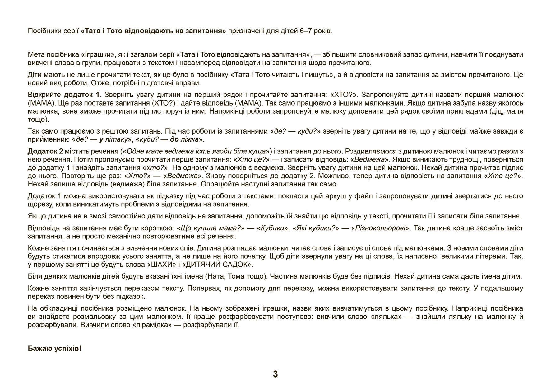 Це також чудовий помічник для батьків, які бажають збільшити словниковий запас своєї дитини, навчити її об'єднувати вивчені слова в групи, працювати з текстом та відповідати на запитання щодо прочитаного. Помічниками будуть, як і раніше, дівчинка Тата й хлопчик Тото.