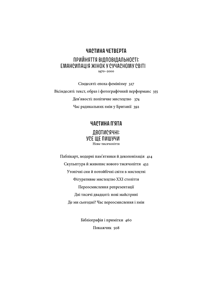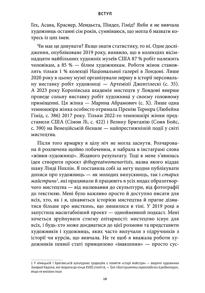 “Історія мистецтва без чоловіків” - це книга британської мистецтвознавиці Кеті Гессел, що представляє альтернативний погляд на історію мистецтва, зосереджуючись виключно на жінках художницях, які часто залишалися поза увагою. Авторка розглядає різні епохи та стилі, починаючи від Ренесансу і закінчуючи сучасністю, і показує вплив жінок на розвиток мистецтва. Відкрийте для себе нові імена такі як: Анґвісола, Фонтана, Сірані, Петерс, Джентілескі, Кауфман, Паверс, Льюїс, Макдоналд Макінтош, Валадон, Гех, Асава, Краснер, Мендьєта, Піндел, Гімід та їхні неймовірні роботи, представлені в цій книзі.