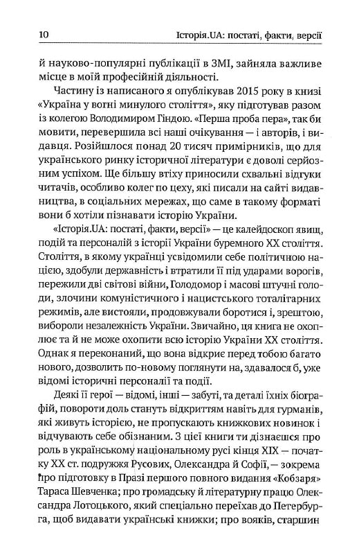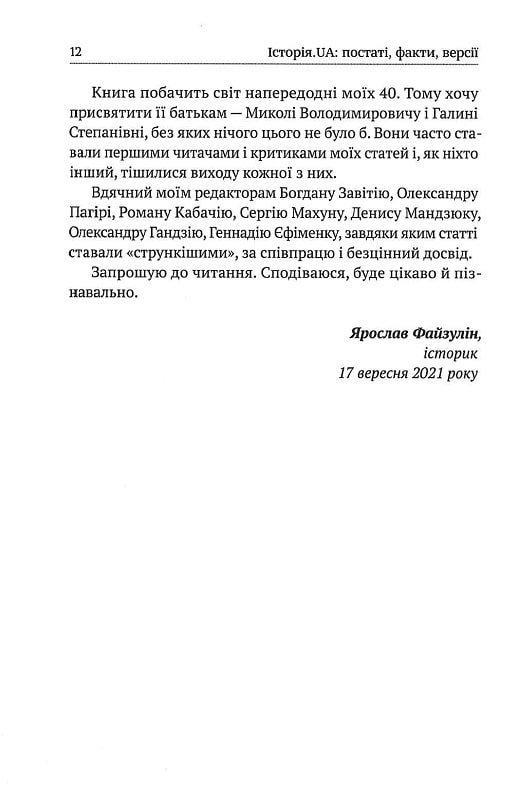 «Історія.UA: постаті, факти, версії» Ярослава Файзуліна — це збірник нарисів про знакових персон та важливі події ХХ століття. Усі разом вони створюють захопливий калейдоскоп цього, здавалося б, найближчого до нас, та водночас найменш знаного часу, що все ще ховається під шаром радянських міфів. Частина героїв цієї книги, як-от Симон Петлюра, Олена Теліга, Степан Бандера чи Роман Шухевич, відомі ще зі шкільних підручників, натомість іншим, таким як Юрій Тютюнник, Михайло Омелянович-Павленко, Юрій Горліс-Горський, Василь Липківський, Олекса Тихий, ще належить посісти своє місце у національній пам’яті українців.