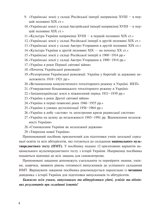 У посібнику запропоновано тестові завдання з історії України (від середніх віків до нашого часу), що дають змогу здійснити перевірку знань та умінь учнів із цього курсу. Тести укладено відповідно до чинних програм загальноосвітніх навчальних закладів. Посібник призначений для підготовки учнів до національного мультипредметного тесту з цієї дисципліни, а також для поурочної роботи.