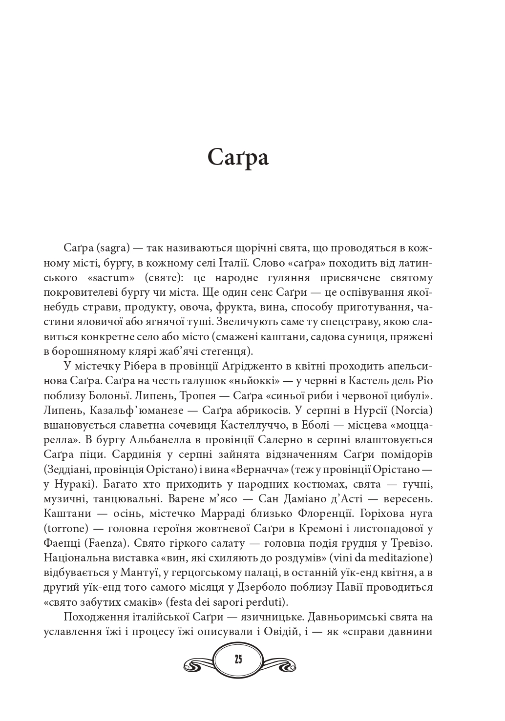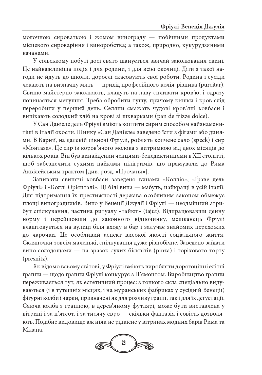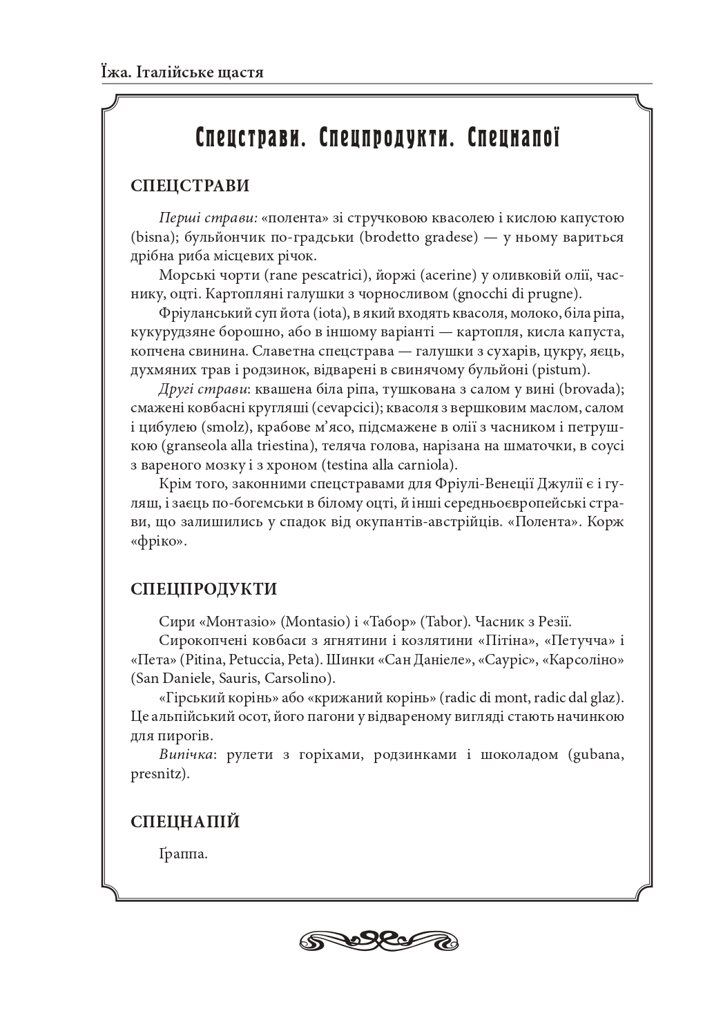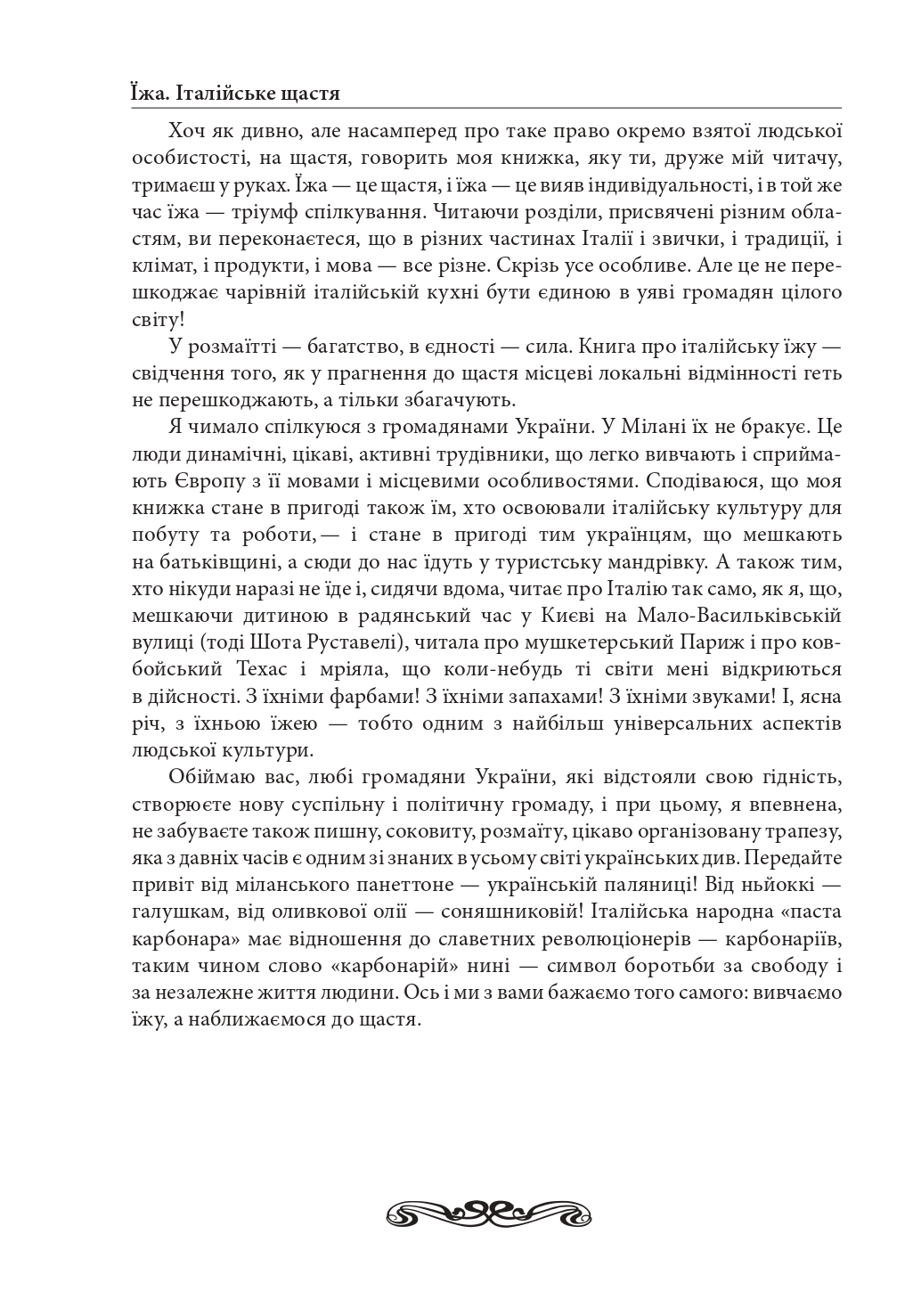 Ця книжка, матеріал до якої збирався протягом 10 років у всіх регіонах країни, знайомить читачів з італійською кухнєю. Автор описує тисячі наїдків, напоїв, приправ (лише до одного виду спагеті — їх більше ста!), страв, рецепт виготовлення яких змінюється в кожної із 20 областей Італії. Це своєрідна кулінарна подорож не тільки з півночі до півдня країни,«від Гомера до фаст-фуду», але й цікава розповідь про секрети середземноморської дієти, давні рецепти, про кулінарний календар, еротизм італійської кухні. Окрему частину книги займають глосарії, таблиці, класифікації і специфікації продуктів, що використовуються в італійській кухні. Але це видання не тільки про їжу, воно про країну, про її культуру, свідченням чого є включені до нього численні відгуки видатних людей про кулінарні традиції Італії, нерозривно пов’язані з культурою країни. Книжка призначена тим, хто вивчає Італію, і допоможе зрозуміти країну та її людей через універсальний кулінарний код.