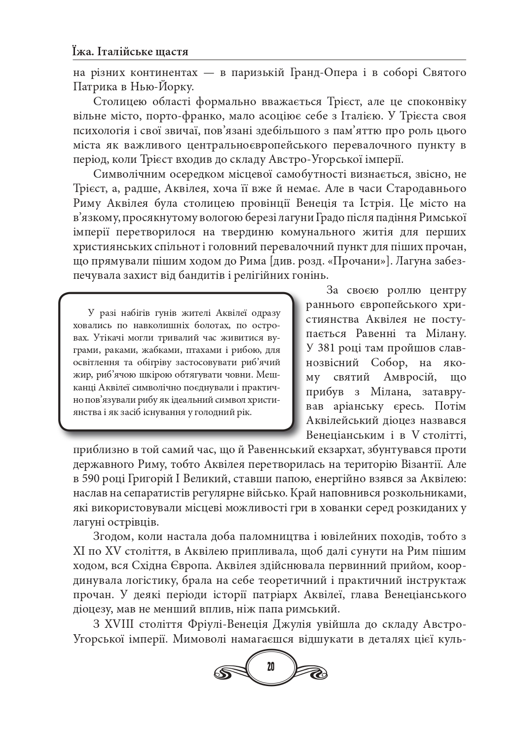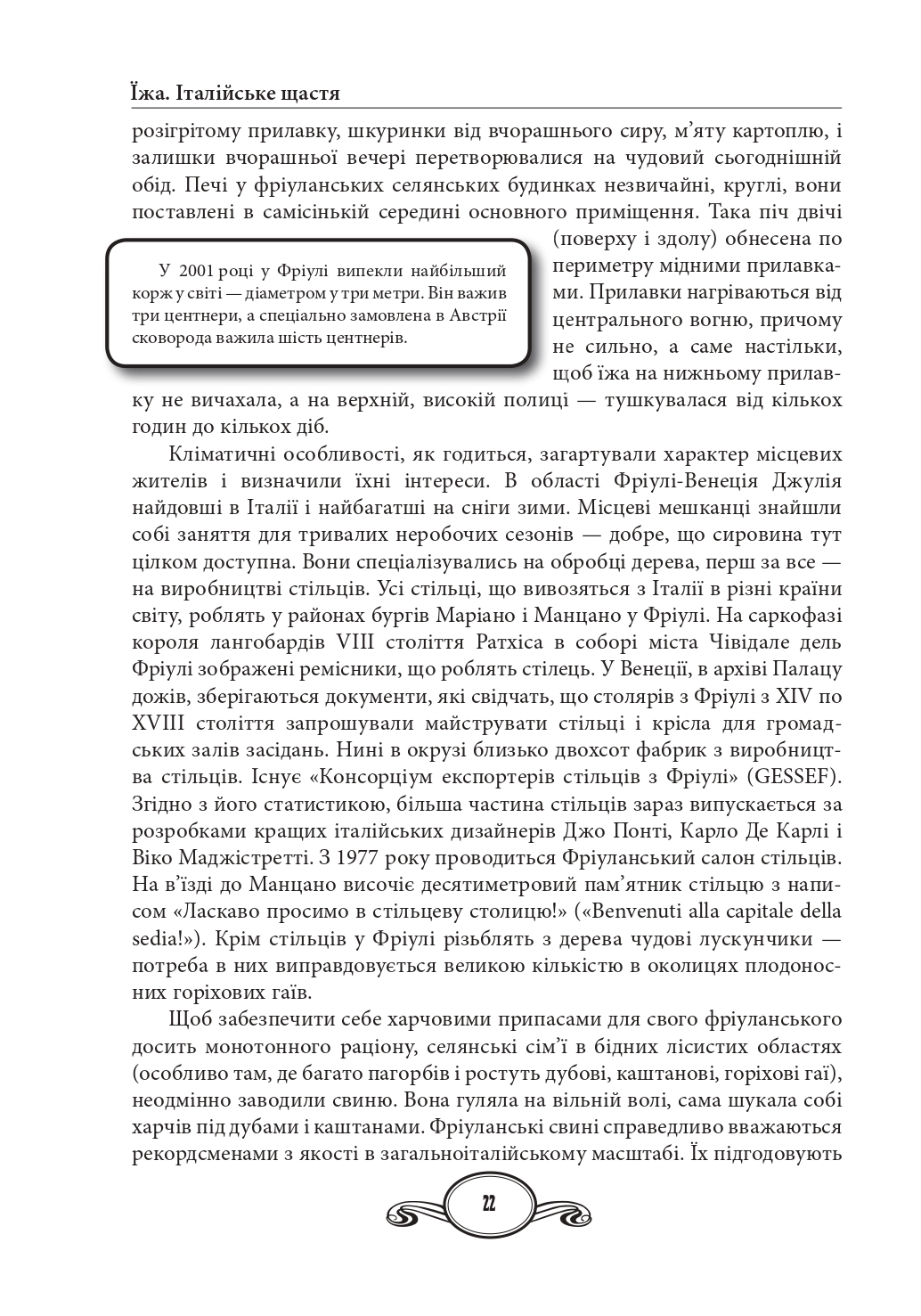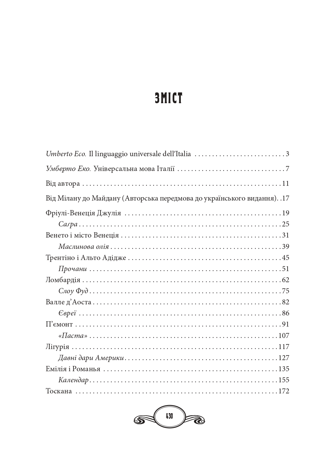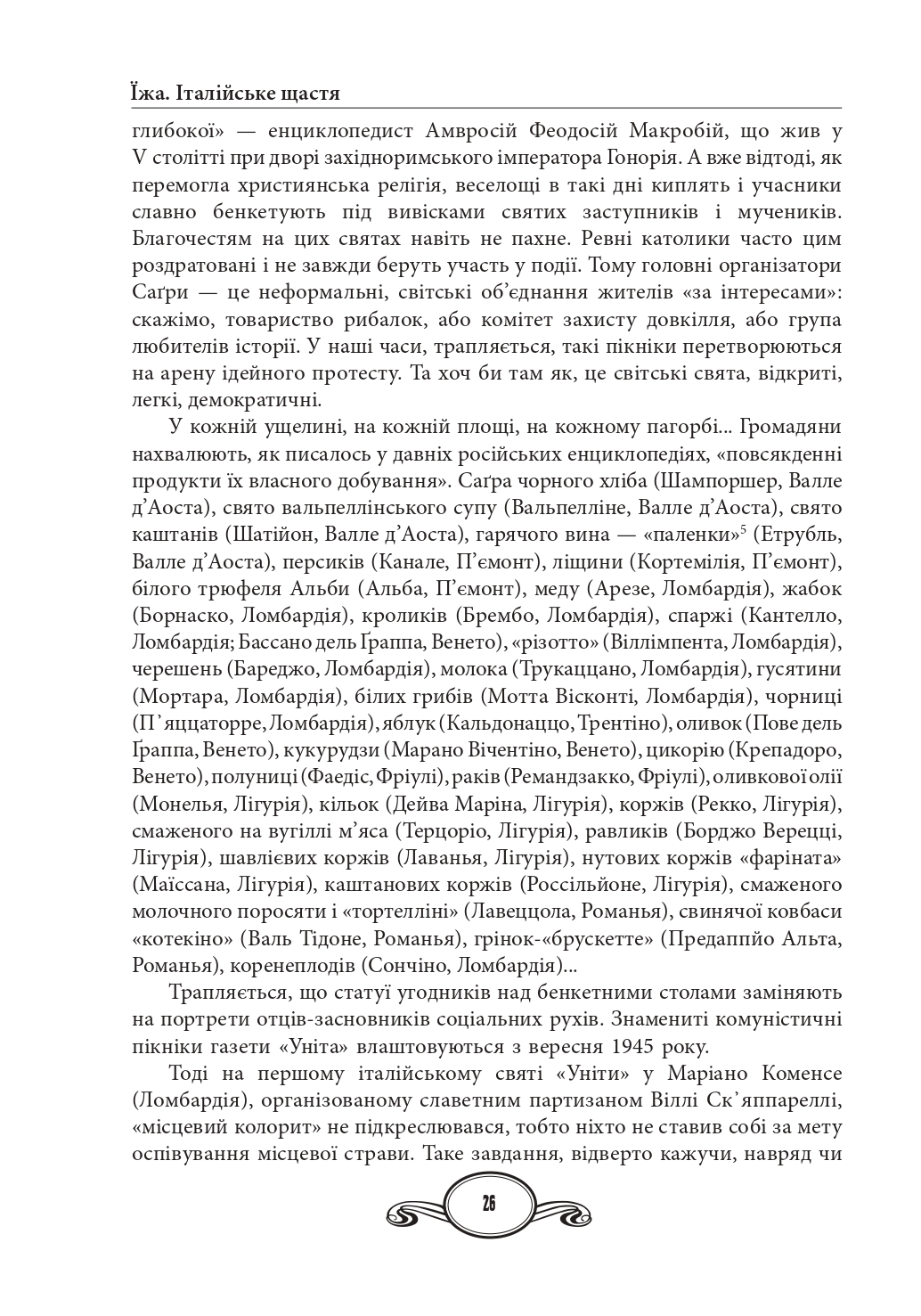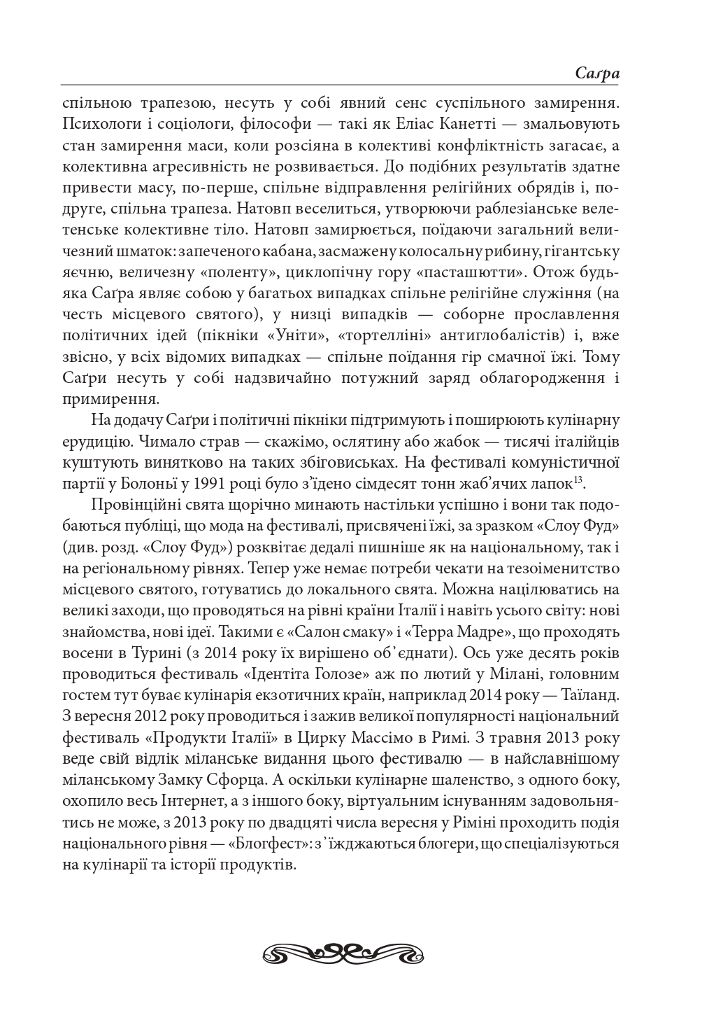 Ця книжка, матеріал до якої збирався протягом 10 років у всіх регіонах країни, знайомить читачів з італійською кухнєю. Автор описує тисячі наїдків, напоїв, приправ (лише до одного виду спагеті — їх більше ста!), страв, рецепт виготовлення яких змінюється в кожної із 20 областей Італії. Це своєрідна кулінарна подорож не тільки з півночі до півдня країни,«від Гомера до фаст-фуду», але й цікава розповідь про секрети середземноморської дієти, давні рецепти, про кулінарний календар, еротизм італійської кухні. Окрему частину книги займають глосарії, таблиці, класифікації і специфікації продуктів, що використовуються в італійській кухні. Але це видання не тільки про їжу, воно про країну, про її культуру, свідченням чого є включені до нього численні відгуки видатних людей про кулінарні традиції Італії, нерозривно пов’язані з культурою країни. Книжка призначена тим, хто вивчає Італію, і допоможе зрозуміти країну та її людей через універсальний кулінарний код.