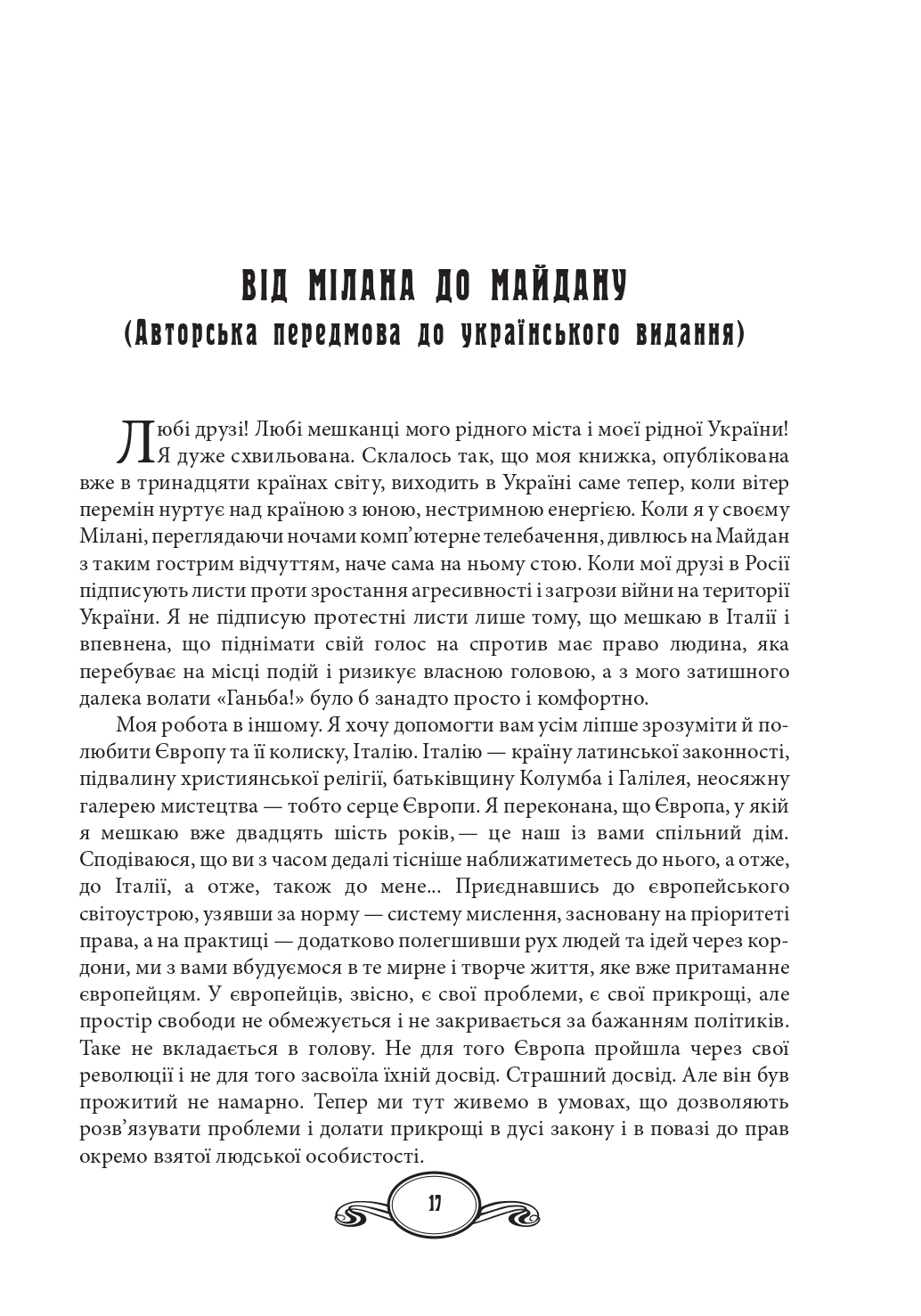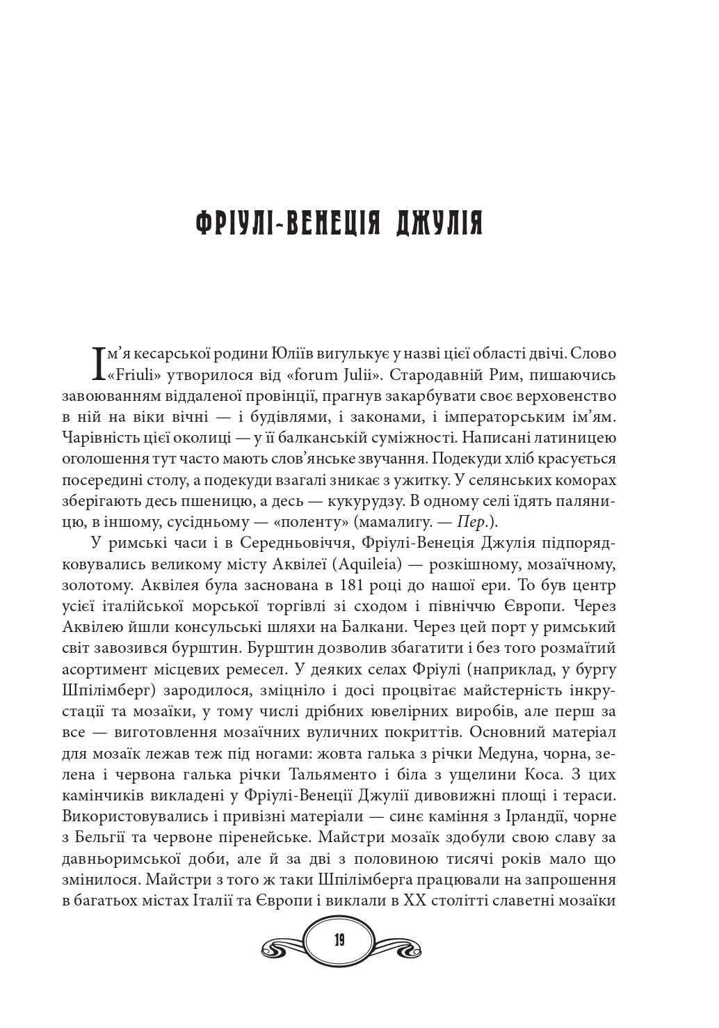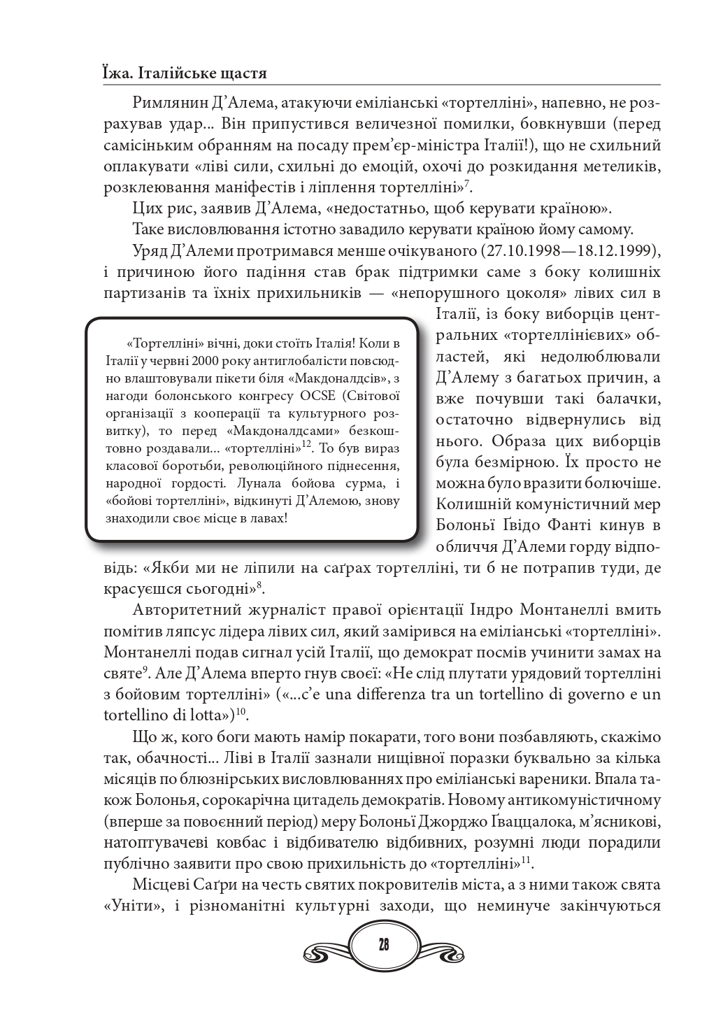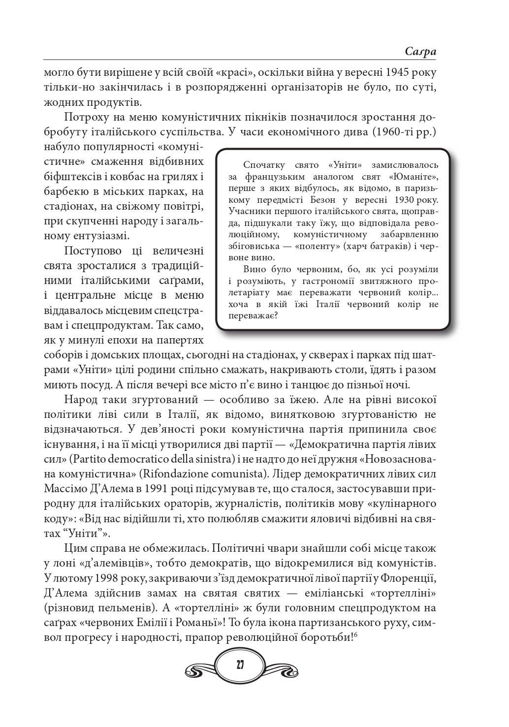 Ця книжка, матеріал до якої збирався протягом 10 років у всіх регіонах країни, знайомить читачів з італійською кухнєю. Автор описує тисячі наїдків, напоїв, приправ (лише до одного виду спагеті — їх більше ста!), страв, рецепт виготовлення яких змінюється в кожної із 20 областей Італії. Це своєрідна кулінарна подорож не тільки з півночі до півдня країни,«від Гомера до фаст-фуду», але й цікава розповідь про секрети середземноморської дієти, давні рецепти, про кулінарний календар, еротизм італійської кухні. Окрему частину книги займають глосарії, таблиці, класифікації і специфікації продуктів, що використовуються в італійській кухні. Але це видання не тільки про їжу, воно про країну, про її культуру, свідченням чого є включені до нього численні відгуки видатних людей про кулінарні традиції Італії, нерозривно пов’язані з культурою країни. Книжка призначена тим, хто вивчає Італію, і допоможе зрозуміти країну та її людей через універсальний кулінарний код.