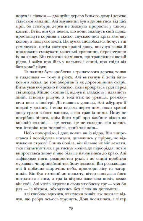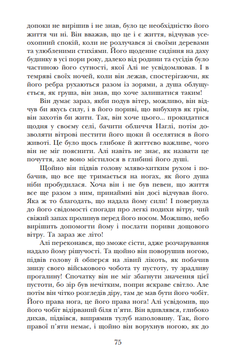 Проникливий роман про молодого сирійця, чиє життя трагічно змінюється через війну. Авторка майстерно поєднує гуманістичний посил із елементами магічного реалізму. Читач зустрічає пораненого Алі на горі біля самотнього дуба після помилкового авіаудару сирійських урядових сил по власних позиціях. Балансуючи між життям і смертю, юнак повертається думками до свого дитинства і юності в гірському селі, до свого «гніздечка» на даху, сплетеного з гілок дерева, до свого особливого зв’язку з деревами та природою. У вражаючих епізодах твору постає життя звичайних сирійців, чиї сім’ї змушені втрачати своїх дітей як «мучеників» війни. Особливу роль у романі відіграє образ ексцентричної жінки Хамейрони, яка навчила Алі розуміти мову дерев і через відчуття сприймати життєву мудрість поза межами людського насильства. Роман Самар Язбек — це потужна антивоєнна притча, яка показує безглуздість та нещадність збройних конфліктів через долю однієї людини. Авторка не просто зображує фізичні страждання, а досліджує психологічні рани, завдані війною, коли людина стає заручником безжальної системи, в якій «батьківщина» і «держава» перетворюються на гасла, котрими виправдовують насильство. «Каплиця вітру» запам’ятовується своєю ліричною красою та філософською глибиною, досліджуючи універсальні теми людяності, гідності та прагнення до свободи в найтемніші часи.