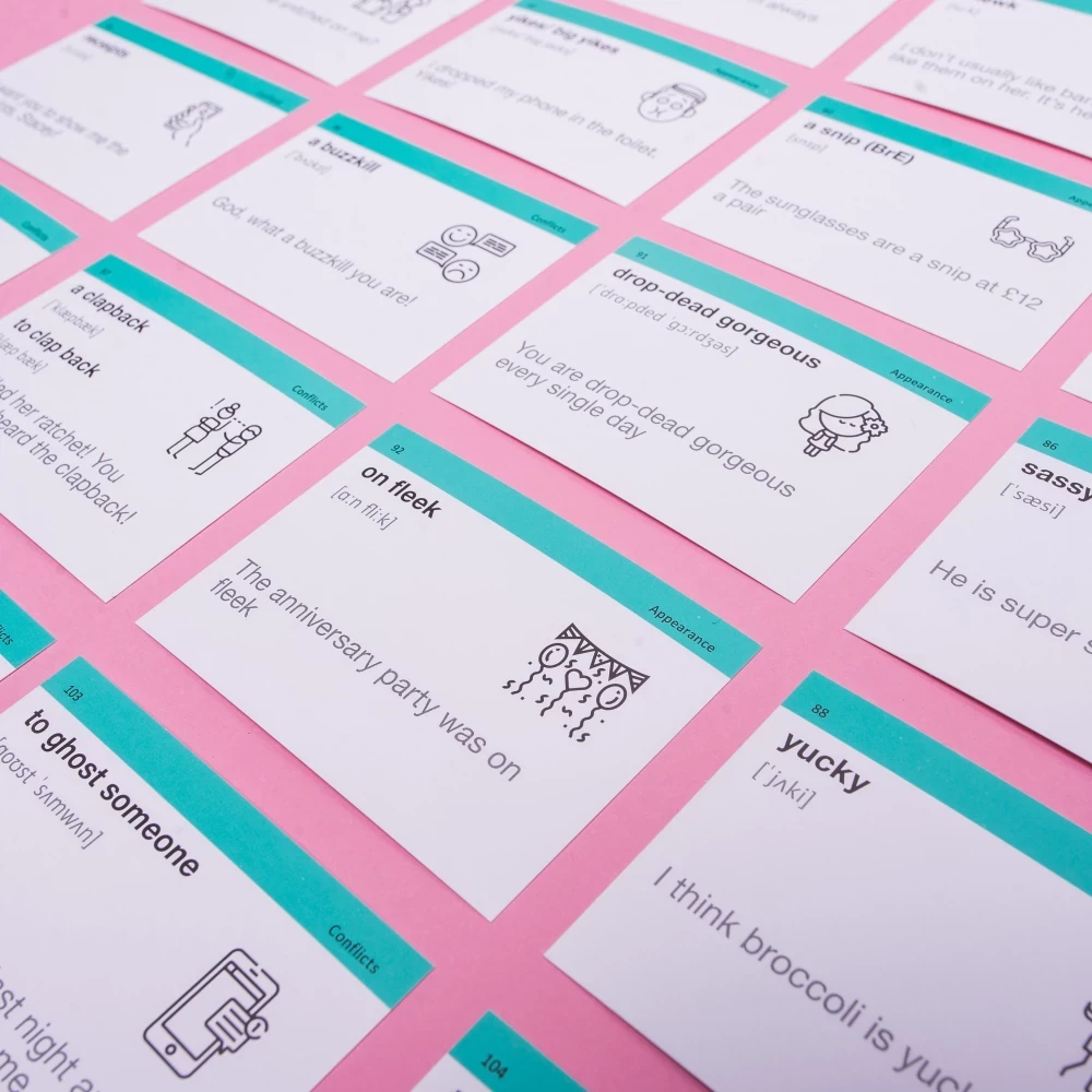 Кожен набір містить: 105 карток зі сленговими словами, спрощена версія коробки для інтервального повторення, 2 розділювачі («Знаю», «Не знаю»).