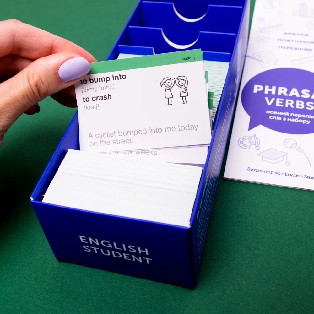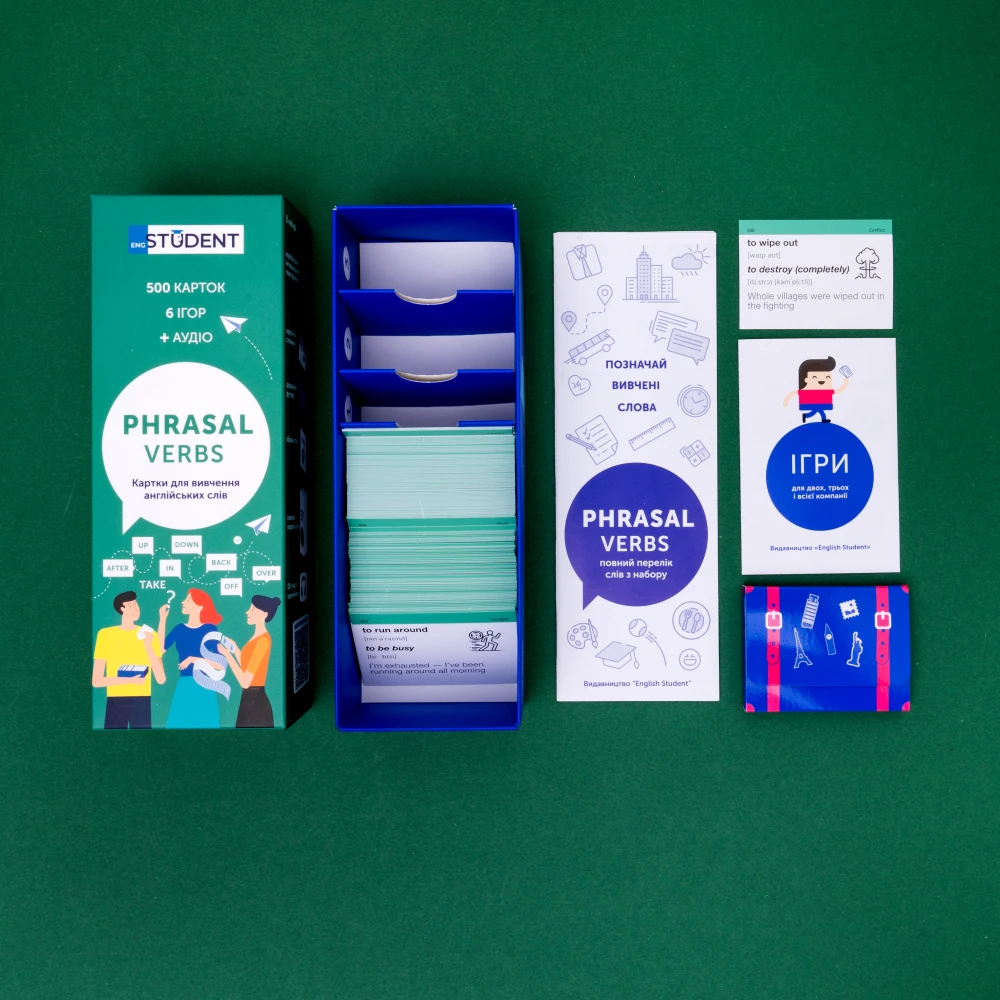 Phrasal Verbs (рівень В1-С1) — набір карток для вивчення фразових дієслів. Тут зібрані найпопулярніші фразові дієслова, які допоможуть твоїй англійській level up. Відтепер ти зможеш не перепитувати, що мав на увазі англієць чи американець. І знатимеш, у яких контекстах використовувати різні значення. Вибирають ті, хто випробував уже всі способи вивчити фразові дієслова і хоче нарешті їх запам'ятати. У цьому наборі 500 фразових дієслів та 500 прикладів їх вживання.