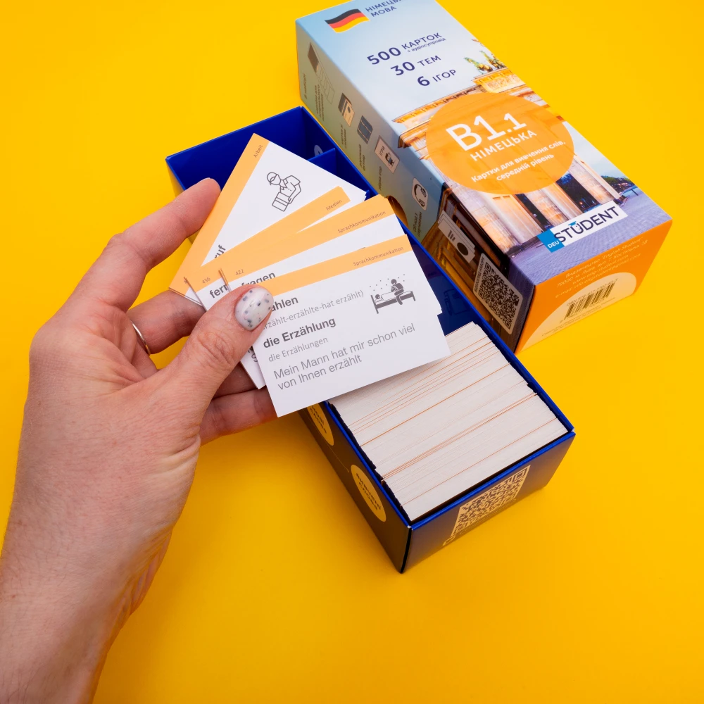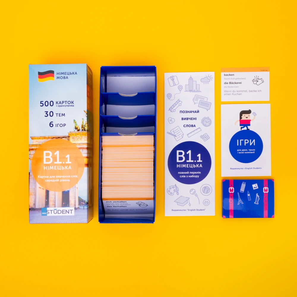 Кожен набір містить: 500 карток, коробку для інтервального повторення, дорожній футляр, QR-код з аудіосупроводом та збірку ігор.