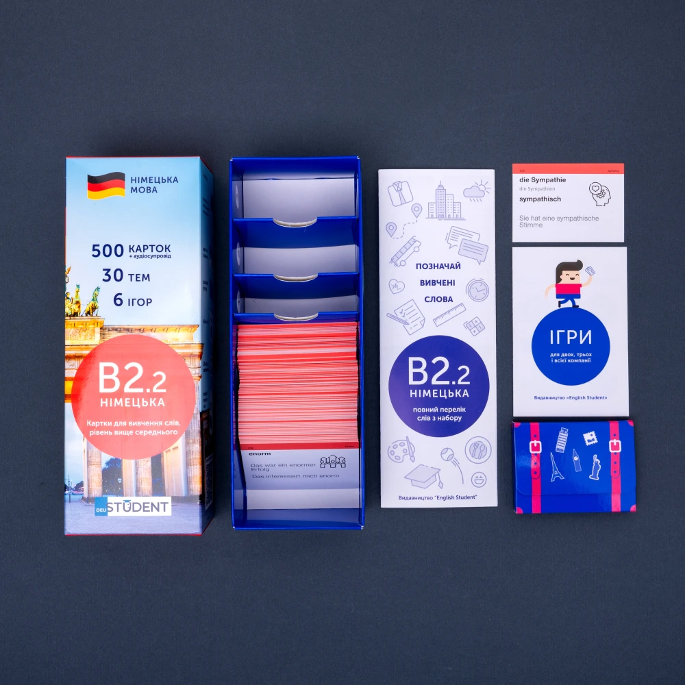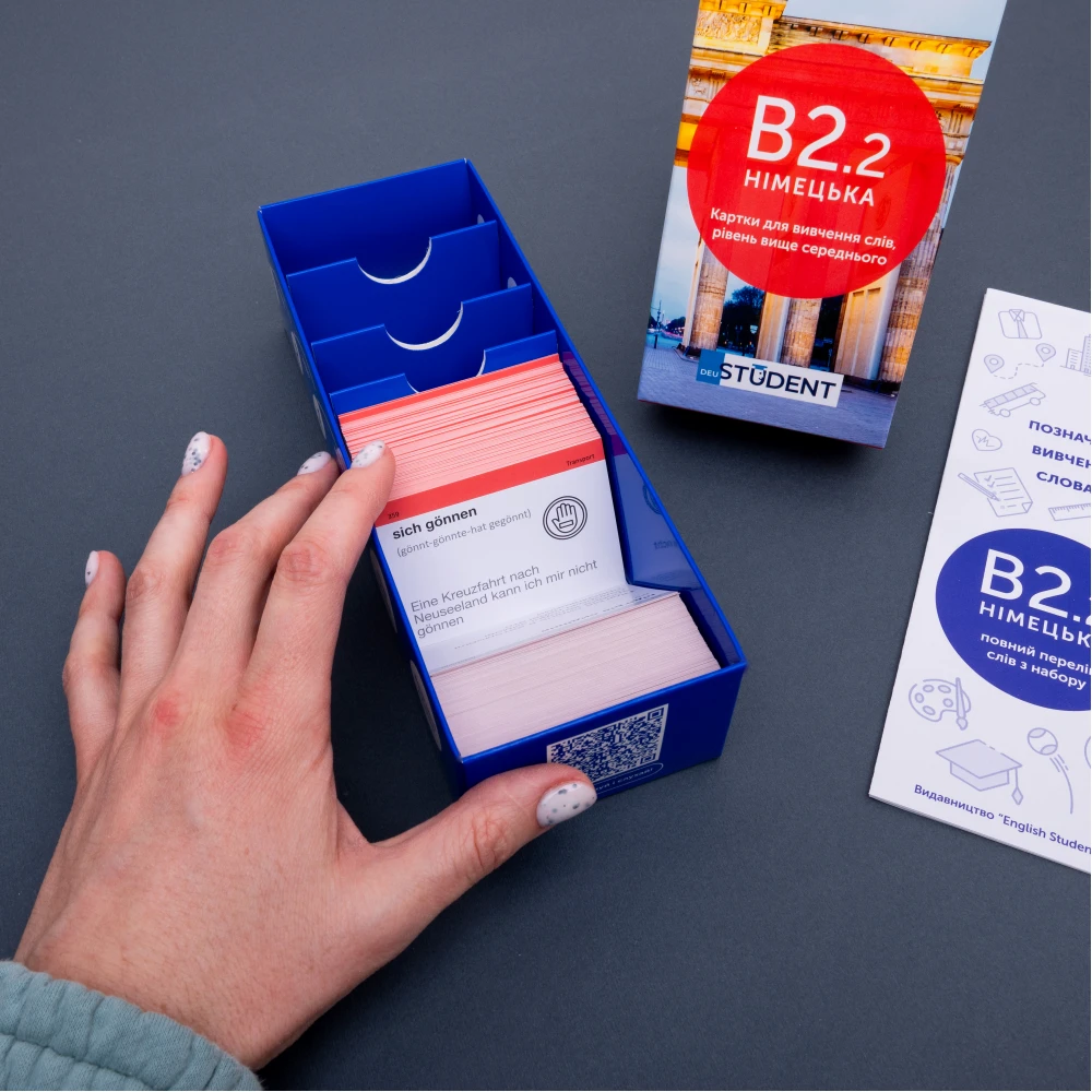 Німецька В2.2 — друга частина вище середнього рівня. Цього достатньо, щоб вільно спілкуватися з носіями мови в різних ситуаціях. Для тих, хто не зупиняється на досягнутому. В цьому наборі 708 німецьких слів та 560 прикладів їх вживання.