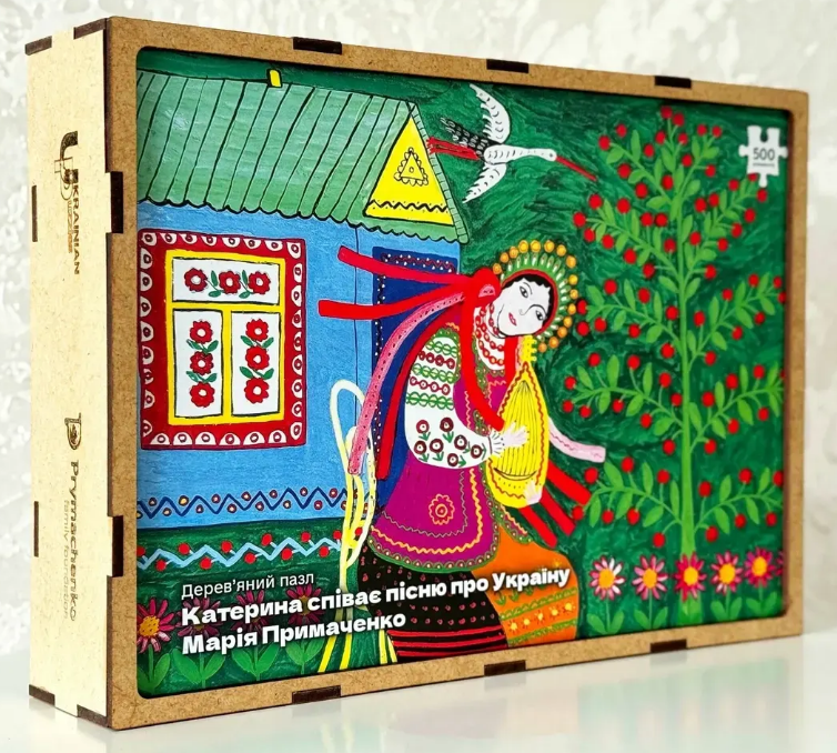 Ukrainian Puzzles у співпраці із Фундацією родини Примаченко створили серію різних пазлів із творами Марії Примаченко. На цьому пазлі зображено картину «Катерина співає пісню про Україну», яку художниця створила у 1972 році.