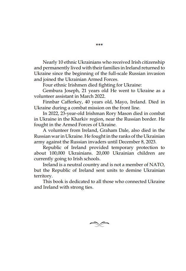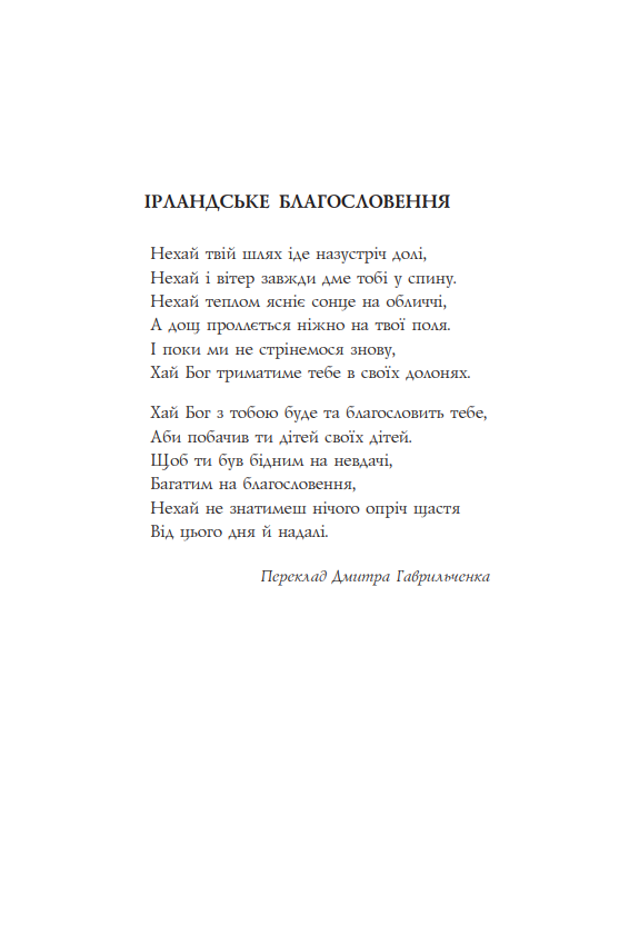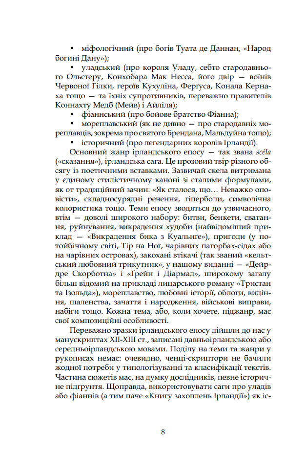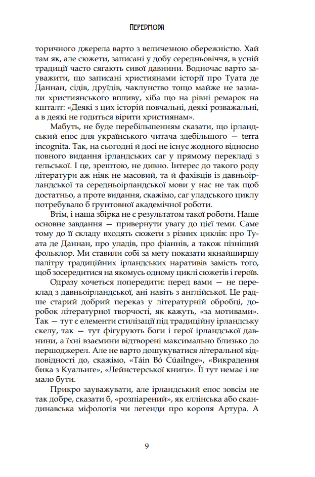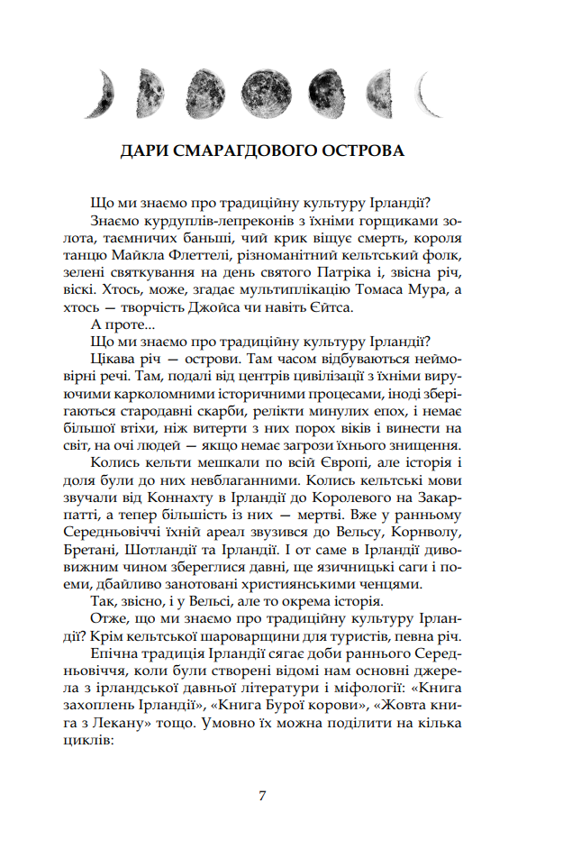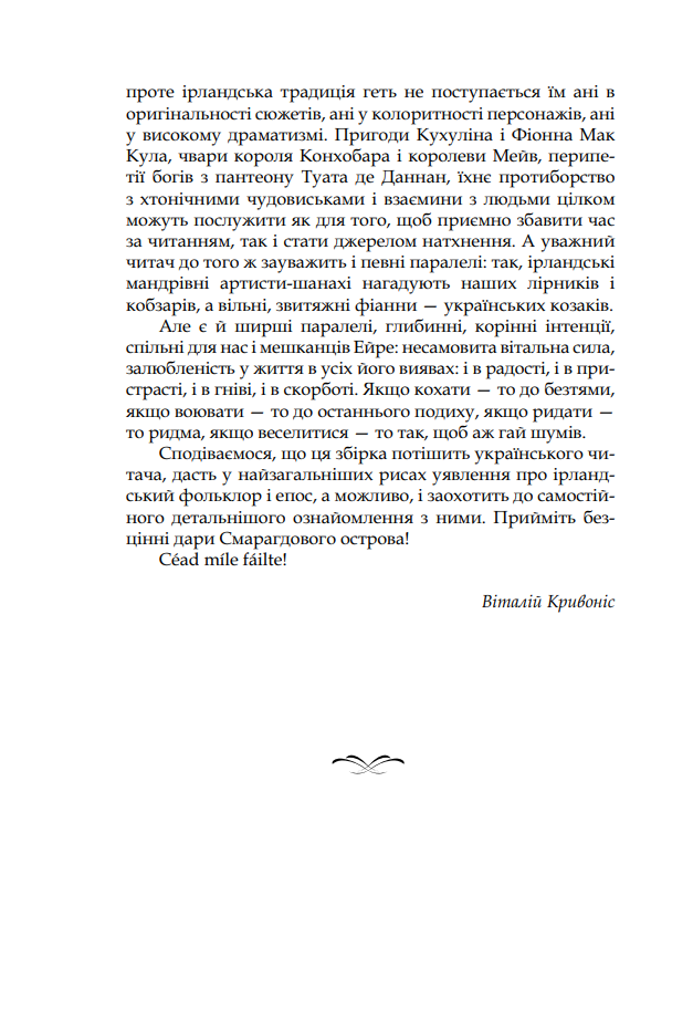Запрошуємо читача в подорож просторами зеленої Ейре! Країни казок і легенд, де на чарівних пагорбах мешкають мудрі та прекрасні Туата де Даннан – прадавній народ, який ірландці вважають за богів; де на пустищах завивають духи пітьми й повітря, а в Давній Тарі править Король Королів. Ви побачите бій легендарних побратимів – Кухуліна та Фердіада, побуваєте в пишних палатах Емайн Махи, познайомитеся з Мейв – грізною королевою Коннахту, разом із Фіоном Мак Кулом і його фіанами полюватимете в пущах на власну долю, почуєте голос арфи Даґди й скрипки Рафтері... Ця збірка ірландських казок, легенд і саг прочинить двері українському читачеві до скарбниці літературної спадщини Смарагдового острова – літератури, незаслужено недооціненої, але не менш значущої, ніж інші взірці європейського фольклору та епосу.