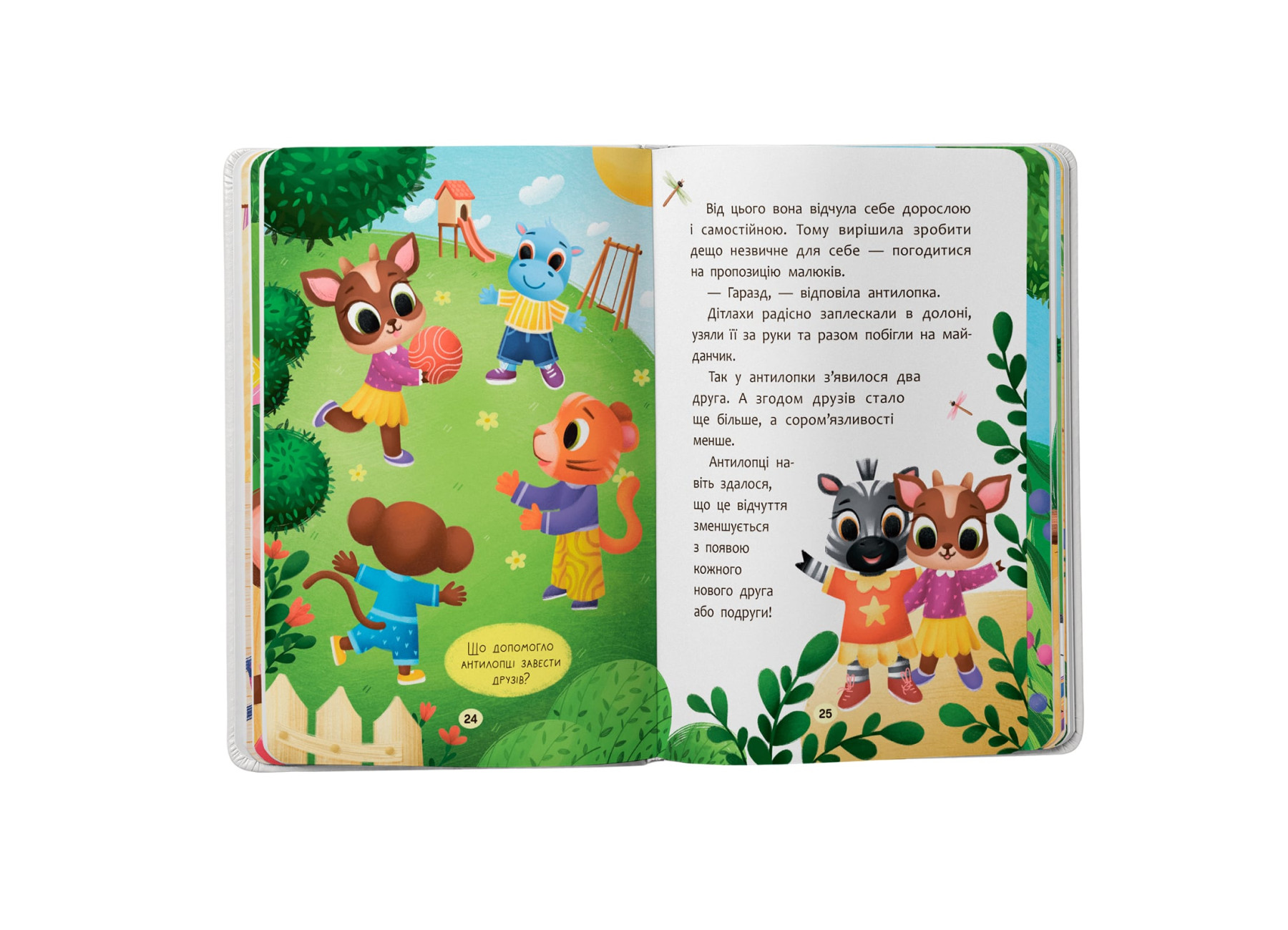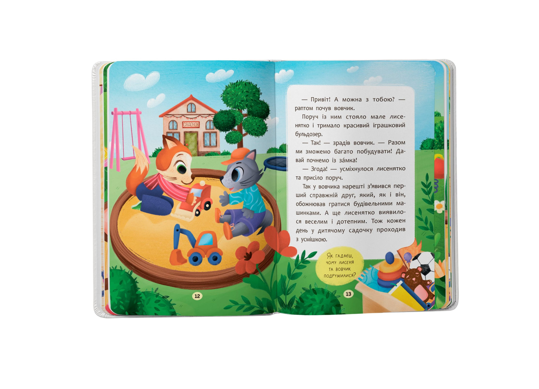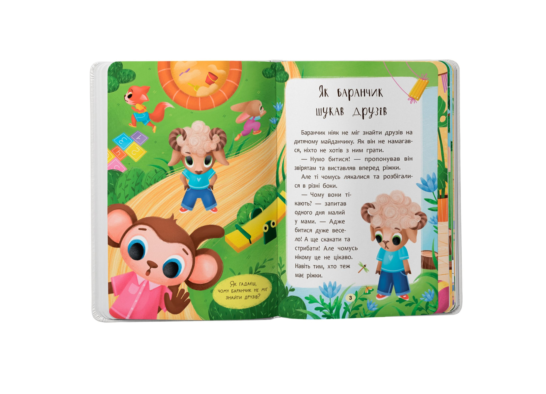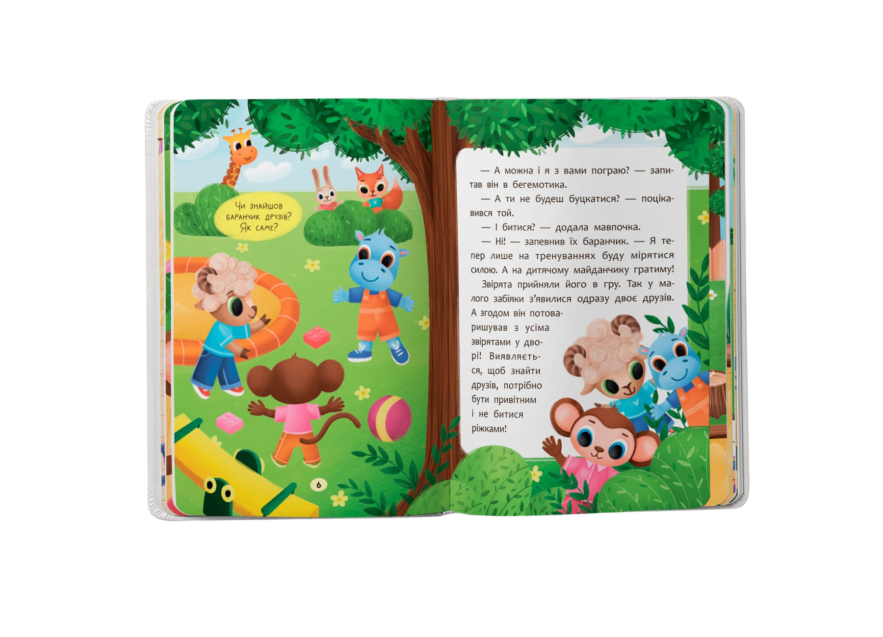 Ваш малюк соромиться познайомитися з іншими дітлахами, засмучується, що його не помічають і грають без нього, ніяковіє та не знає, як навчитися дружбі? Тож завдання дорослих — допомогти дитині подолати сором'язливість, навчитися знаходити взаєморозуміння з іншими дітьми, самостійно вирішувати конфліктні ситуації, а ще зберігати дружбу та самому навчитися бути добрим другом. Це видання стане незамінним помічником і пояснити малюкові, що таке дружба, а милі герої на своєму прикладі покажуть, як потоваришувати з іншими дітьми та знайти справжніх друзів.