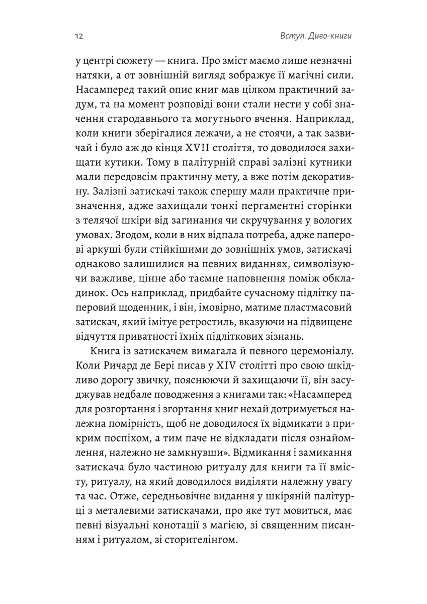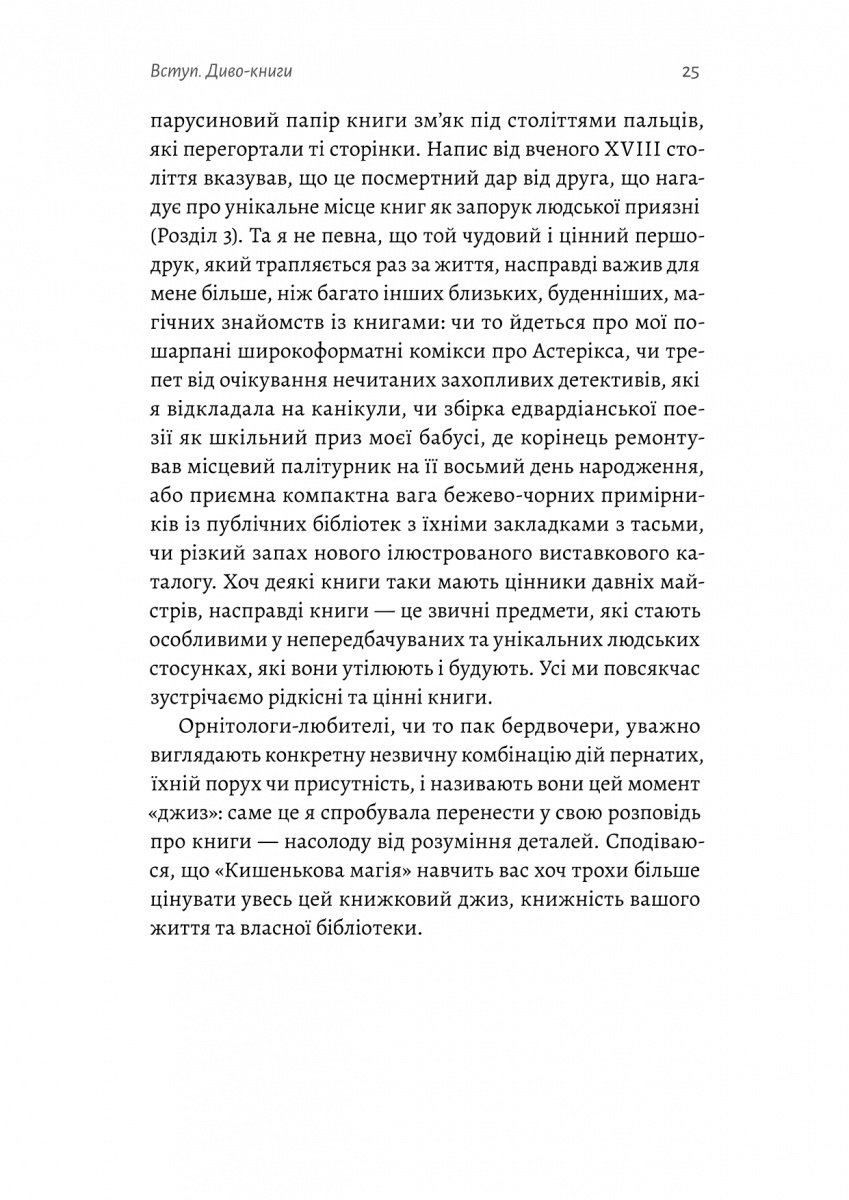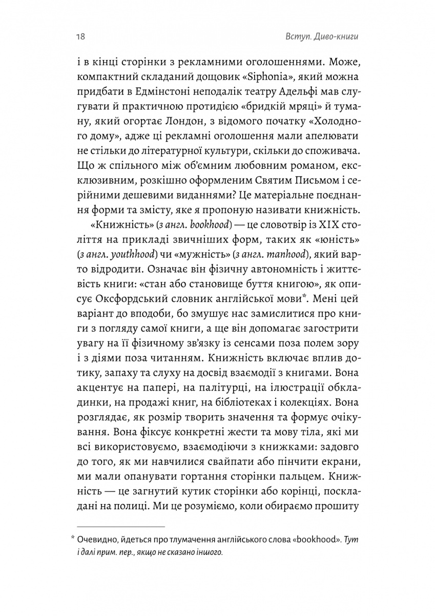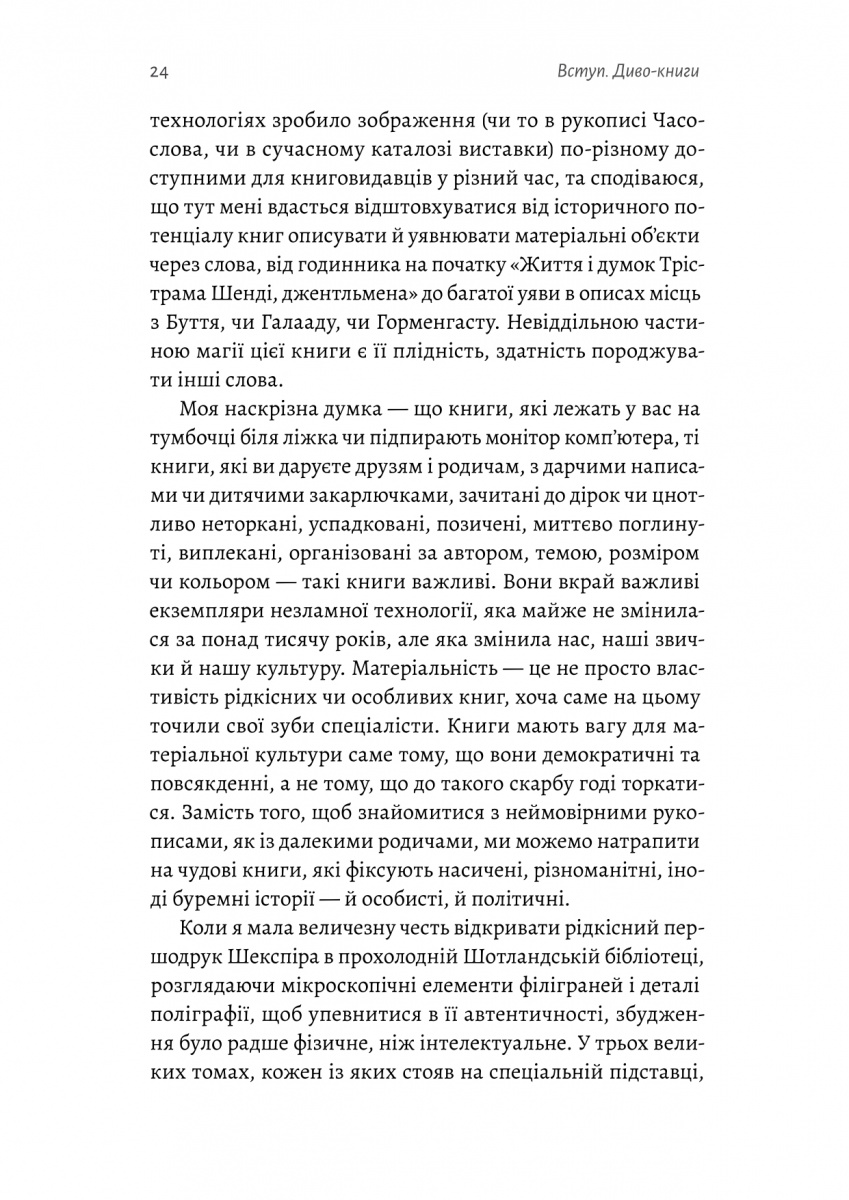 Від спростування міфу про те, що верстат Гутенберга був першим друкарським обладнанням, до декоративних подарункових видань, що надихнули жінок брати участь у боротьбі за свободу від рабства. Від книжок у м'якій обкладинці, які стали зброєю під час Другої світової війни, до книжки в пластиковій упаковці, повністю зробленої зі шматочків американського сиру. Викладачка Оксфордського університету Емма Сміт запрошує читачів у літературну пригоду крізь час і простір, де досліджує як, коли й чому людство стало одержиме книжками. Авторка приділяє особливу увагу тому, що називається «книжковістю» — запахам, сторінкам, полям для записів, ілюстраціям на обкладинці тощо.
