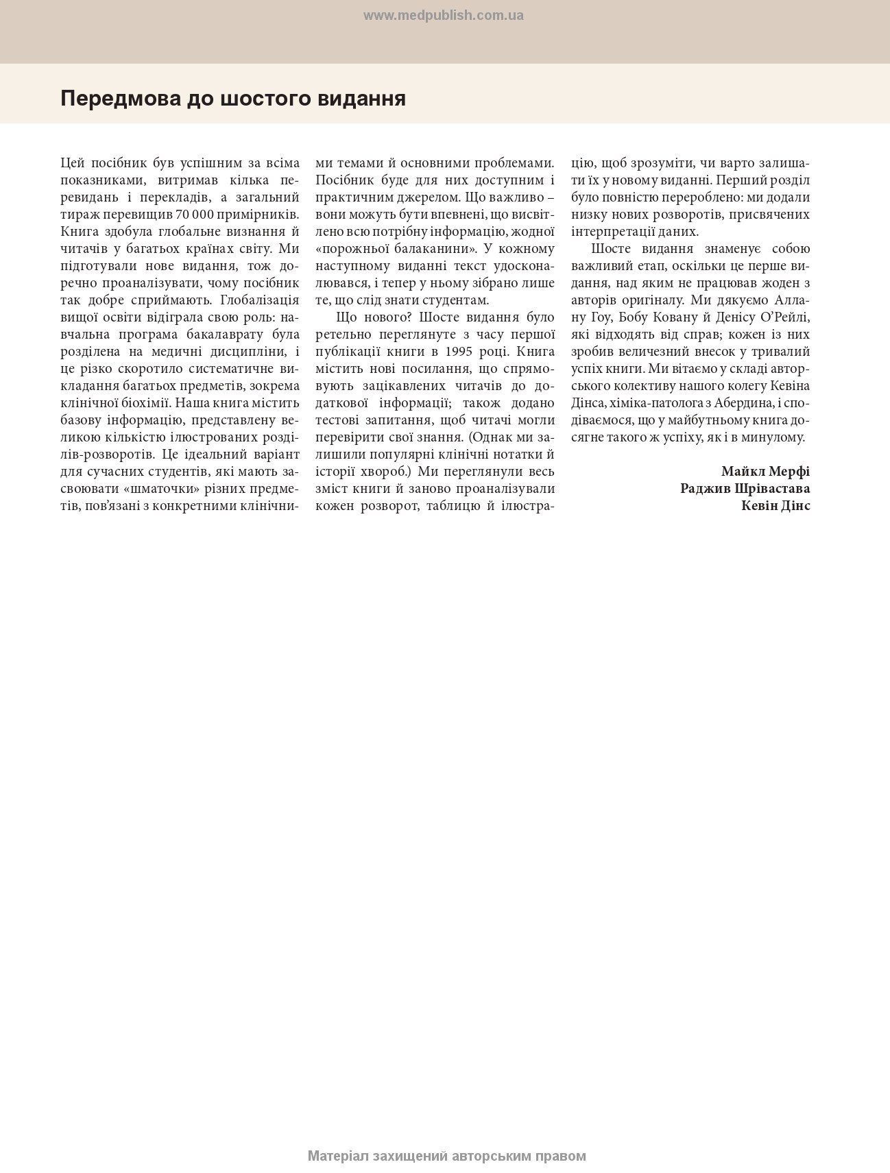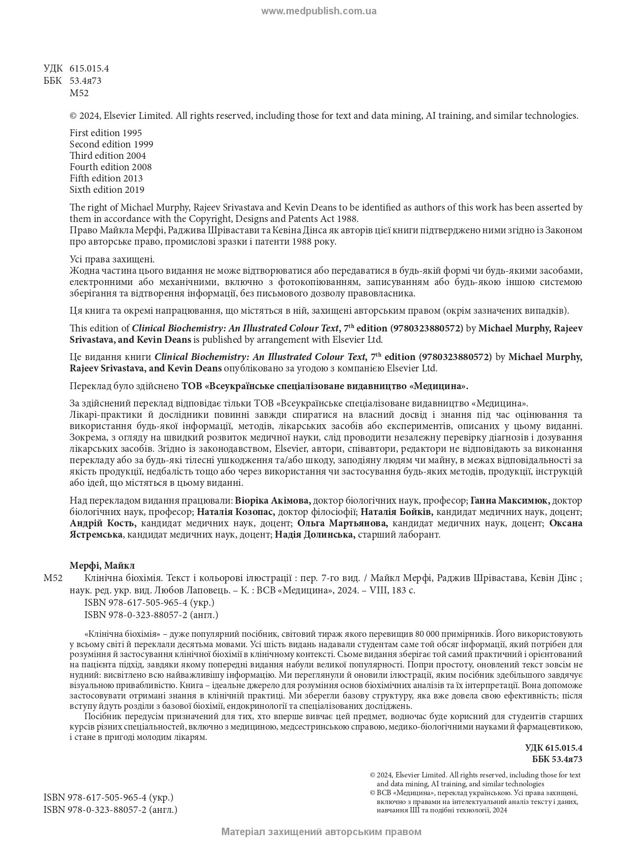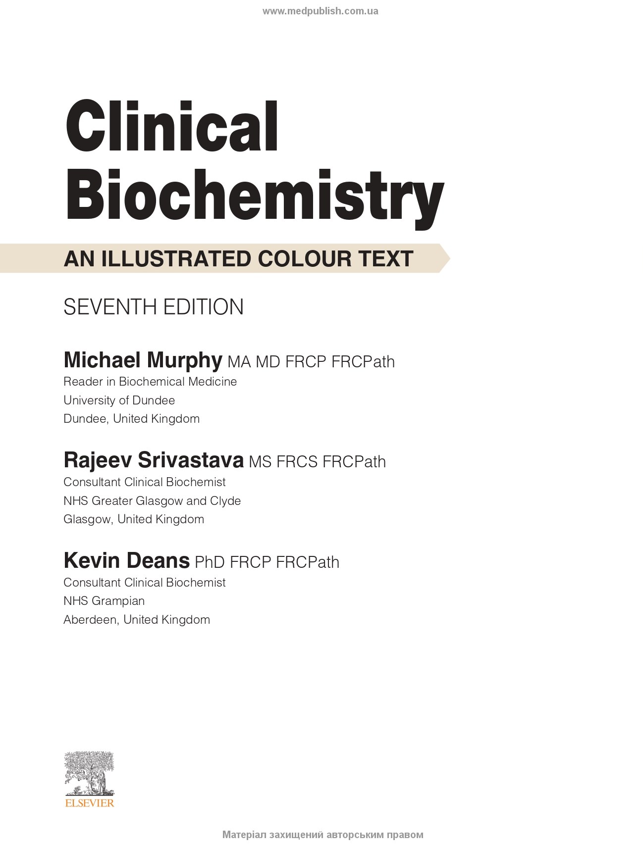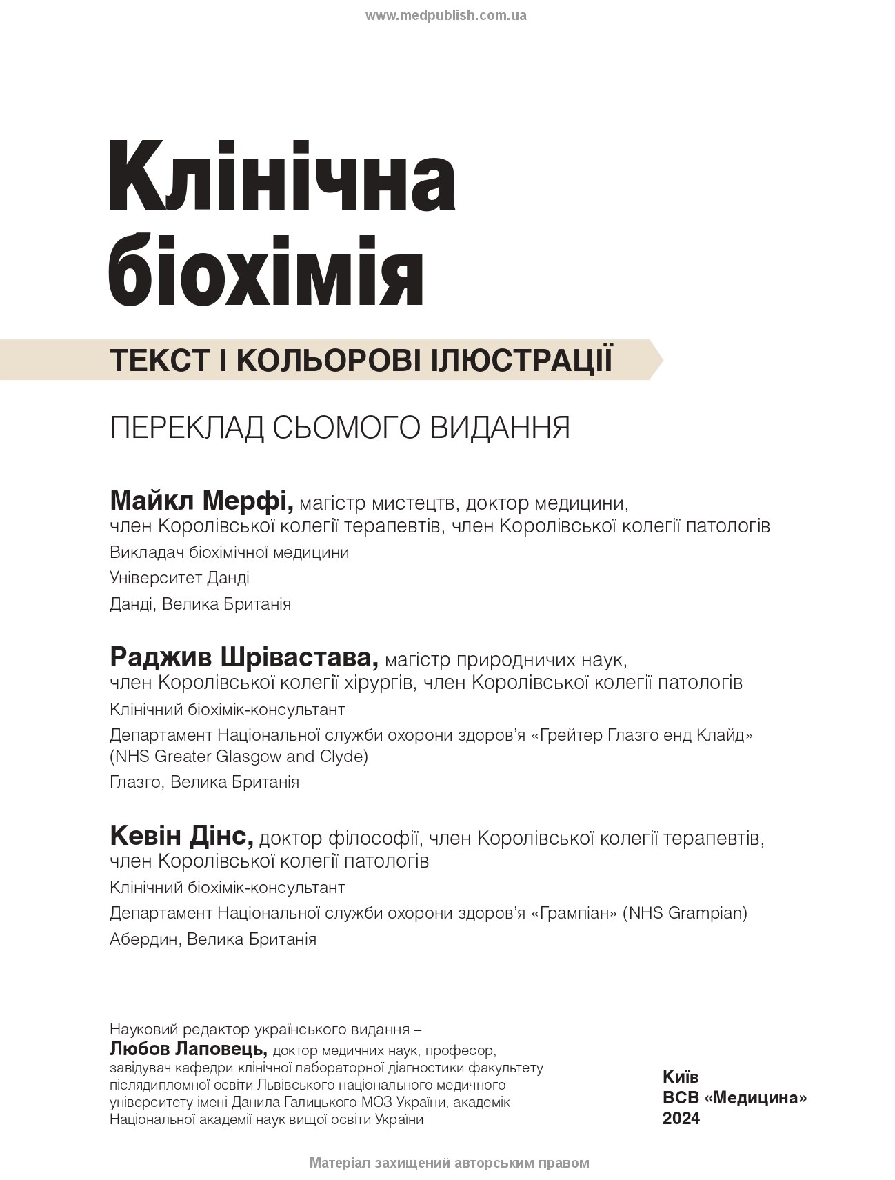«Клінічна біохімія» – дуже популярний посібник, світовий тираж якого перевищив 80 000 примірників. Його використовують у всьому світі й переклали десятьма мовами. Усі шість видань надавали студентам саме той обсяг інформації, який потрібен для розуміння й застосування клінічної біохімії в клінічному контексті. Посібник передусім призначений для тих, хто вперше вивчає цей предмет, але також підходить для студентів старших курсів різних спеціальностей, включно з медициною, медсестринською справою, медико-біологічними науками й фармацевтикою, і стане в пригоді молодим лікарям.