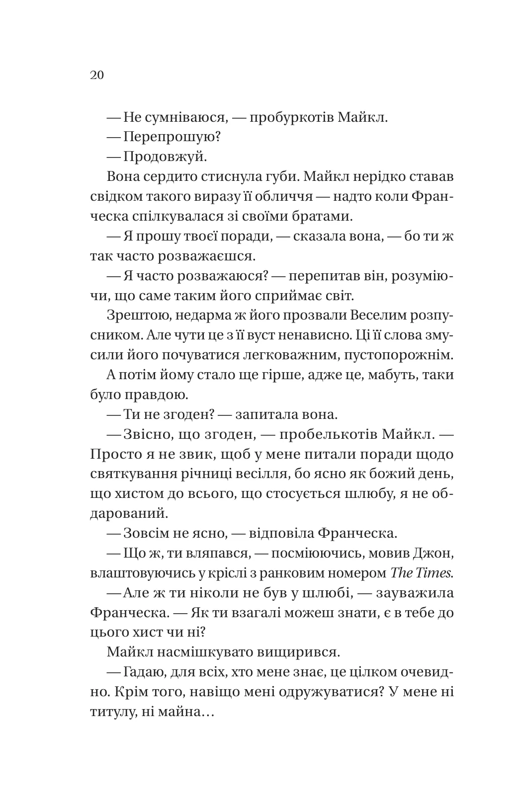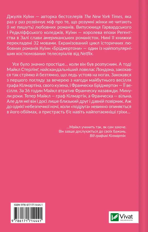 Усе було значно простіше... коли він був розпусним. А тоді Майкл Стерлінґ, найскандальніший ловелас Лондона, закохався так стрімко й безтямно, що ледь устояв на ногах. Закохався з першого погляду за вечерею з нагоди майбутнього весілля графа Кілмартіна, свого кузена, і Франчески Бріджертон — ЇЇ весілля. За 36 годин Майкл втратив Франческу назавжди. Минули роки. Тепер Майкл — граф Кілмартін, а Франческа — вільна. Але для неї він і досі лише близький друг і давній повірник. Аж до однієї небезпечної ночі, коли «подруга» невинно опиняється в його обіймах, а пристрасть б’є навіть найпотаємніші гріхи...
