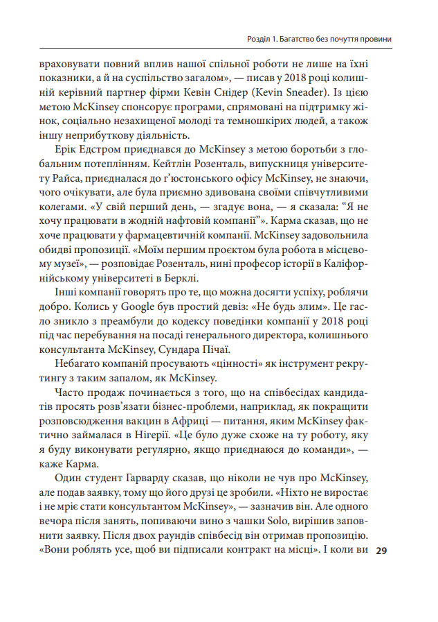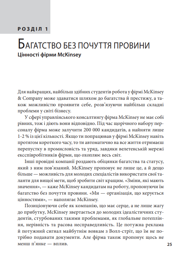 Публіцистична книга американських журналістів Волта Богданича та Майкла Форсайта, що є бестселером 2022 р. за версіями Forbes та New York Times, містить вибухове викриття найпрестижнішої консалтингової компанії у світі — McKinsey. Ця впливова фірма заробляє мільярди, консультуючи майже всі великі корпорації, а також уряди багатьох країн, зокрема Великобританії, США та Китаю, які звертаються до неї, щоб максимізувати свої прибутки та підвищити ефективність. Захищена угодами про нерозголошення, її діяльність досі залишалася значною мірою секретною. Однак, спираючись на численні документи та свідчення, автори цього журналістського розслідування змальовують реальний портрет легендарної фірми, чиї дії часто суперечили моральним принципам і робили світ більш нерівним, корумпованим та небезпечним.