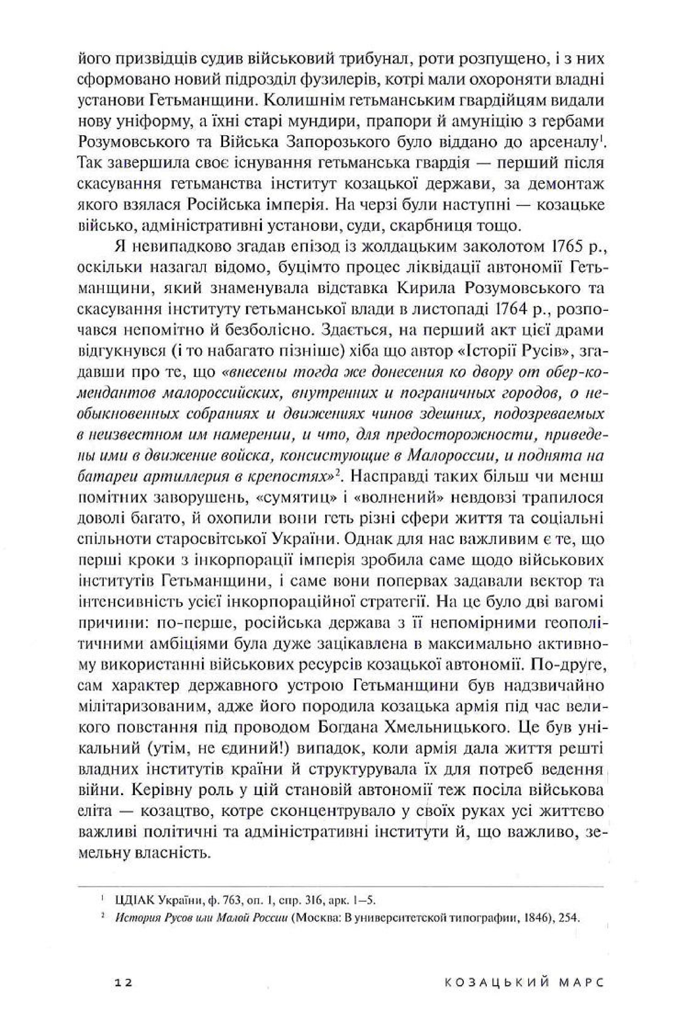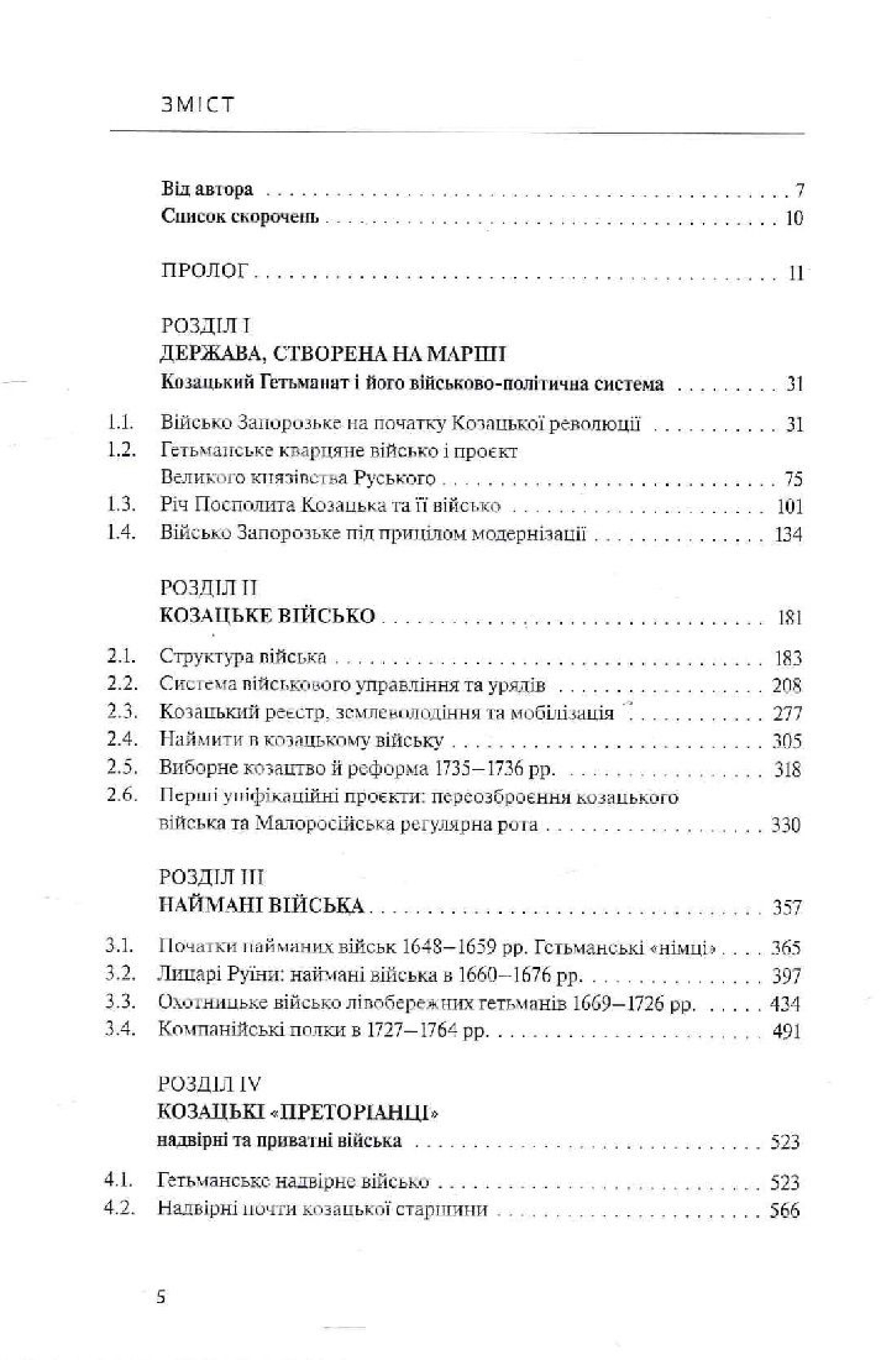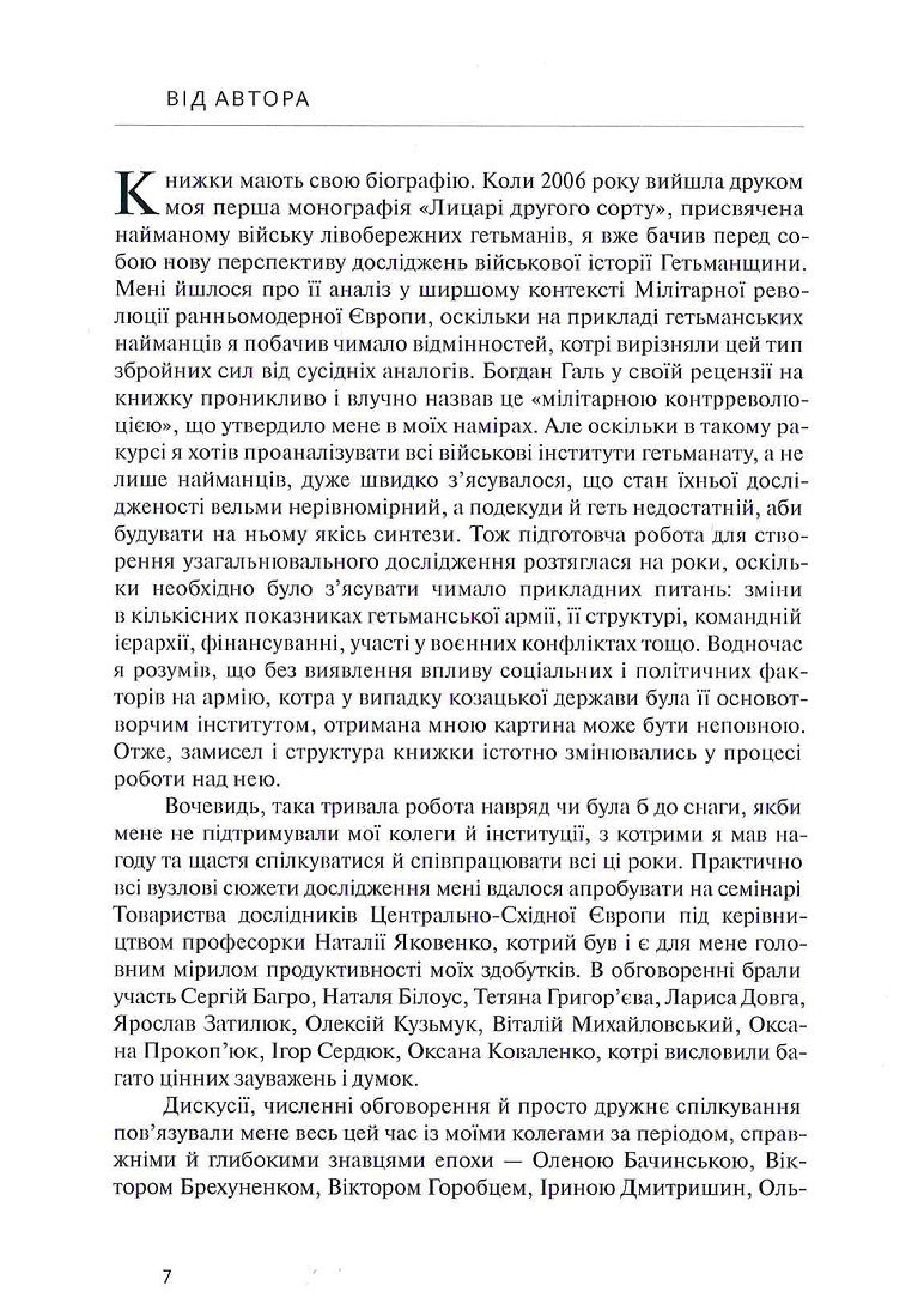 Книжку присвячено армії Козацького Гетьманату — інституту, котрий породив і сформував козацьку державу в середині XVII ст. У фокусі уваги дослідження головні елементи гетьманської армії (козацьке ополчення, наймані формування, приватні війська), історичний розвиток яких розглянуто в тісному зв’язку з політичним устроєм, соціальною структурою й економікою. Автор намагається з’ясувати, яким чином зміни у військовій сфері, спричинені пертурбаціями в геополітиці та перебігом Мілітарної революції, впливали на військово-політичну модель Гетьманщини.