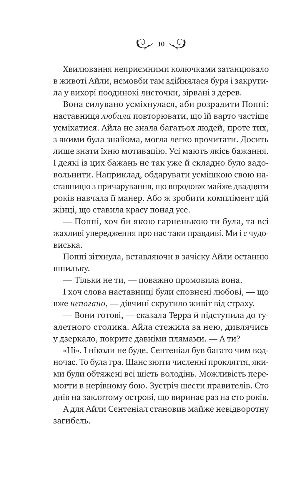 Ласкаво просимо на Сентеніал! Раз на сто років на острові Лайтларк відбувається Сентеніал — смертельна гра для правителів шести володінь. Сто днів на острові — це останній шанс зняти прокляття, які століттями переслідували їхні народи. Кожному правителю є що приховувати й за що боротися. Але один із них муситиме померти… Айла Краун — молода правителька Дикого володіння. На її народ впало подвійне прокляття — його представники мали вбивати тих, у кого закохувалися, і харчуватися лише людськими серцями. Відтак вони перетворилися на прекрасних чудовиськ, що володіли підступною силою спокушати з першого погляду. Любов стала забороненою, а войовниці цього народу викликали страх і ненависть. Щоб вижити й перемогти на Сентеніалі, Айла готова брехати й зраджувати. Але кохання все ускладнює.